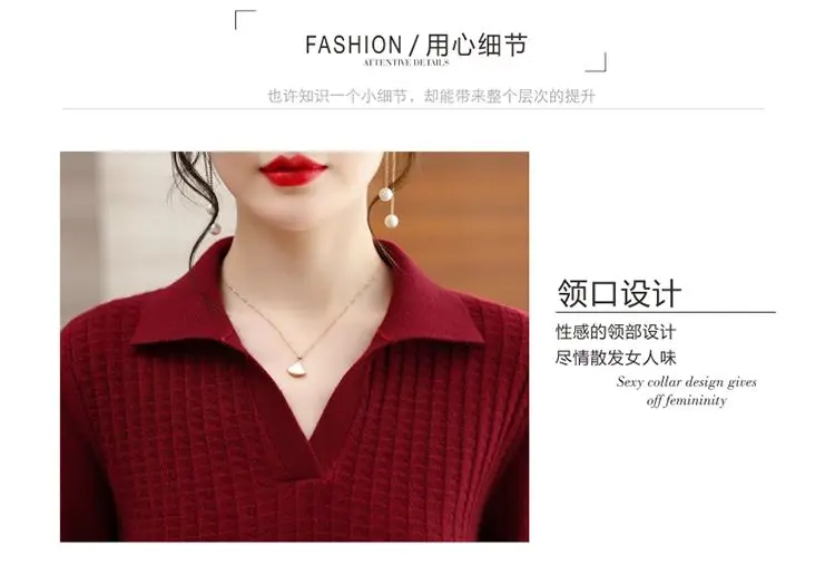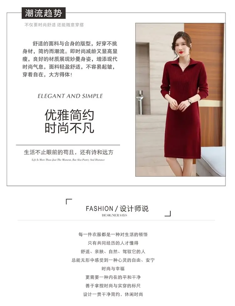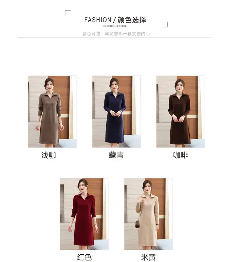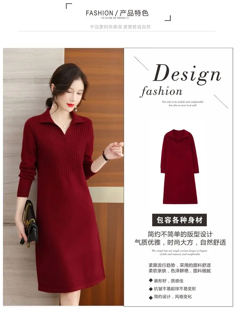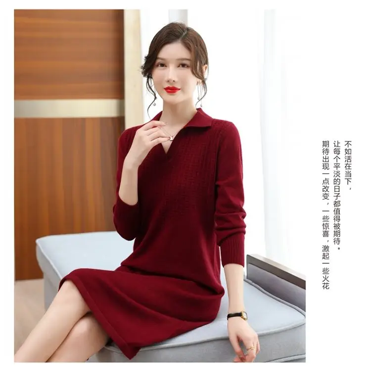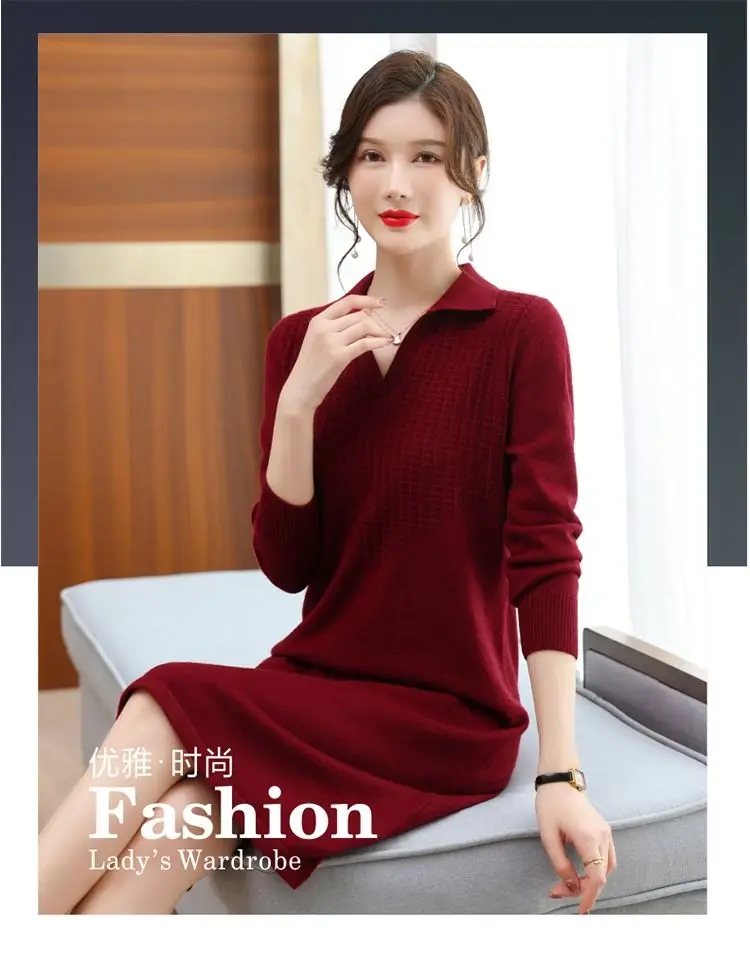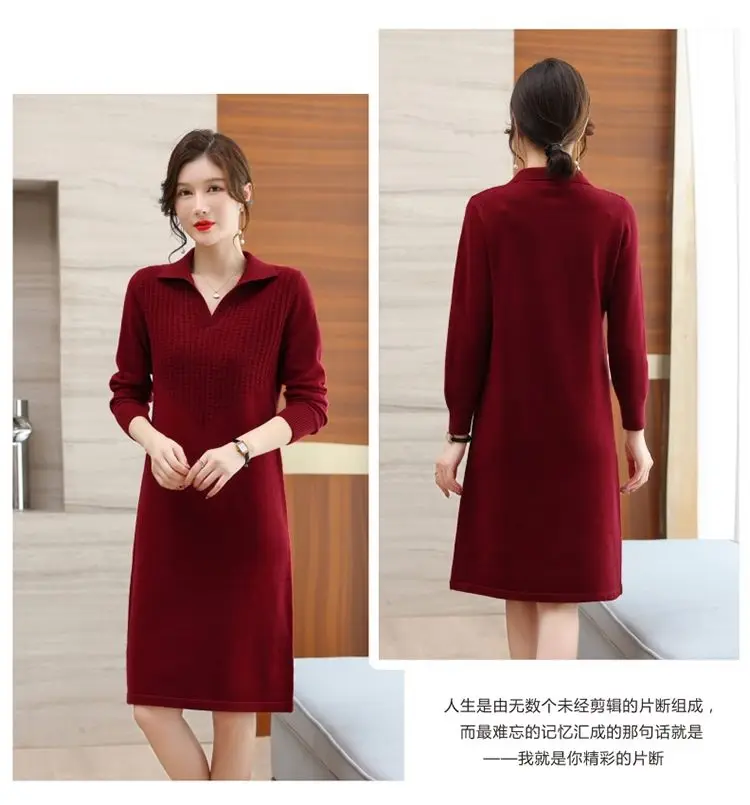 Abito maglione al ginocchio alla moda con risvolto da donna autunnale, temperamento allentato, gonna inferiore in maglia dritta tinta unita