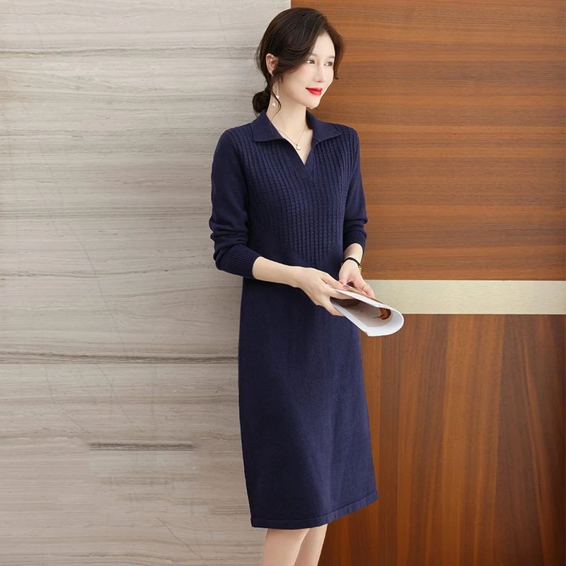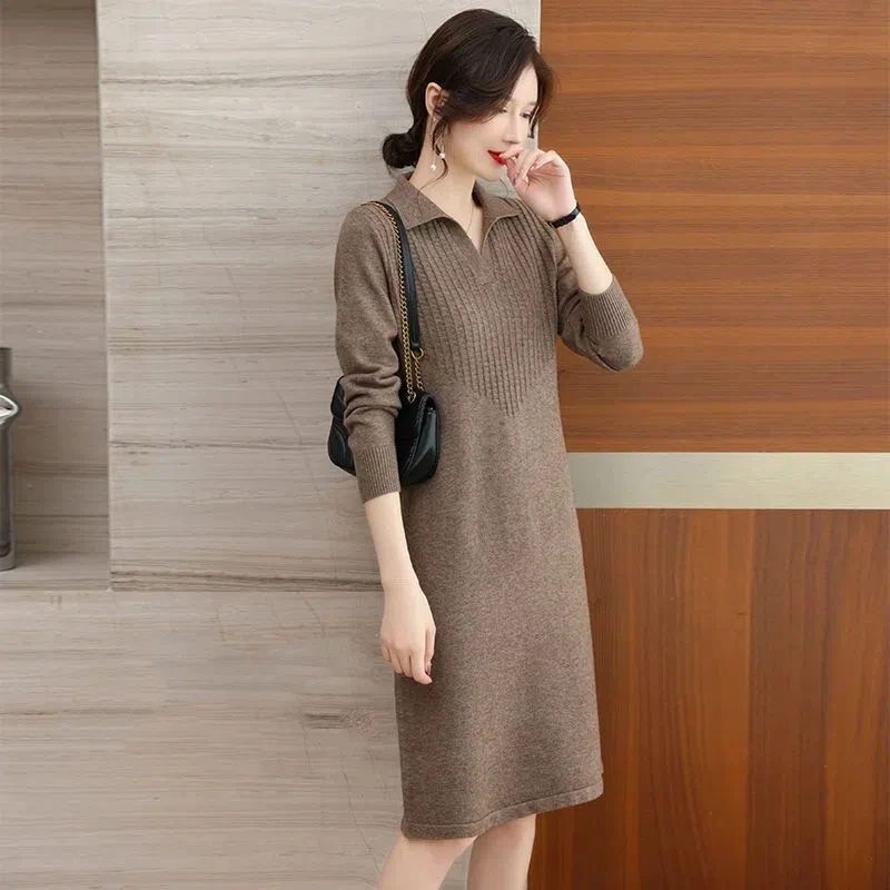 Abito maglione al ginocchio alla moda con risvolto da donna autunnale, temperamento allentato, gonna inferiore in maglia dritta tinta unita