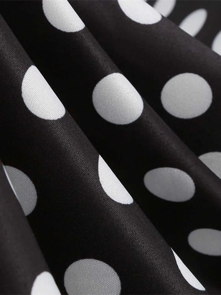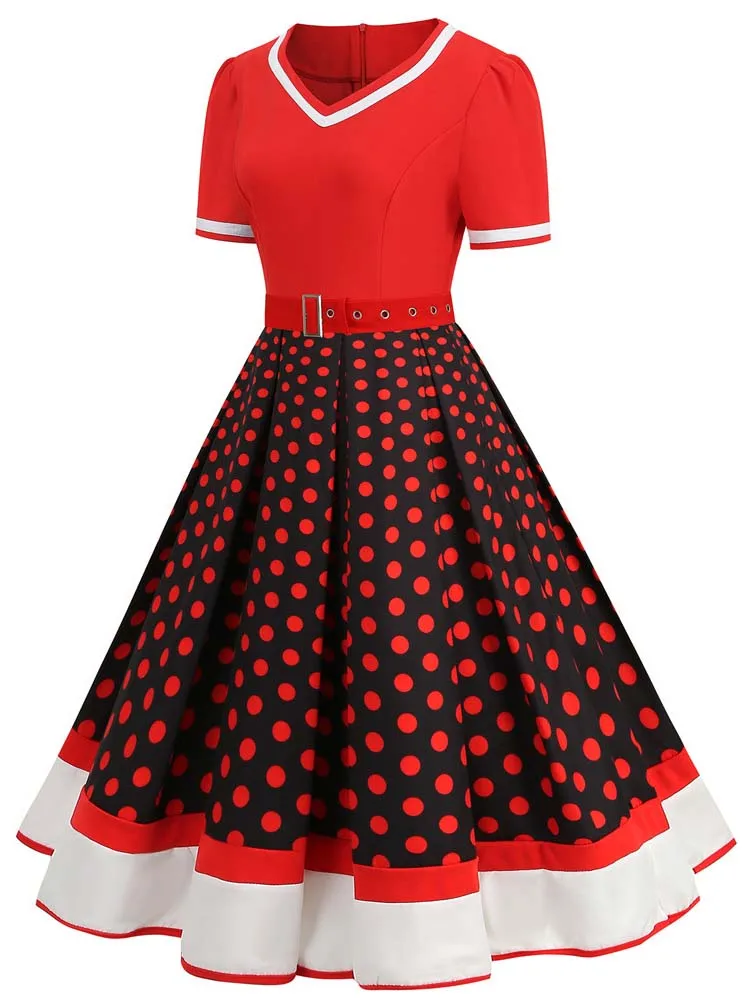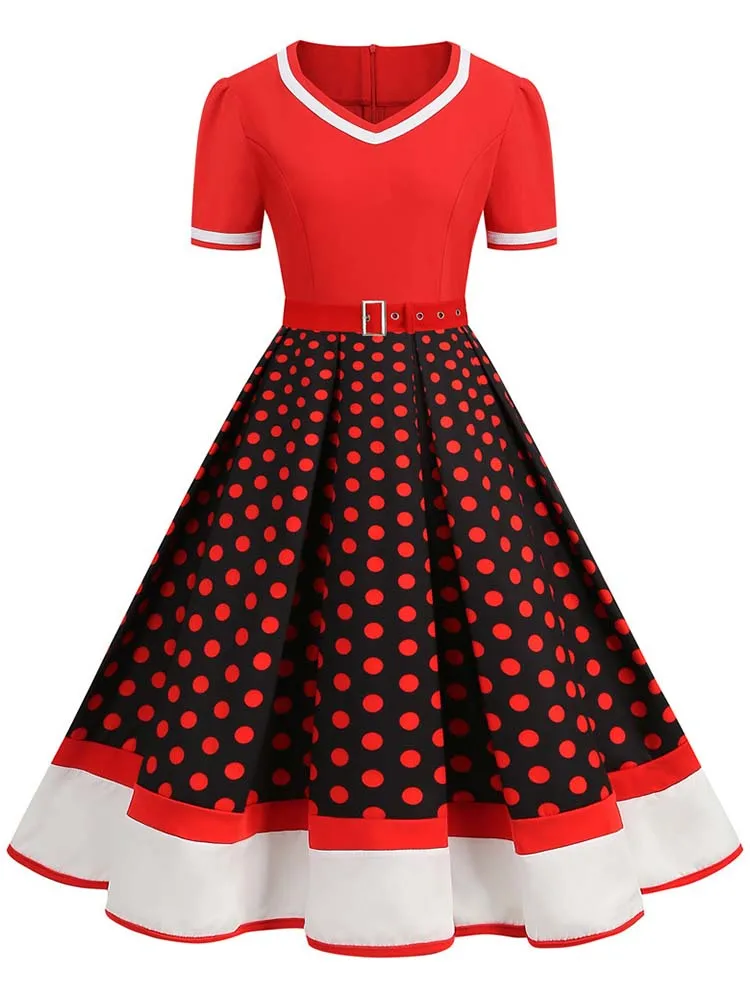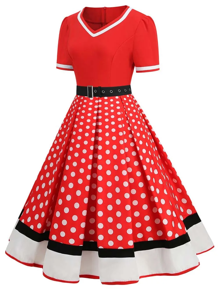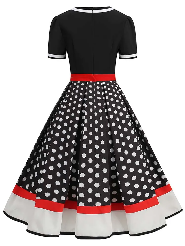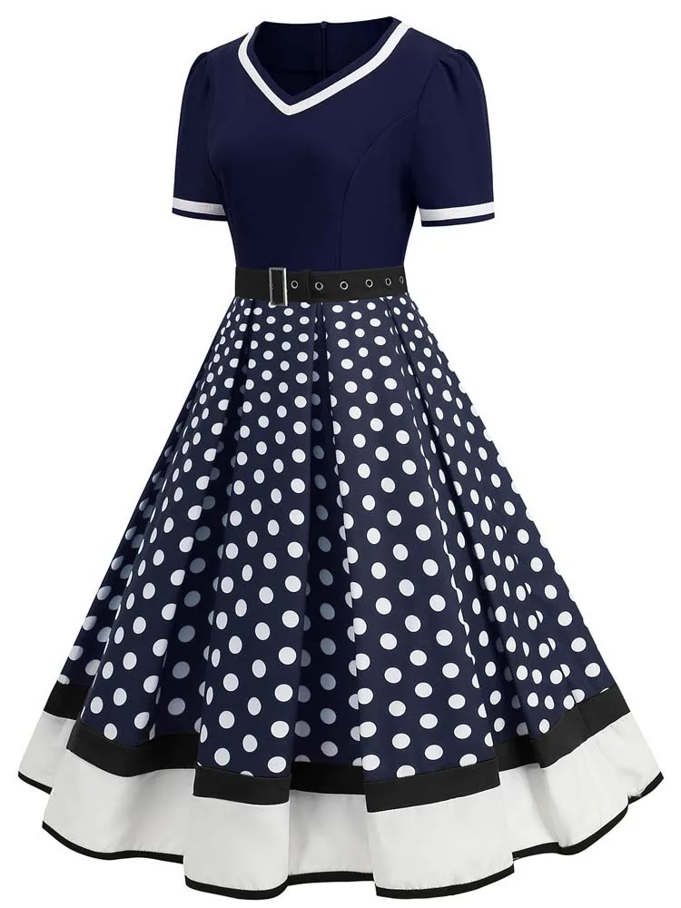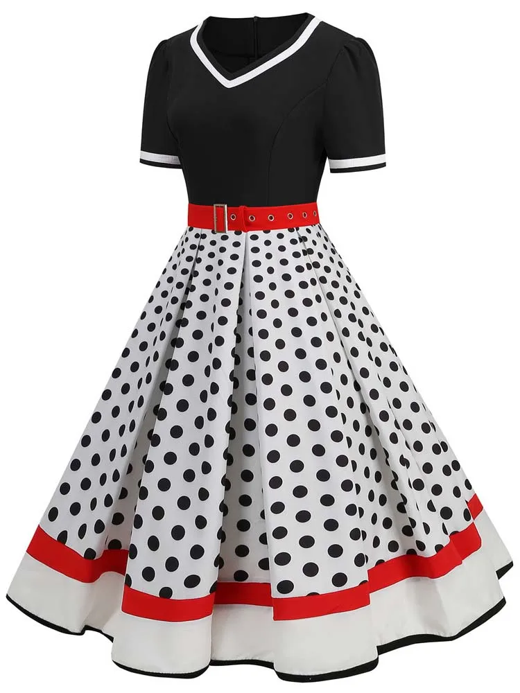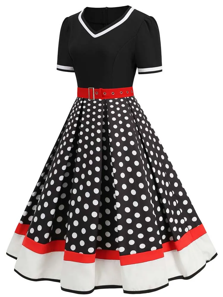 Abito plissettato vintage a maniche corte con scollo a V nero con cintura Abito da donna a pois anni ’50 Abito estivo taglie forti