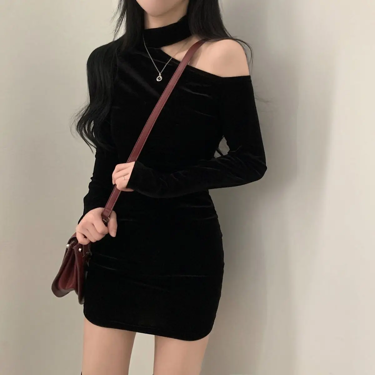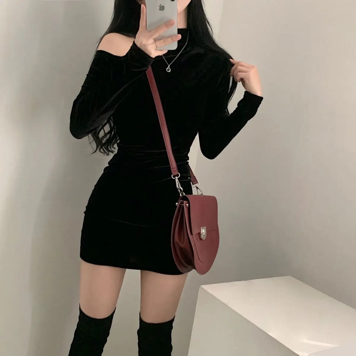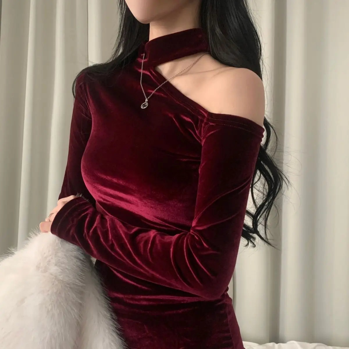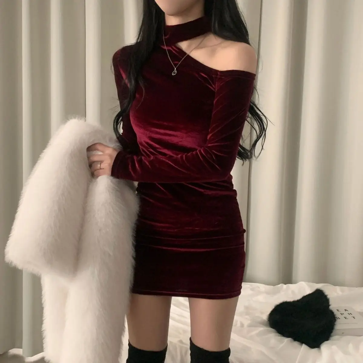 Abito rosso in velluto dorato nuovo autunno e inverno da donna a linea intera Hot Girl Nuova gonna slim a maniche lunghe
