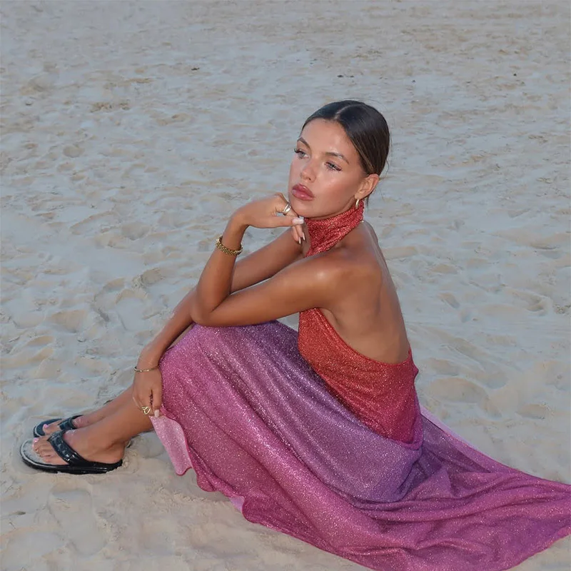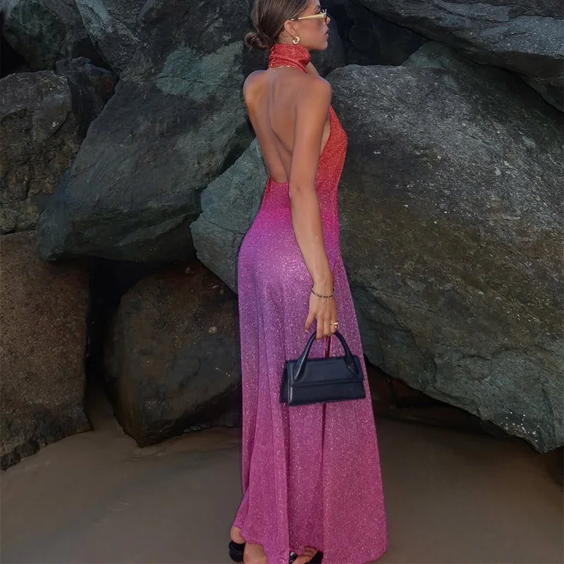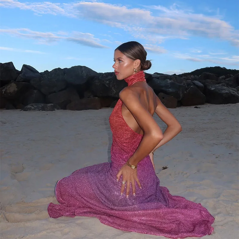 Abito sexy con spacco laterale lucido Abito da donna elegante senza maniche con schienale all’anca 2025 Abiti da festa di colore estivo da donna