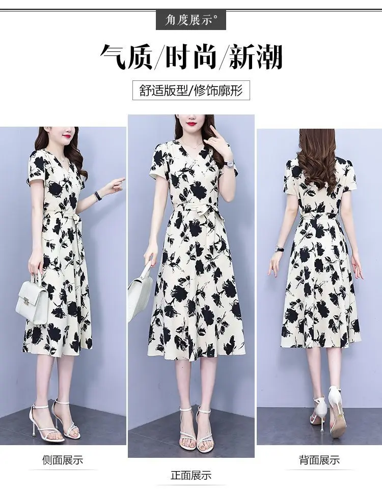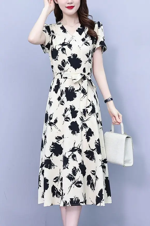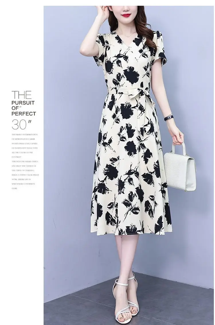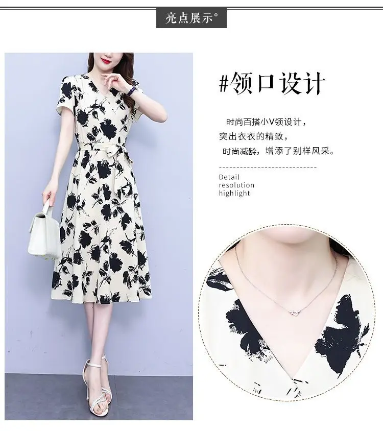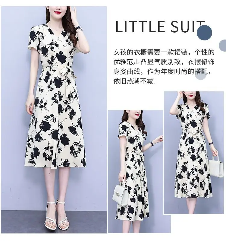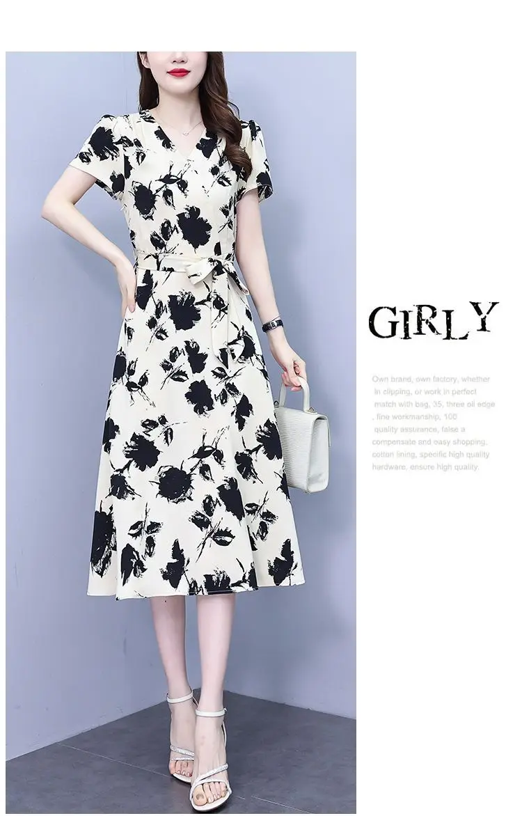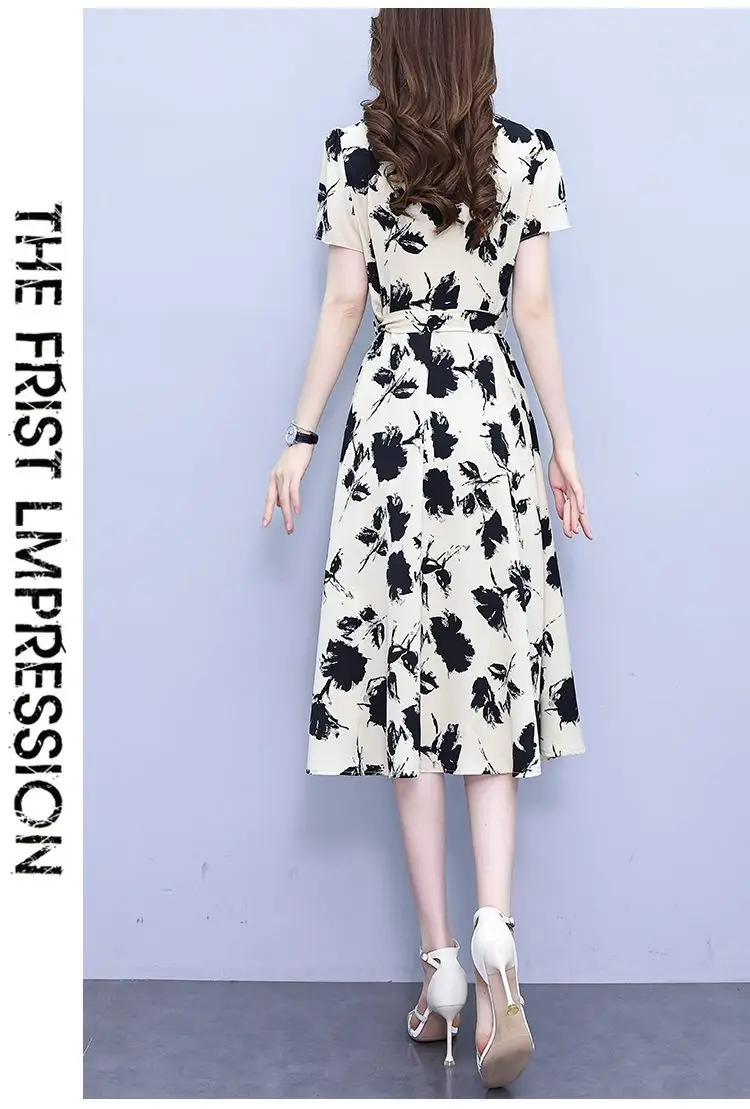Abito stampato a maniche corte a maniche corte definito in vita di media lunghezza elegante stile maturo