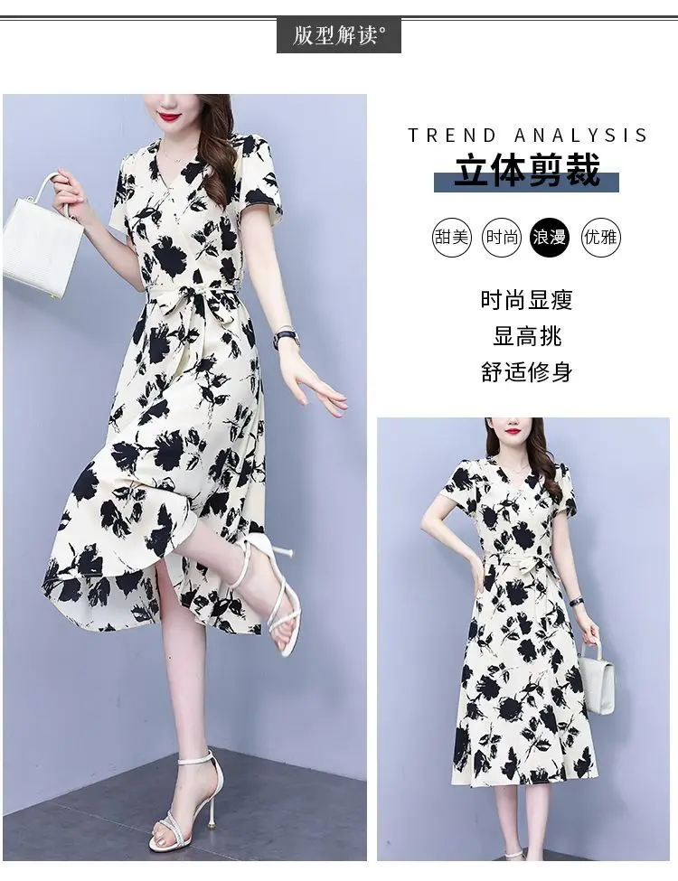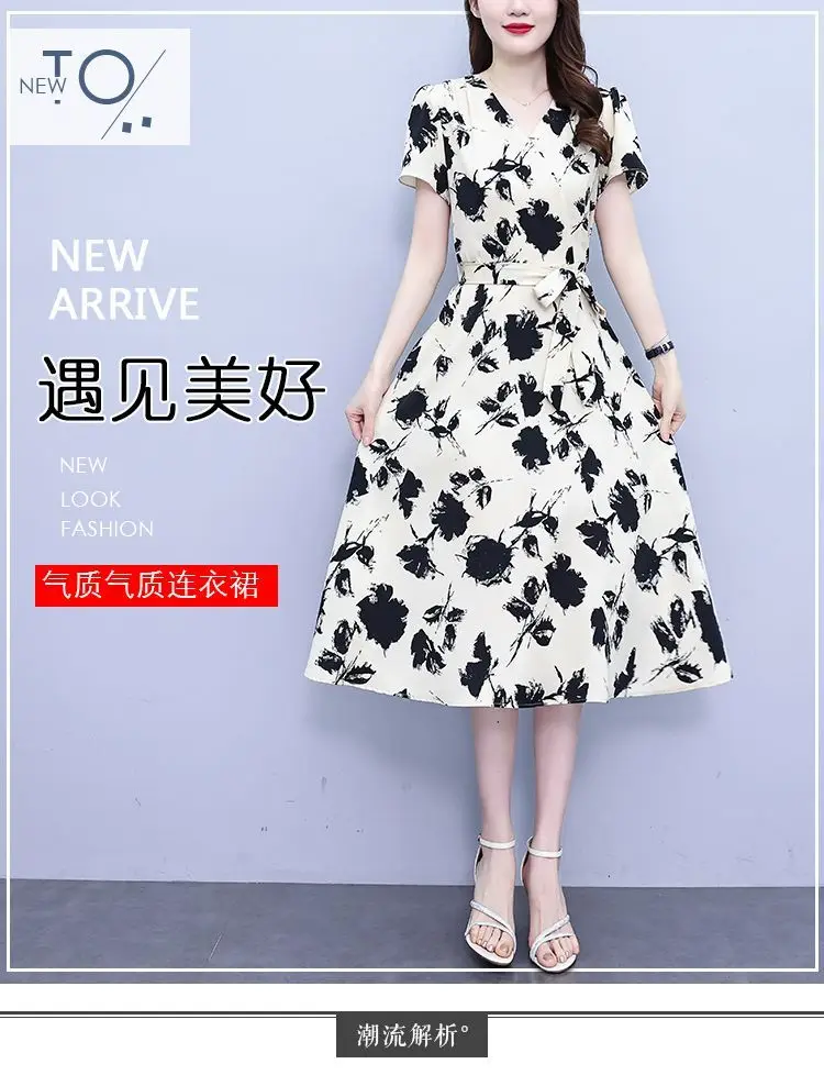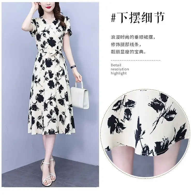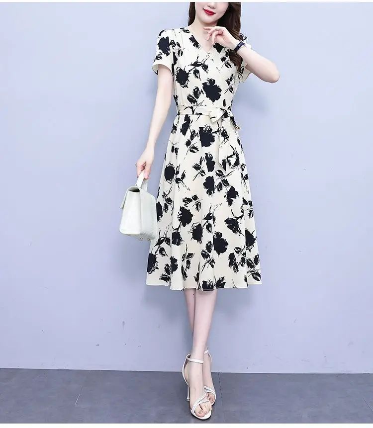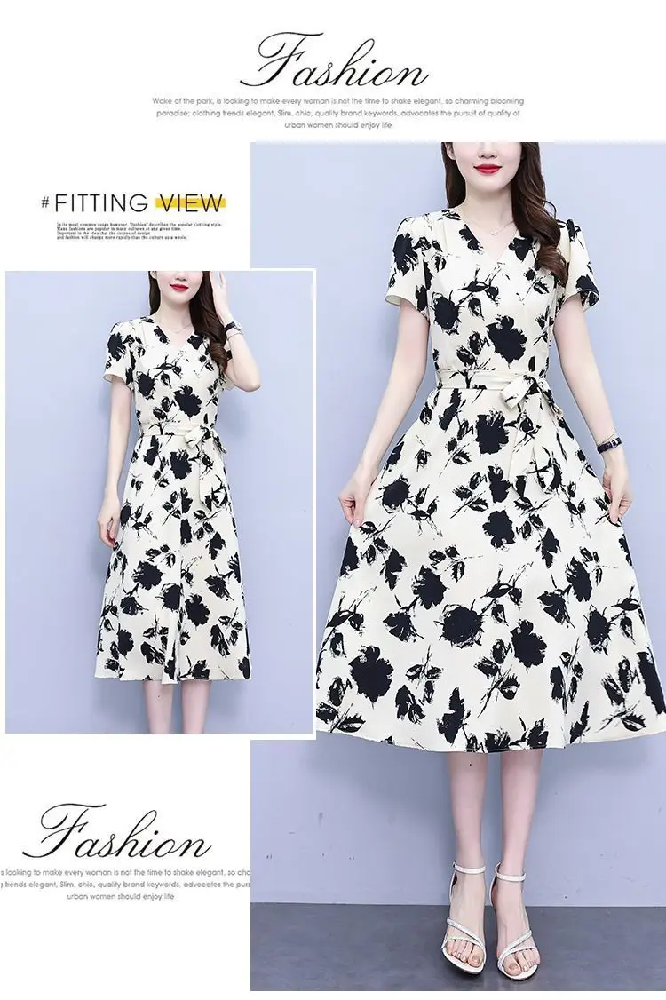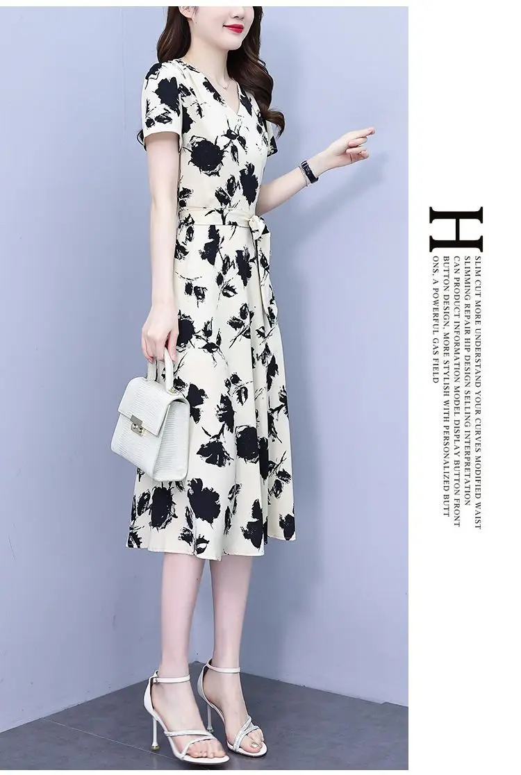 Abito stampato a maniche corte a maniche corte definito in vita di media lunghezza elegante stile maturo