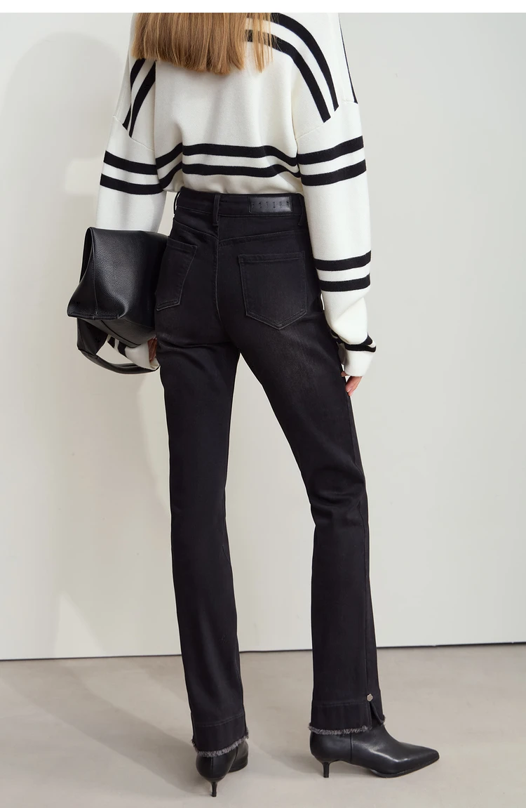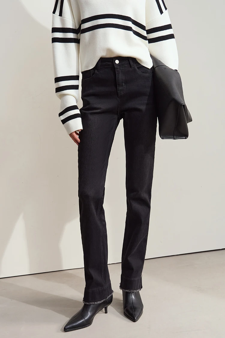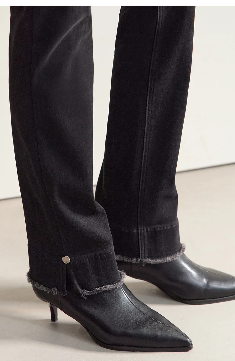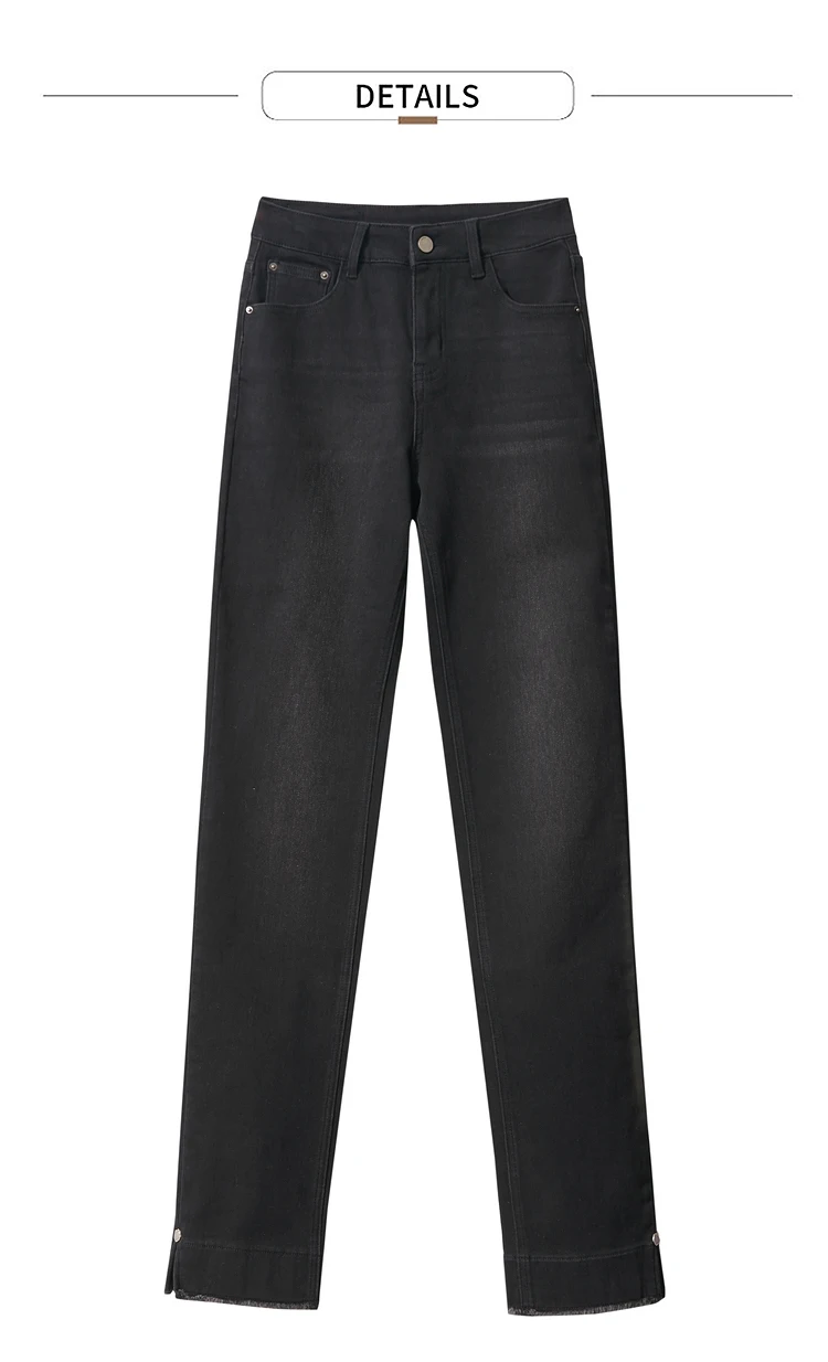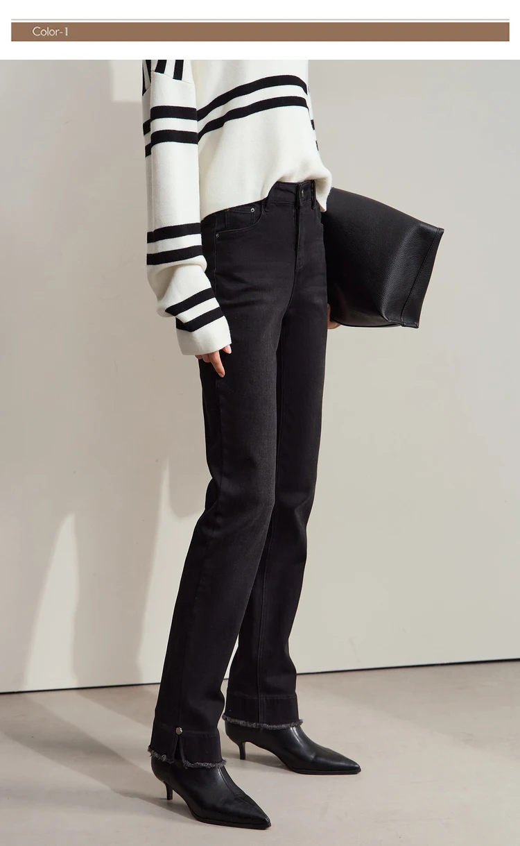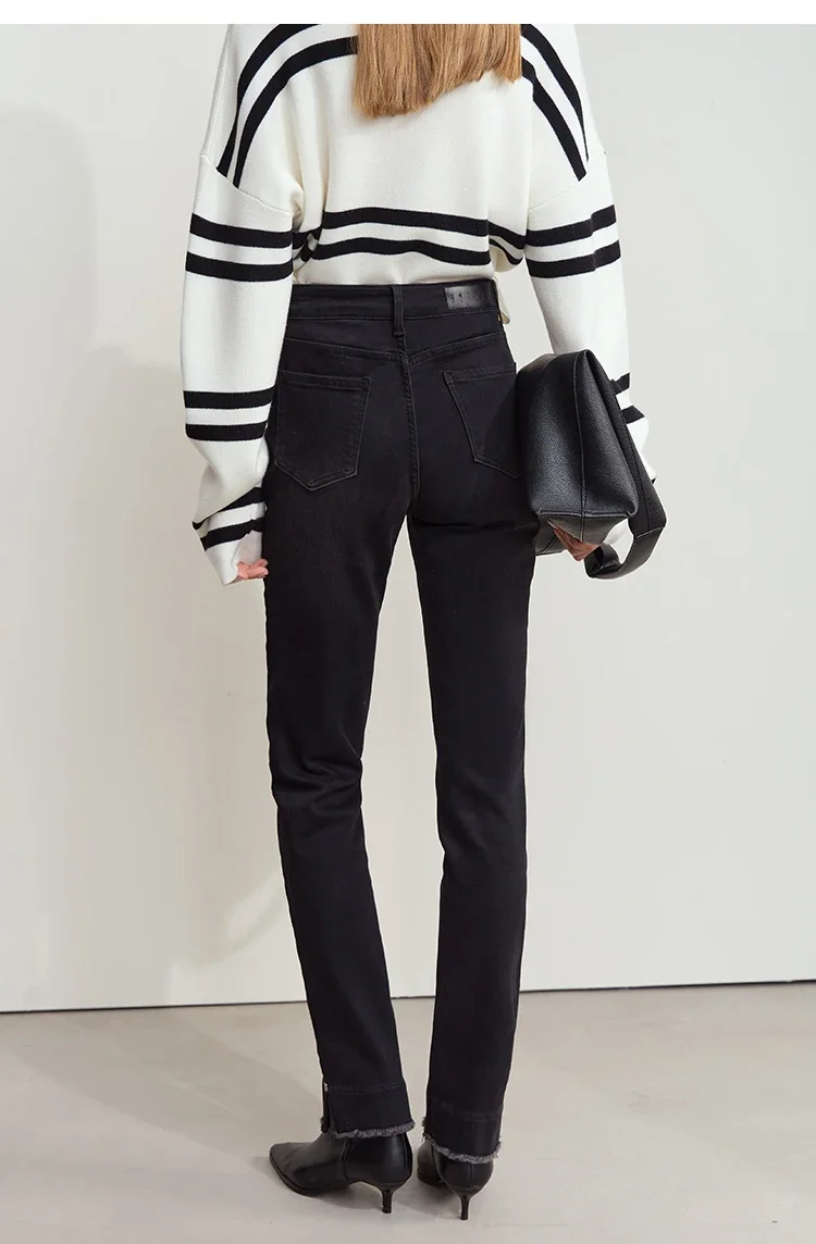 AMII Minimalista 2025 Nuovi Jeans Slim Abbigliamento Donna Casual Bordo Ruvido Lucido Diviso Piedi Stretti Inverno Pantaloni Neri 12444148