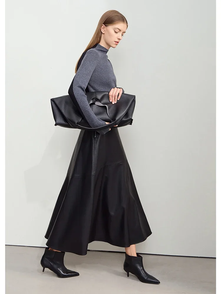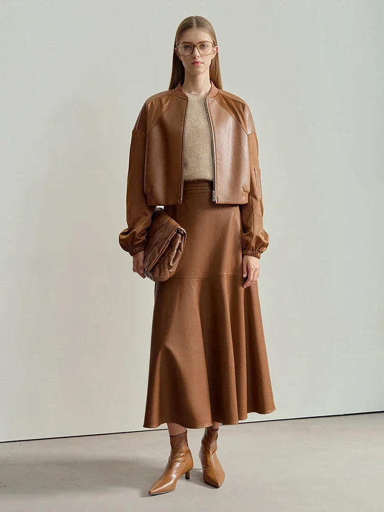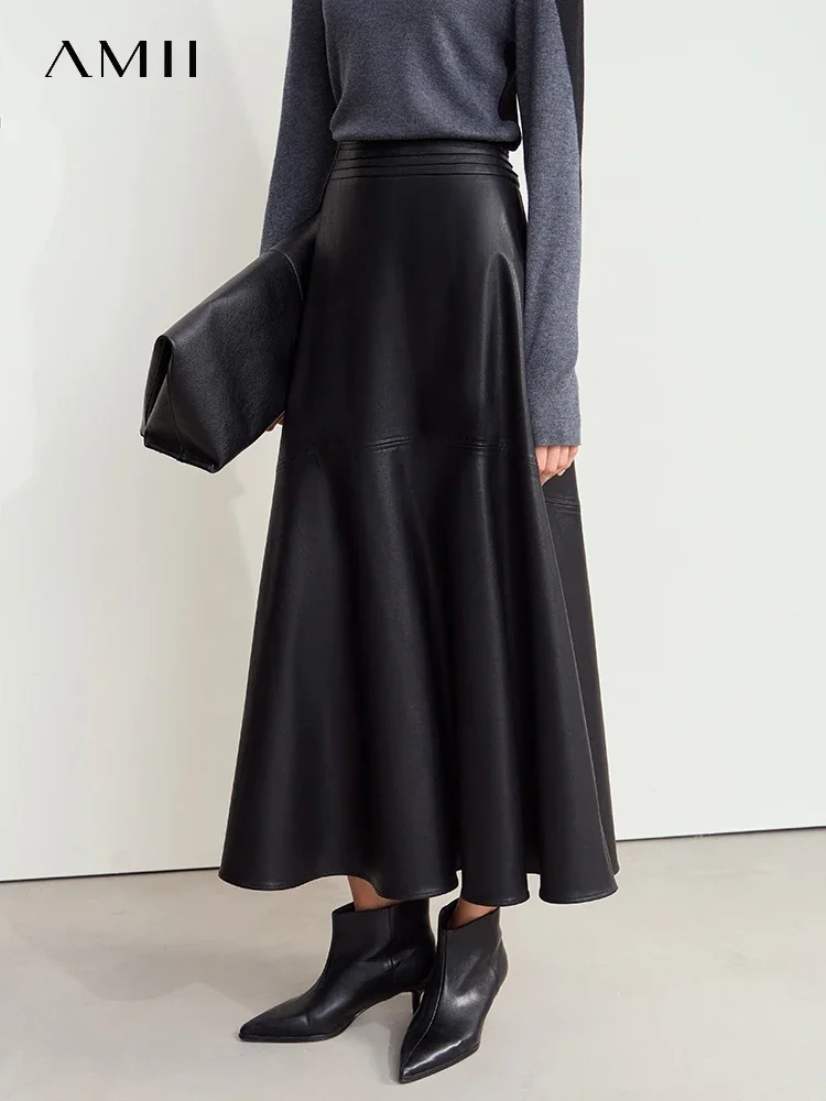 AMII Minimalista Elegante Pendolare Ecologico PU Gonna di Pelle 2024 Inverno delle Nuove Donne Allentato A forma di Gonna 12444181