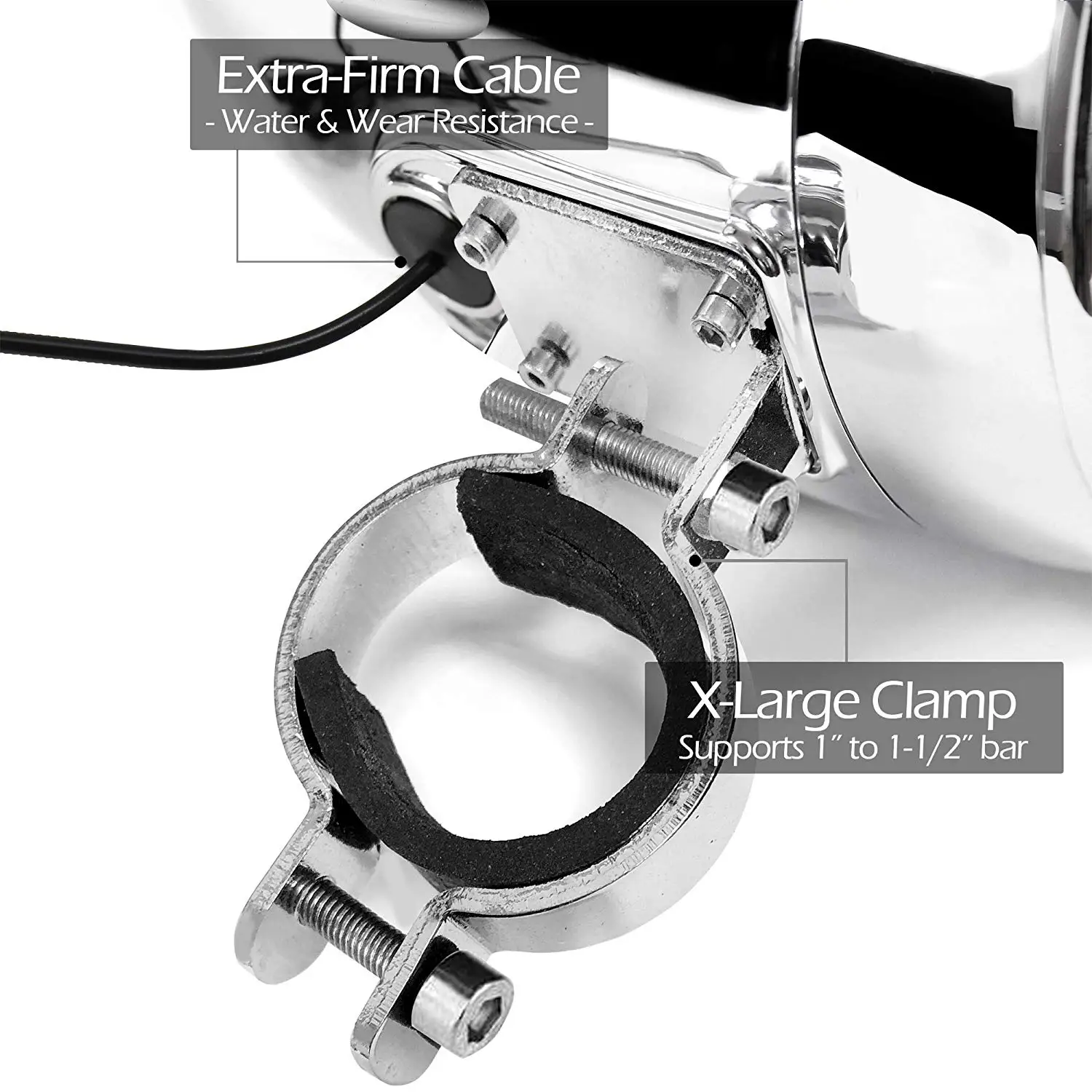 ◆Max 1000W Amplifier 4 Channel 4" Full Range Motorcycle ATV UTV Stereo Speakers with High-Performance Bass. Included New X-Large Mounting Clamp supports 1 to 1.5" bar size. Compatible with Ape Hanger and crash bar with 1-1/2" bar diameter.