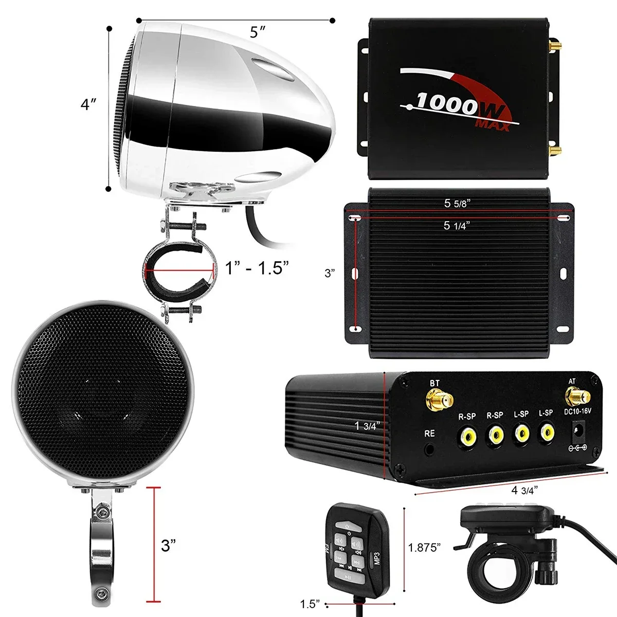◆Max 1000W Amplifier 4 Channel 4" Full Range Motorcycle ATV UTV Stereo Speakers with High-Performance Bass. Included New X-Large Mounting Clamp supports 1 to 1.5" bar size. Compatible with Ape Hanger and crash bar with 1-1/2" bar diameter.
