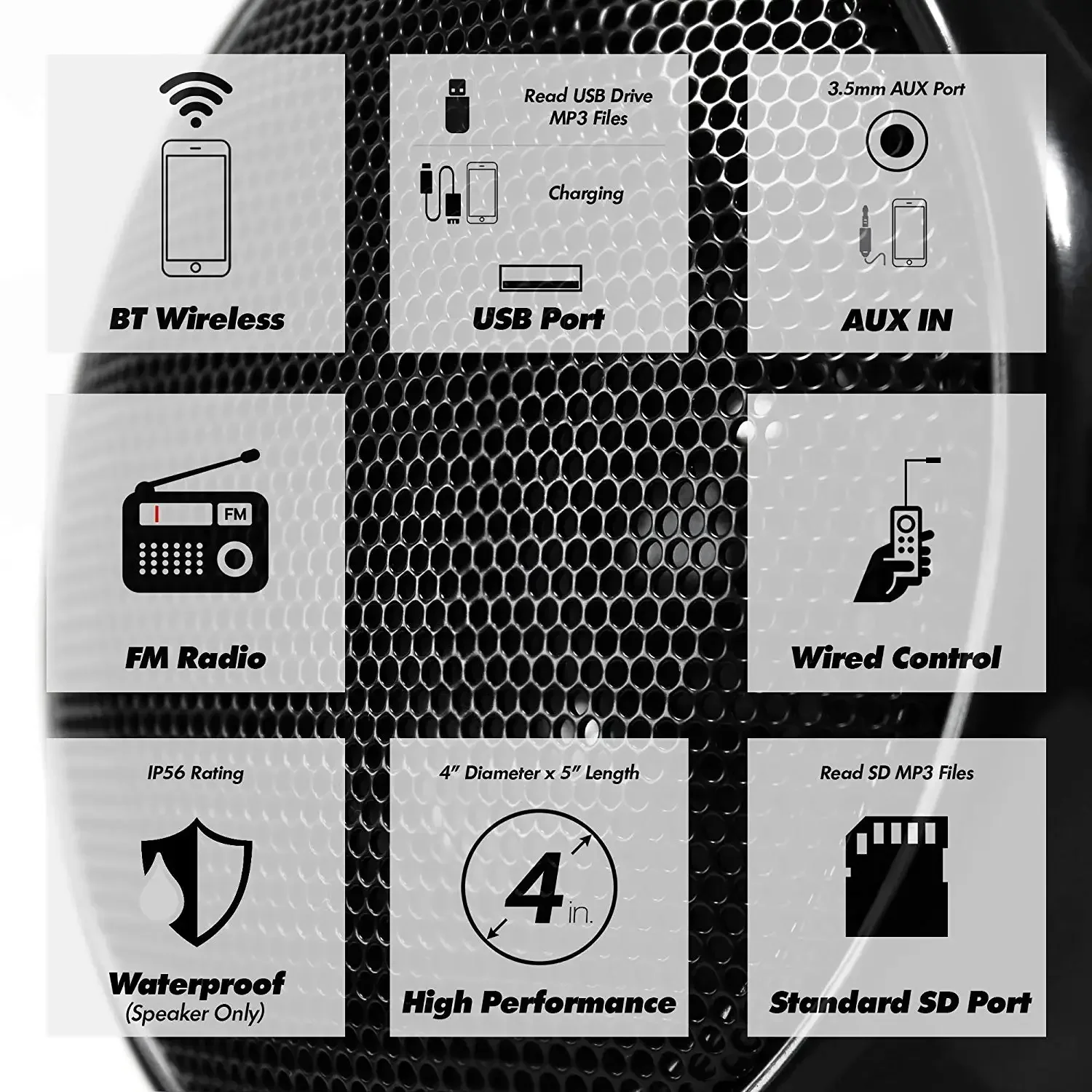 ◆Superb Crystal Sound Quality. Advanced IP56 Waterproof Design(Speaker Only). Great for outdoor use. Included full function wired control. Included 2x External Antenna for Bluetooth and FM Radio. Easy Installation: Comes with all necessary hardware and wiring. Plug and Play. Standard 12V Power Connection.