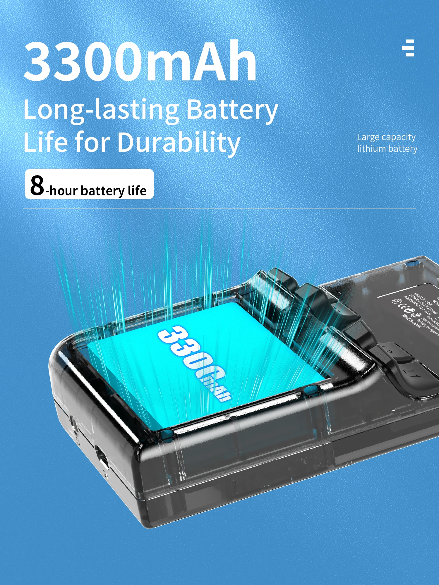 Batteria: batteria ai polimeri di litio 3300mAh, durata 8 ore