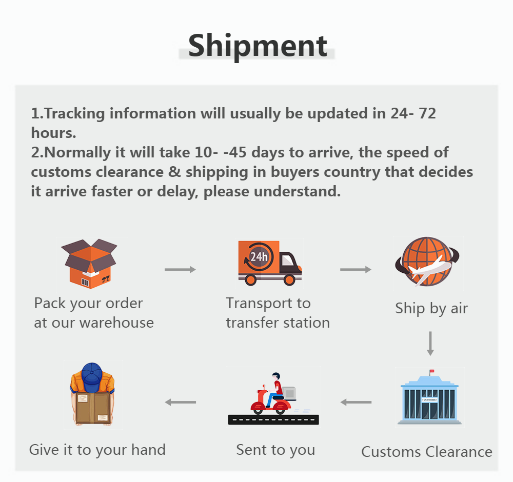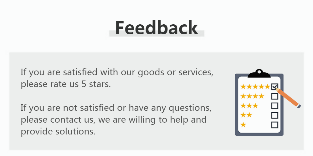 Dopo le vendite: la nostra azienda si concentrata sulla qualità del prodotto e del servizio post-vendita. Se hai qualsiasi domanda sull’ordine o la qualità del prodotto, contattare il servizio clienti del negozio per feedback nel tempo e rispondereamo paziente le tue domande.