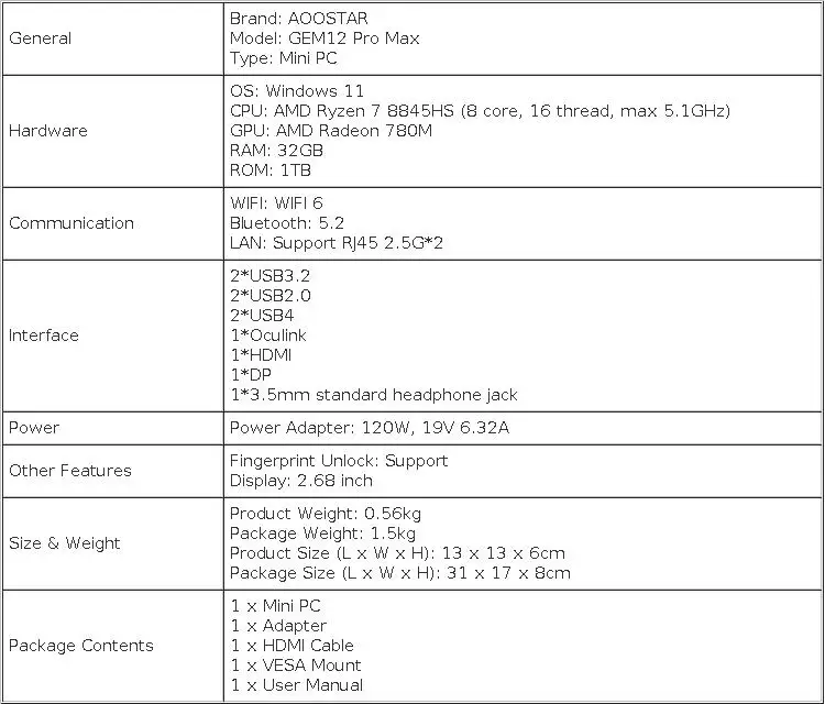AOOSTAR GEM12 Pro Max Mini PC con display, sblocco delle impronte digitali, AMD Ryzen 7 8845HS 8 Core Max 5.1GHz, 32 GB DDR5 RAM SSD da 1 TB, HDMI + DP + 2 * USB4 Quattro schermo, WiFi 6 Bluetooth 5.2, 2 * USB3.2, 2 *USB2.0, 1 * Jack per cuffie LAN 2 * 2.5G
