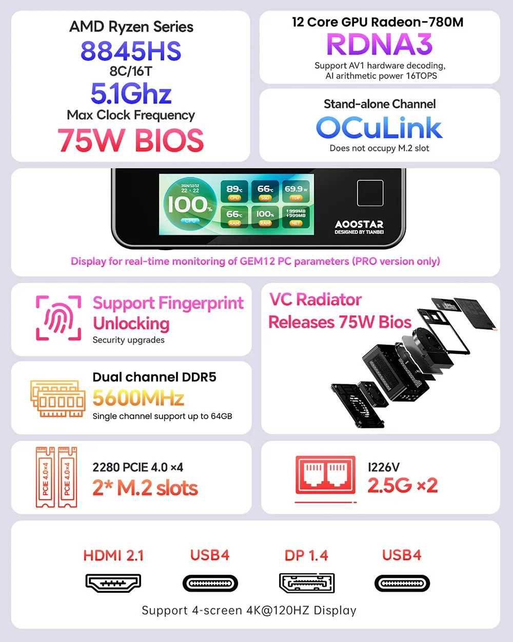 Il mini PC GEM12 Pro Max 8845HS è dotato di una schermata ausiliaria per consentire di monitorare i parametri operativi a qualsiasi momento.È necessario essere utilizzato con l’APP display autodidolante di AOOSTAR.Supporta lo sblocco delle impronte digitali per proteggere efficacemente la sicurezza dei dati del computer.