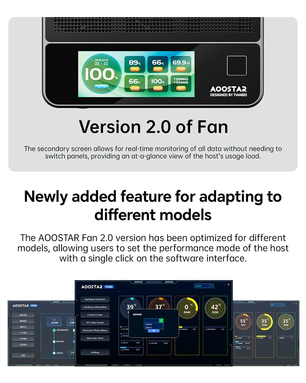 La versione AOOSTAR Fan 2.0 è ottimizzata per diversi modelli.Gli utenti devono fare clic sull’interfaccia software per impostare la modalità performance dell’ospite.