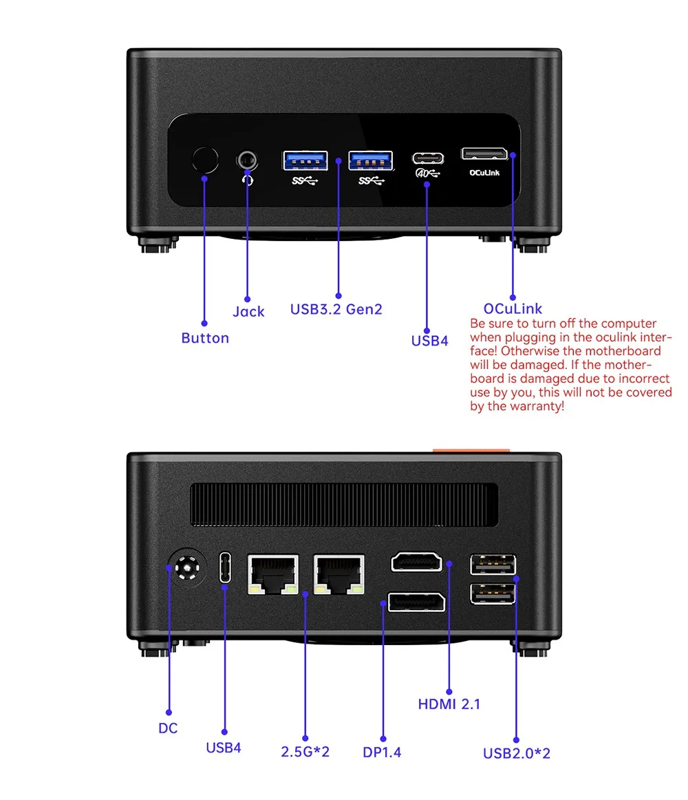 La porta OCULINK (canale indipendente) si collega a EGPU con meno perdita di Thunderbolt 4 e USB4, e non occupa slot M.2 NVME, davvero realizzando un mini PC OCULINK con due slot NVME!Nota: OCULINK non supporta lo scambio a caldo.