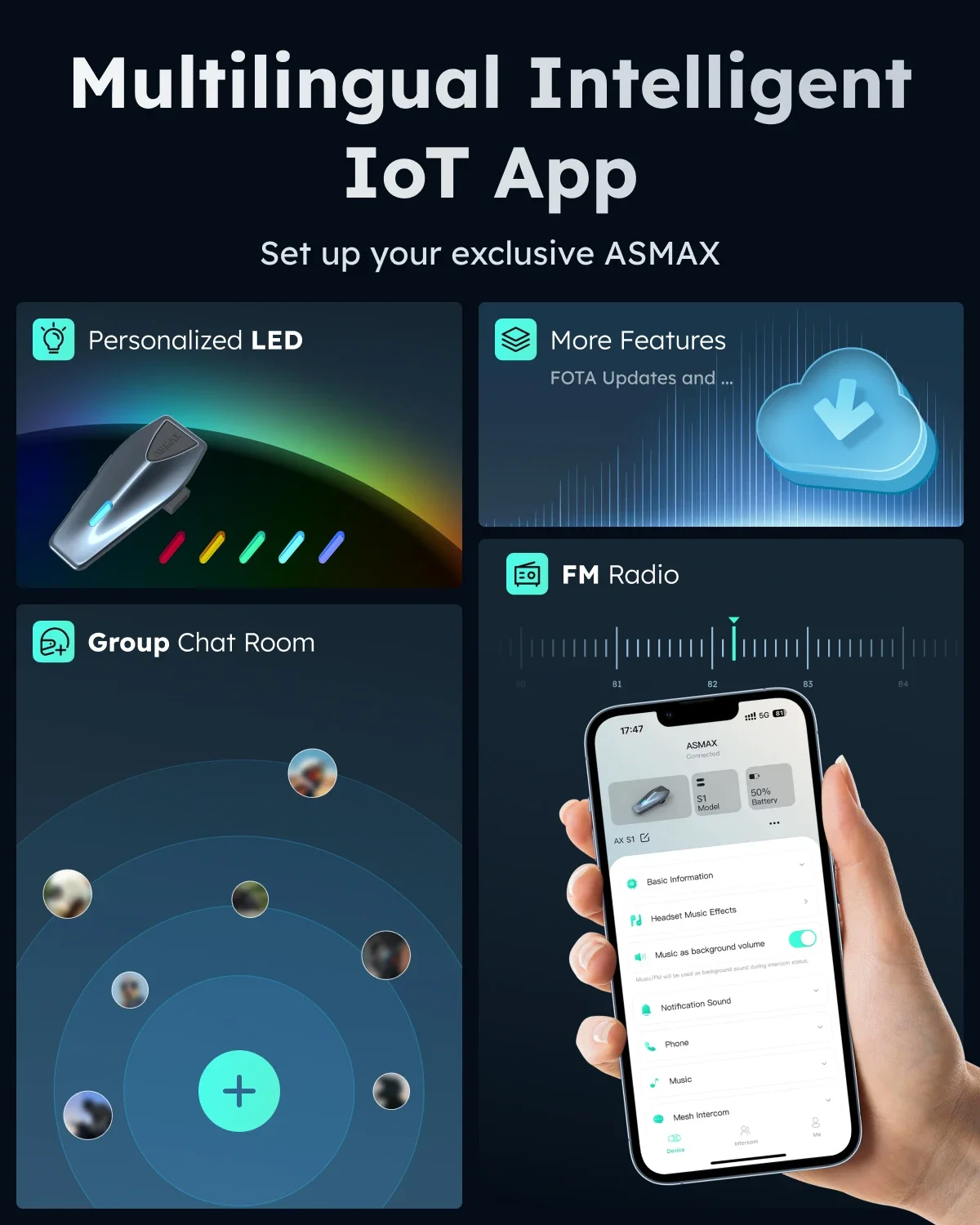 ASMAX S1 casco interfono versione globale moto Mesh Group interfono controllo vocale Multi-audio auricolare Bluetooth APP/IPX7/ENC/Radio FM Ultima tecnologia Bluetooth 5.4: ASMAX S1 supporta fino a 8 piloti in modalità interfono con un raggio di comunicazione fino a 3 km, goditi una compatibilità e una stabilità eccezionali per connessioni senza cuciture con vari citofoni, dispositivi Bluetooth e smartphone. Bluetooth avanzato 5.4 ASMAX S1 è dotato di 2 chip e 4 core, che garantiscono una comunicazione più chiara e stabile e multitasking come intercomunicazione, riproduzione musicale, navigazione, ecc. Modalità gratuita e modalità di gruppo: scegli la modalità gratuita per i canali aperti all'interno della gamma Bluetooth o della modalità di gruppo per le conversazioni private. La modalità di gruppo supporta fino a 8 driver con l'opzione di una chat del team leader per 2-3 persone e una chat privata per chiamate one-on-one. Comando vocale e controllo dei pulsanti: puoi semplicemente dire "Hi Max" per attivare i comandi con controllo vocale per la navigazione, la rete di gruppo e altro; la regolazione automatica del volume di base si adatta alla tua velocità e garantisce la chiarezza del suono. Riduzione del rumore ENC: anche a 120 km/h, filtra in modo intelligente il rumore e ripristina la voce umana pura per garantire la qualità della comunicazione. In aggiunta, ha una resistenza all'acqua IPX7 che garantisce la longevità in condizioni estreme.
