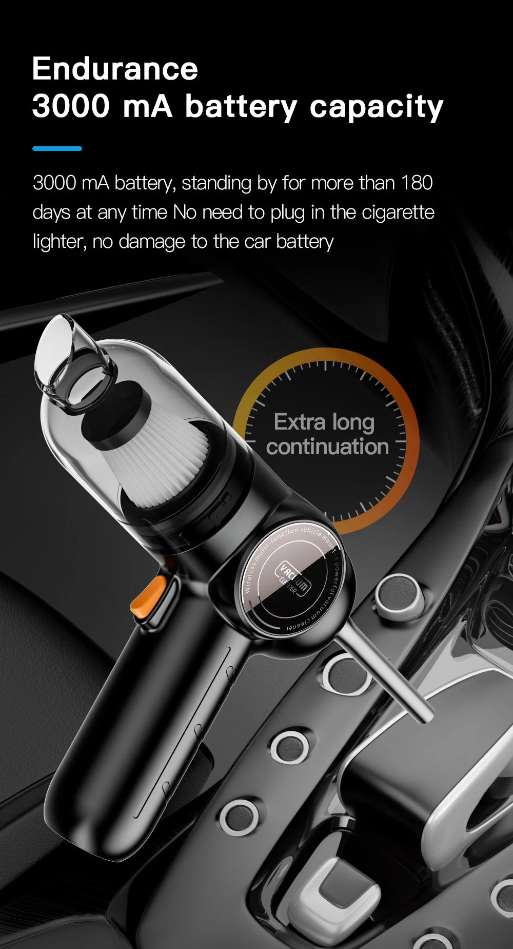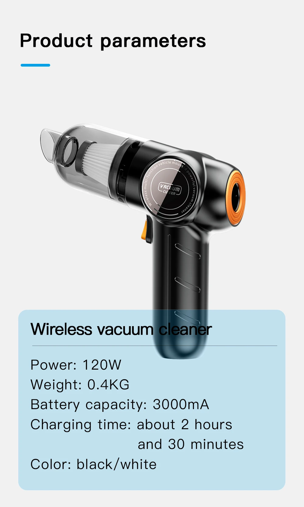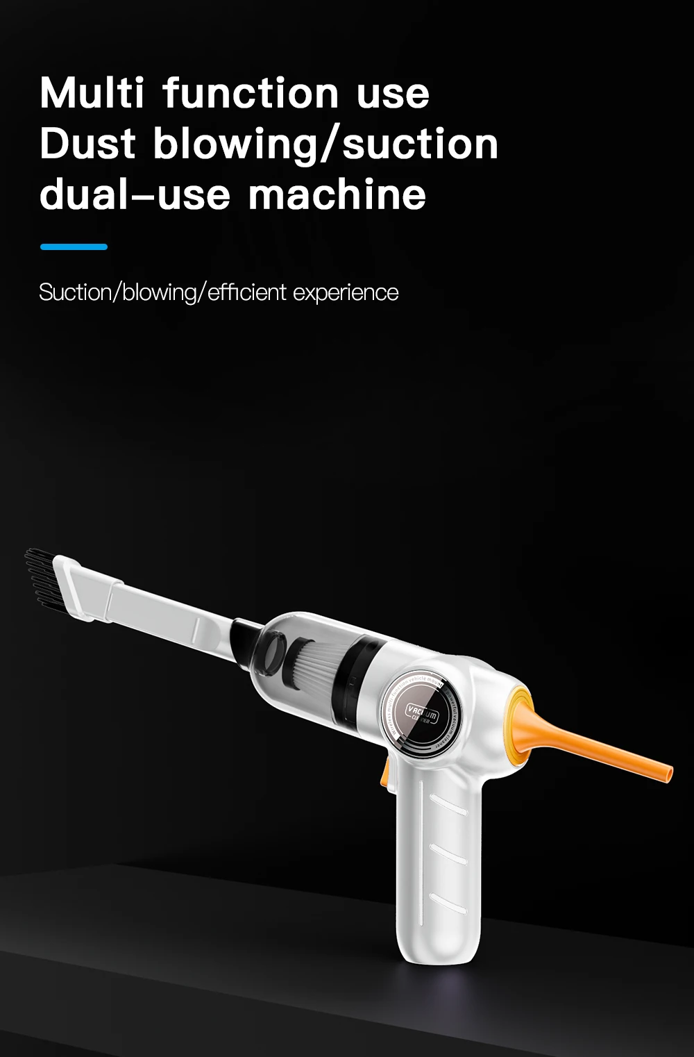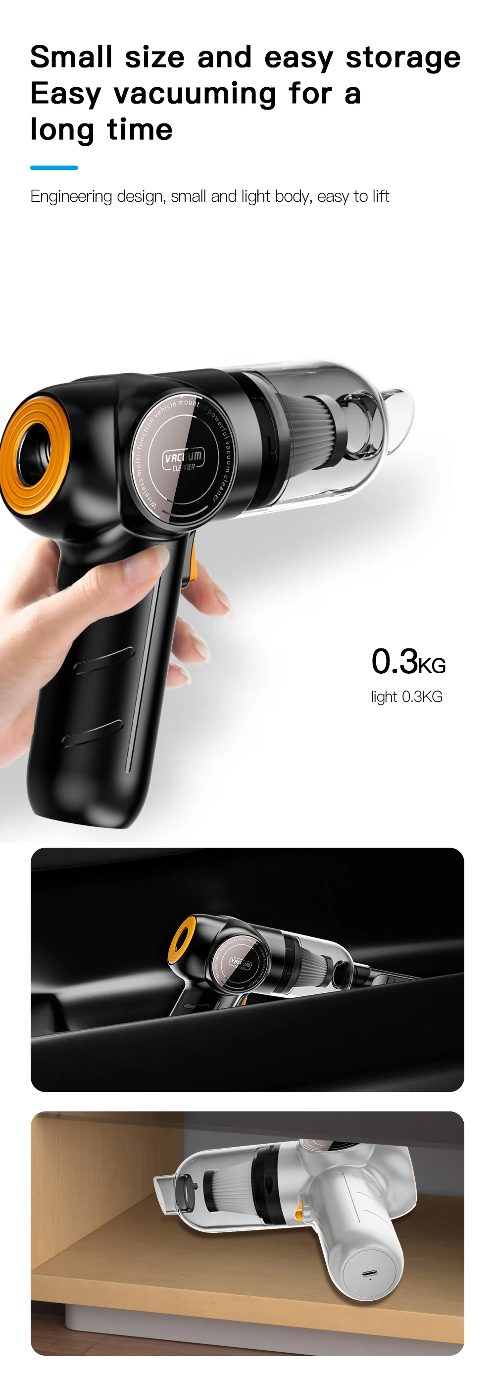 2.Alta potenza da 120 W, aspirazione prolungata senza attenuazione, assenza di riscaldamento, assorbimento efficace e rapido della polvere ostinata.Di piccole dimensioni, facile da riporre, comodo da aspirare e non stanco da tenere a lungo.Aspirare da un’estremità e gonfiare dall’altra, con funzioni potenti, adatte a varie occasioni.