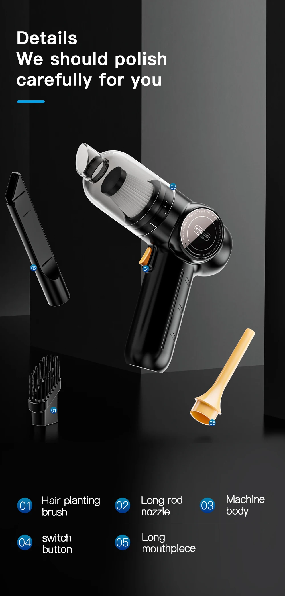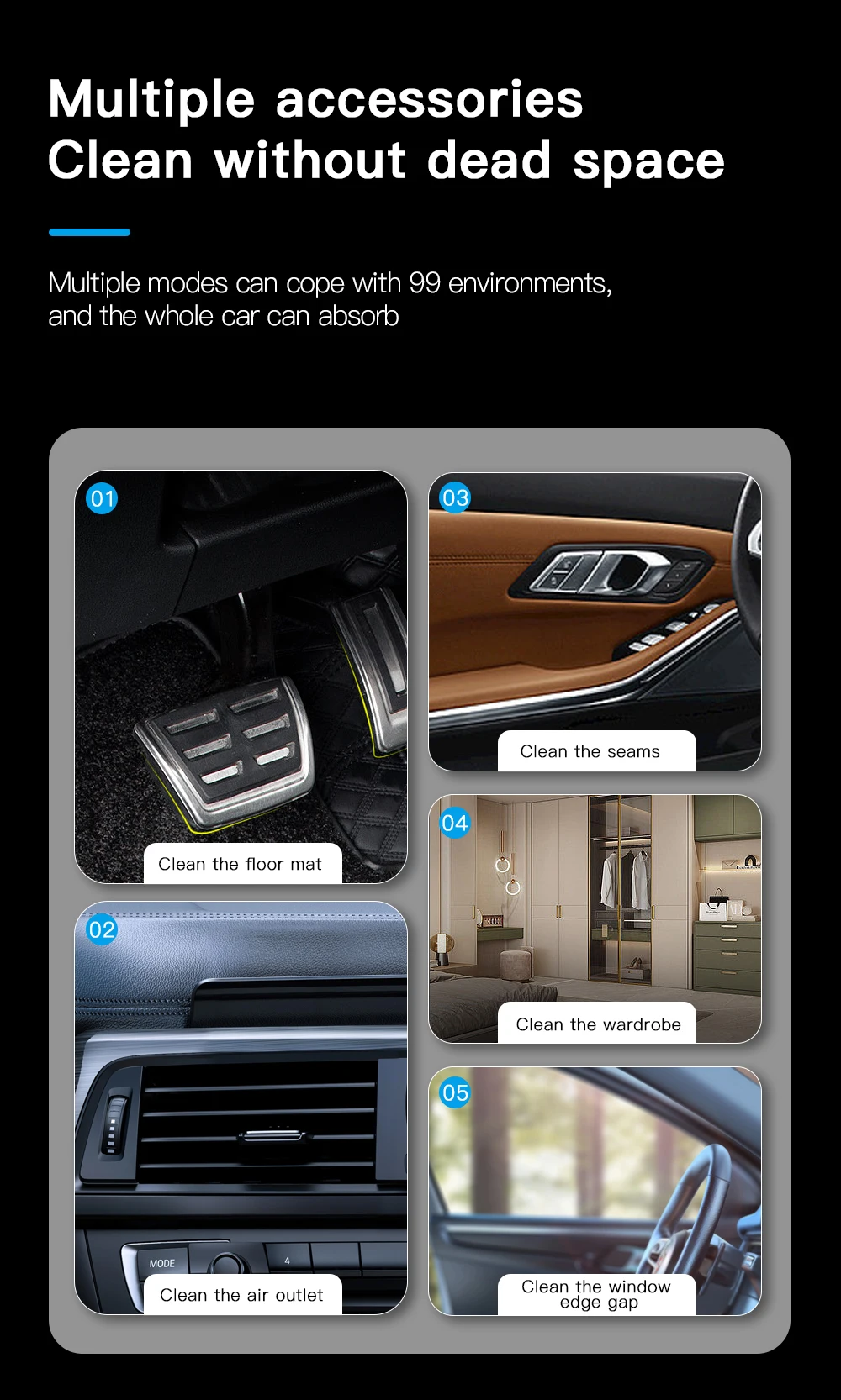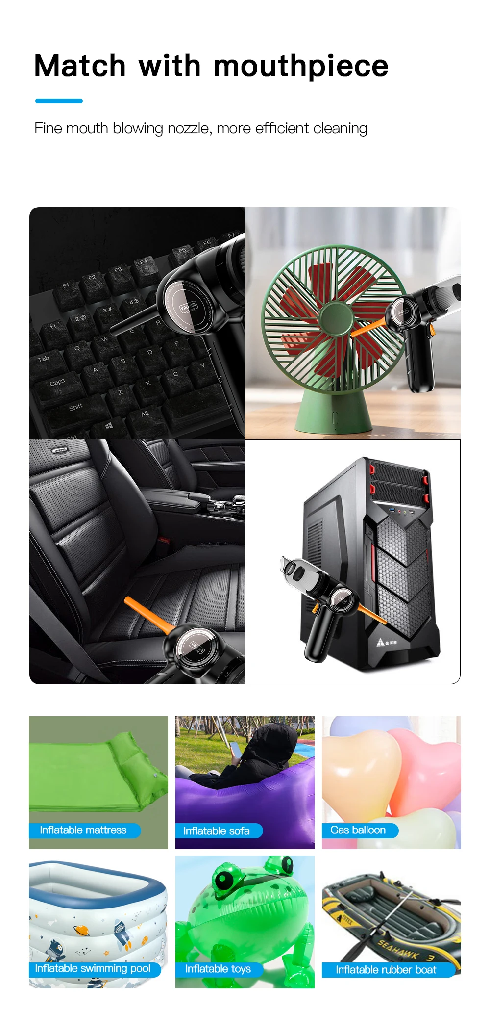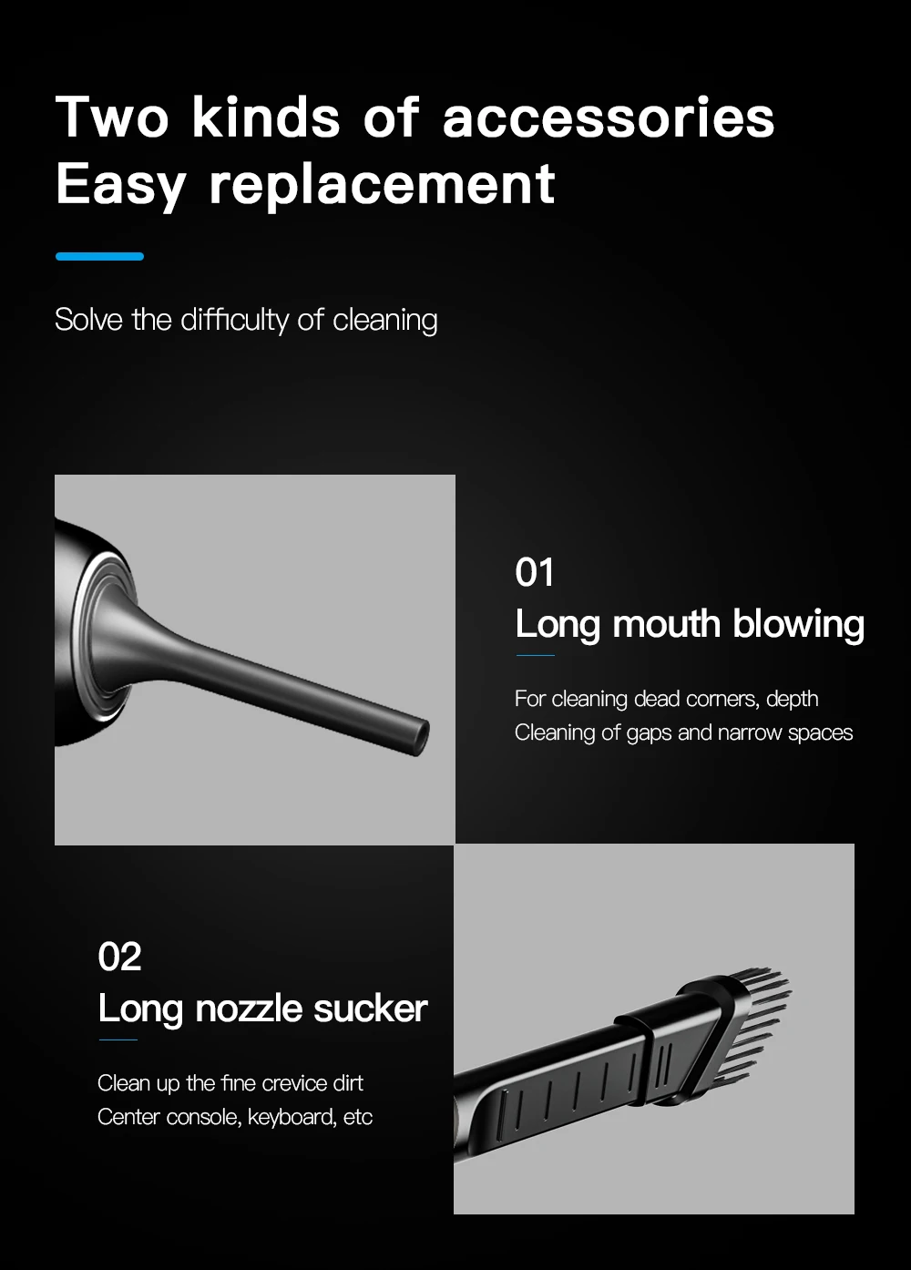 1. Facile smontaggio e sostituzione di due tipi di accessori, ugello di soffiaggio a bocca lunga per pulire angoli, spazi profondi e spazi stretti, ugello di aspirazione a bocca lunga pulisce fessure sottili, sporco, console centrale, tastiera, ecc.