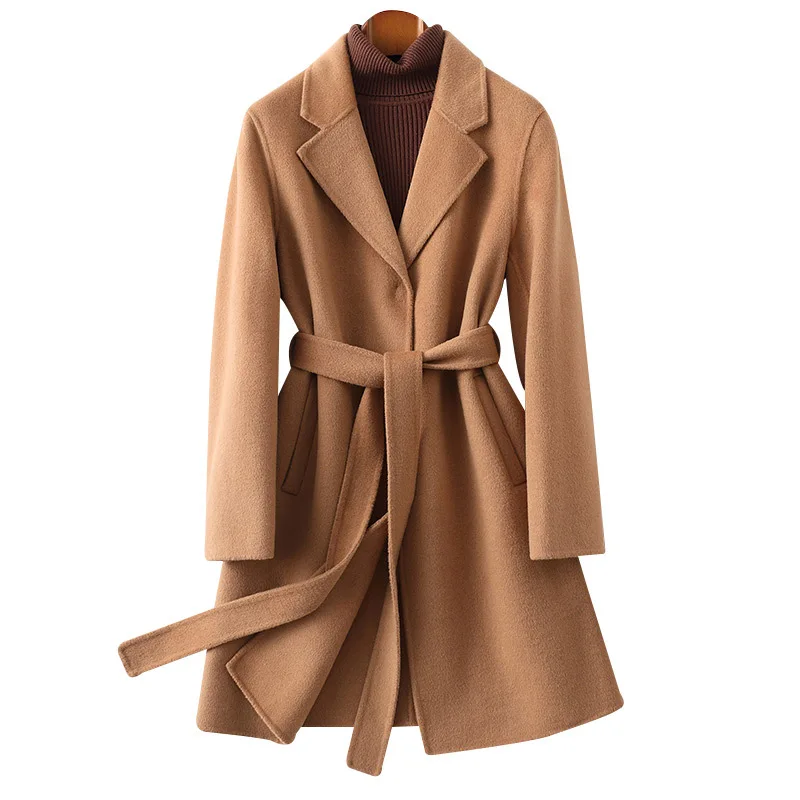 Autunno 100% Cappotti di lana Donna Colletto rovesciato Cappotti di lunghezza midi Cappotto di lana da donna con cintura Veste Femme Top