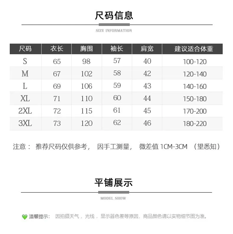 1. Dear customer i vestiti sono di dimensioni asiatiche, 1 cm = 0.394 pollici, 1 pollice = 2.54 cm, la misurazione manuale può avere un errore di 1-3 cm. 2. A causa di problemi di illuminazione, monitor diversi, lotti diversi, l’immagine reale potrebbe essere leggermente diversa, il prodotto effettivo prevarrà, grazie per la tua conoscenza. Se hai delle domande, contattaci il prima possibile per aiutare a risolvere il problema. Grazie! Display 3. Size: S, busto 98cm, lunghezza abbigliamento 65cm,Spalla 40cm M, busto 102cm, lunghezza abbigliamento 67cm,Spalla 42cm L, busto 106cm, lunghezza abbigliamento 69cm,Spalla 43cm XL, busto 110cm, lunghezza abbigliamento 71cm,Spalla 44cm XXL, busto 115cm, lunghezza abbigliamento 72cm,Spalla 45cm XXXL, busto 120cm, lunghezza abbigliamento 73cm,Spalla 46cm YUCAN