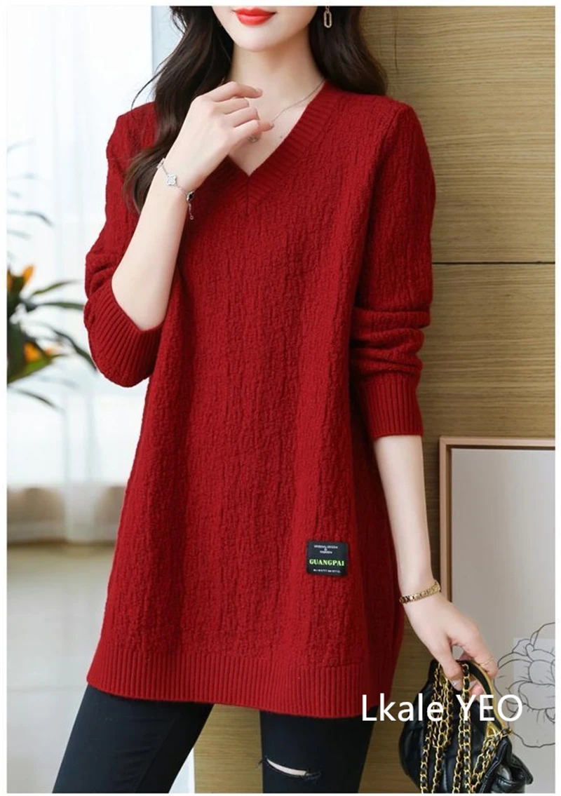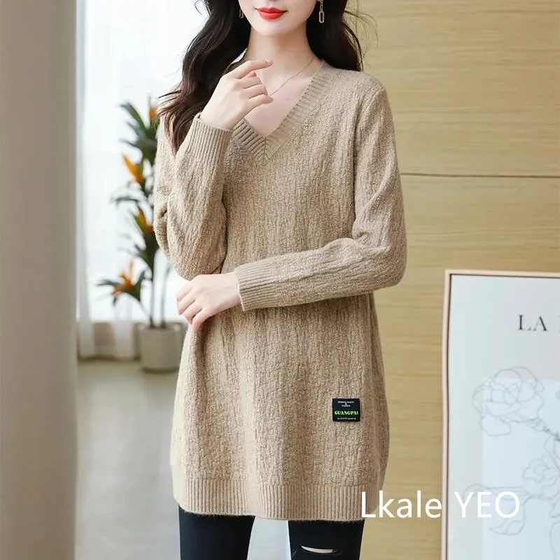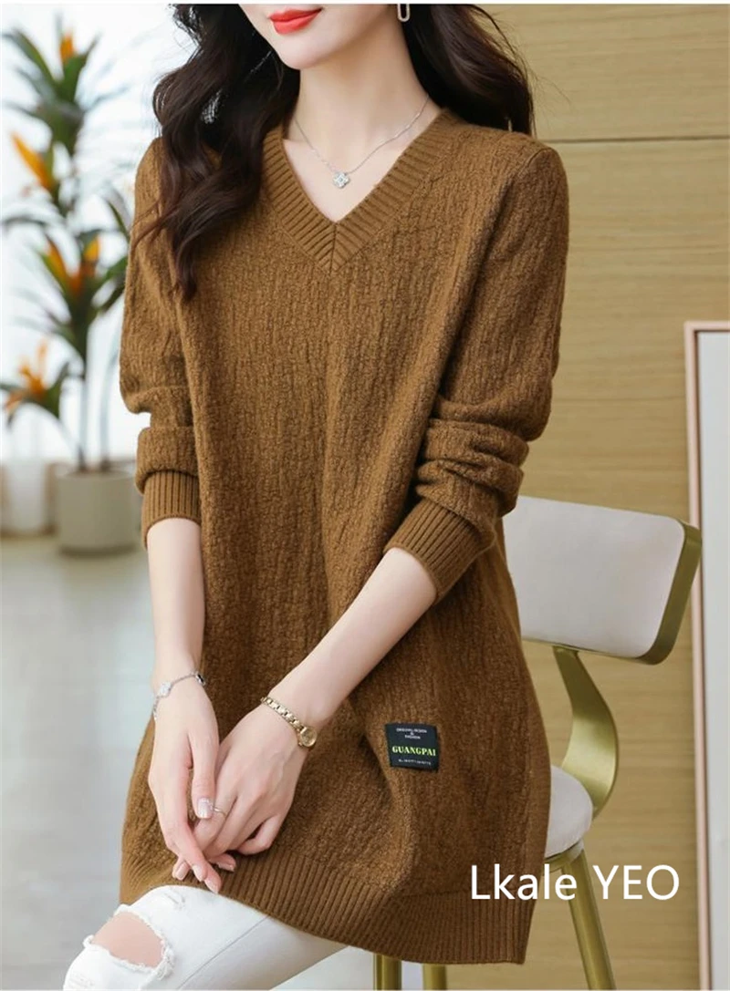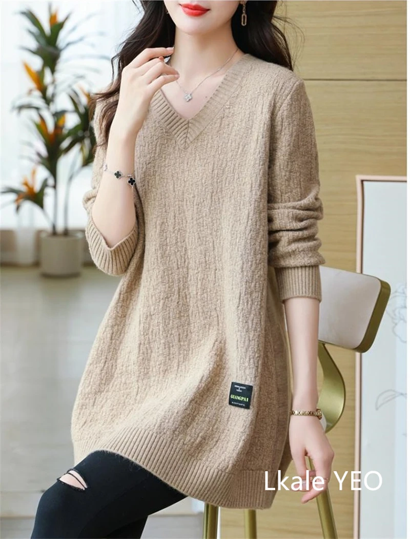 Autunno/Inverno 2025 Stili medi e lunghi Scollo a V Maglia da donna Pullover Maglione Moda Splicing Allentato Top da donna che tocca il fondo