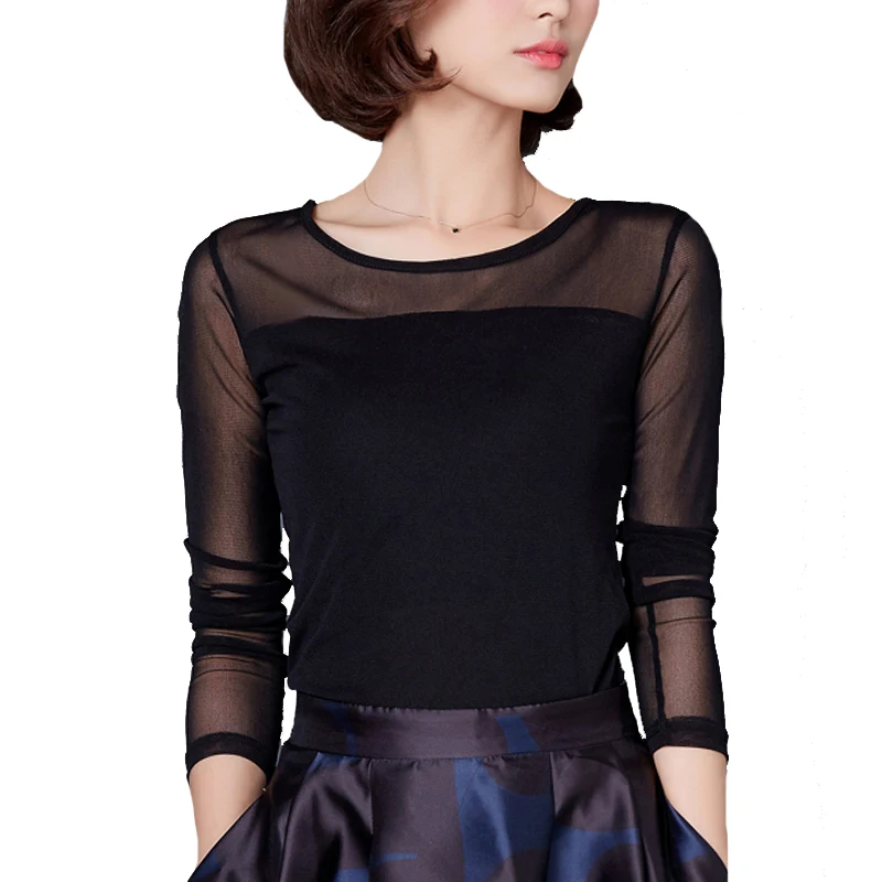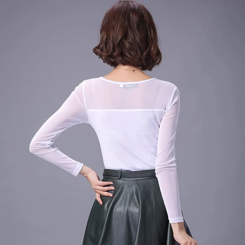 Autunno Inverno Camicia con fondo bianco nero Girocollo T-shirt in rete solida Top da donna alla moda coreana 1Autunno Inverno Camicia con fondo bianco nero Girocollo T-shirt in rete solida Top da donna alla moda coreana