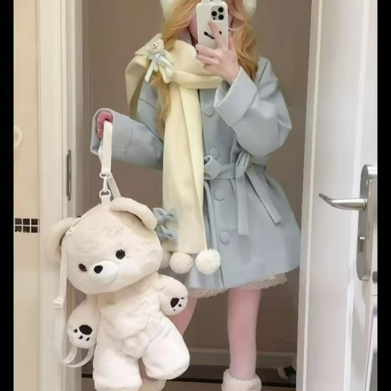 Questo cappotto di lana è un nuovo cappotto di lana stile preppy giapponese autunno inverno progettato per bey il designer. È molto carino Giacche lunghe larghe con sciarpa da orso cartone animato con fiocco Kawaii da donna