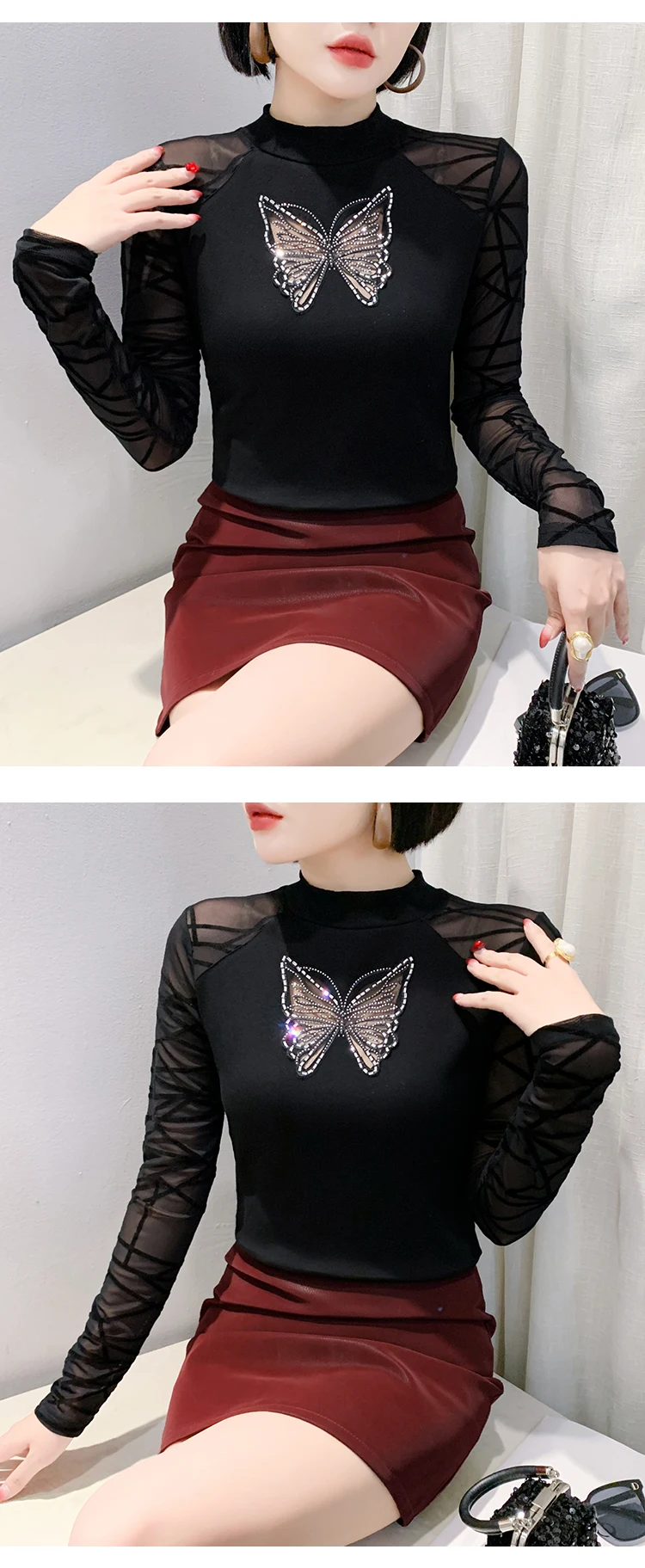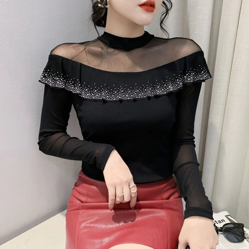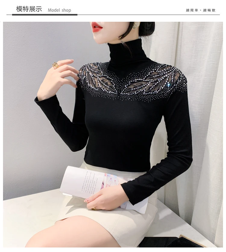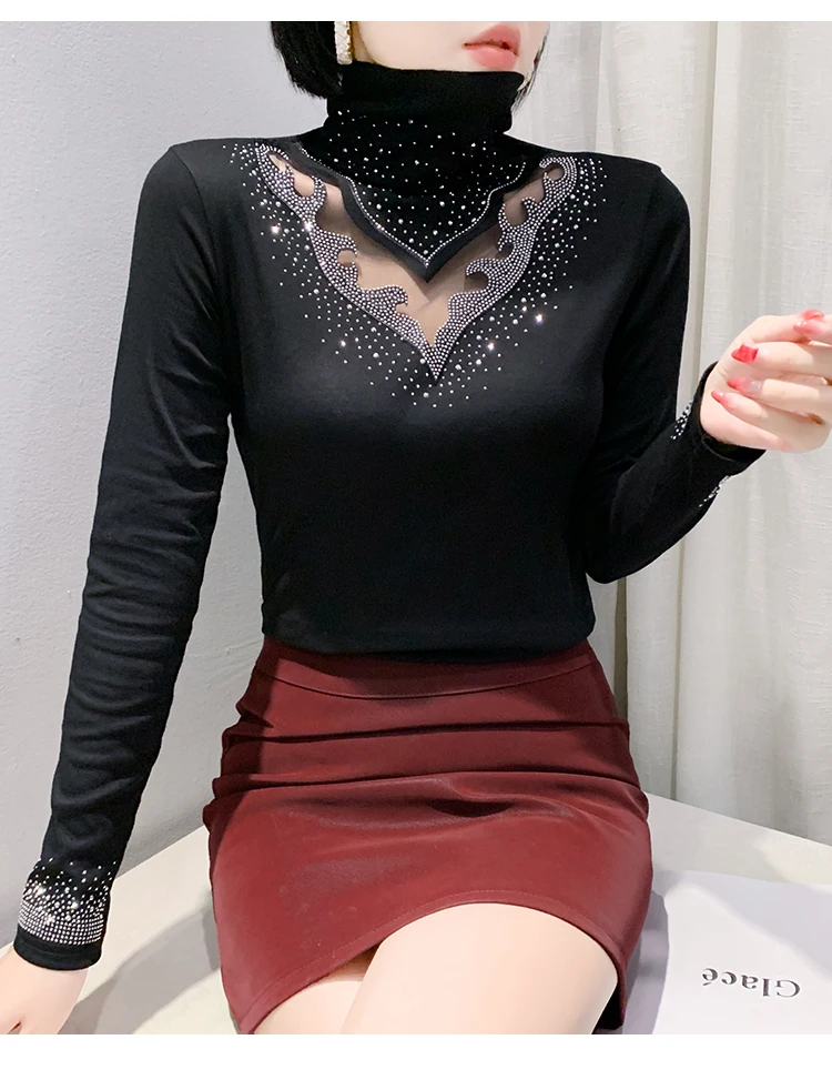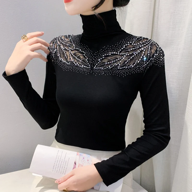 Autunno Inverno Dolcevita a maniche lunghe T-shirt da donna Moda Casual Sexy Scava Fuori Hot Diamond Mesh Top M-3XL Elasticità Tees