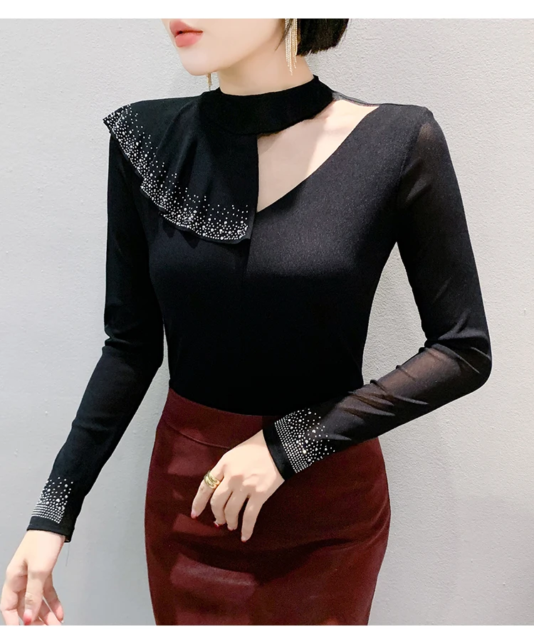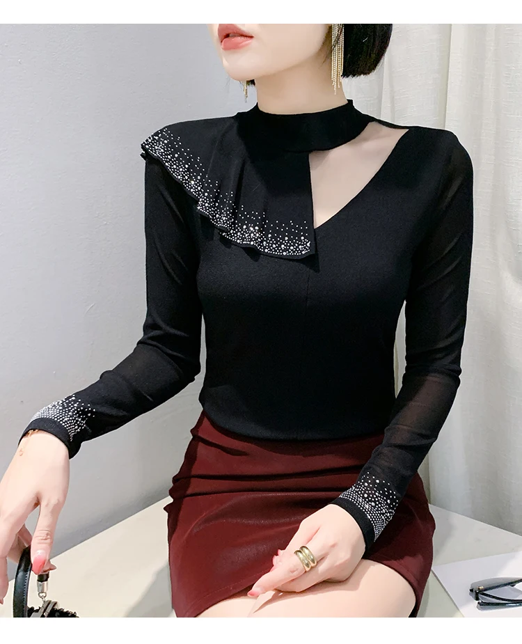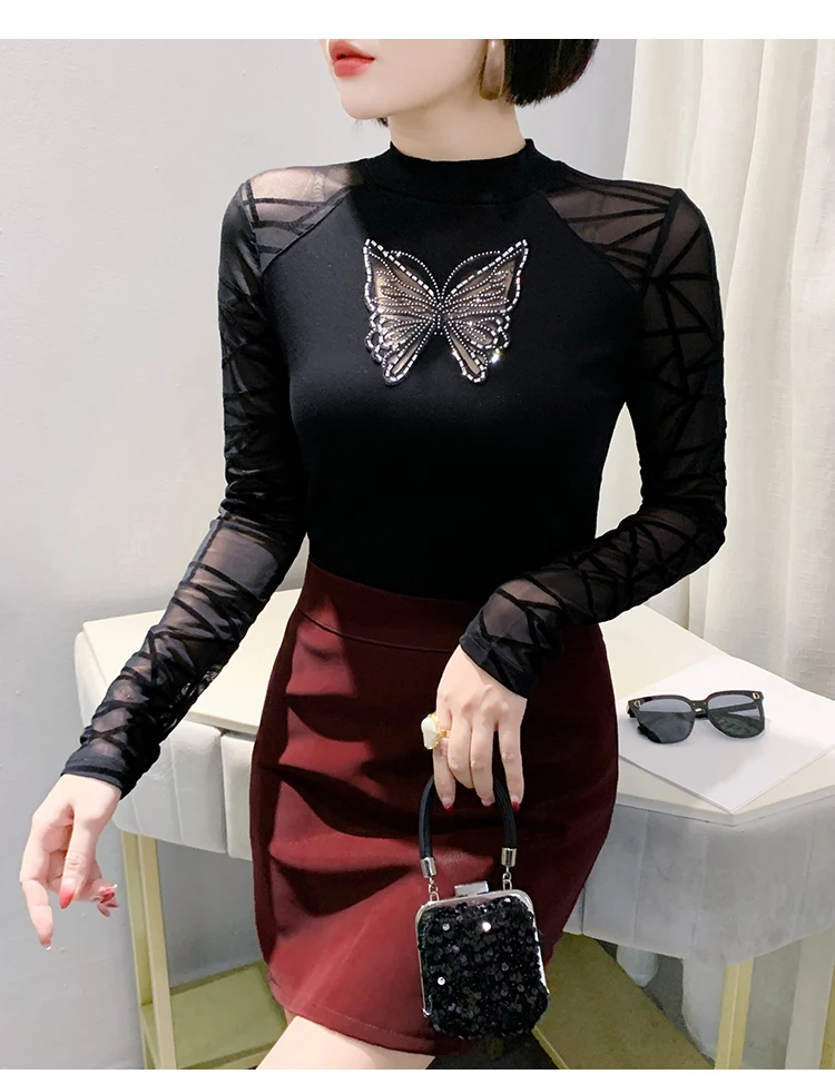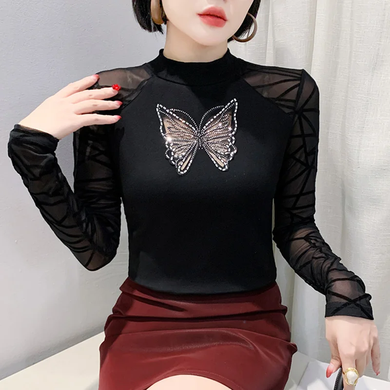 Autunno Inverno Dolcevita a maniche lunghe T-shirt da donna Moda Casual Sexy Scava Fuori Hot Diamond Mesh Top M-3XL Elasticità Tees