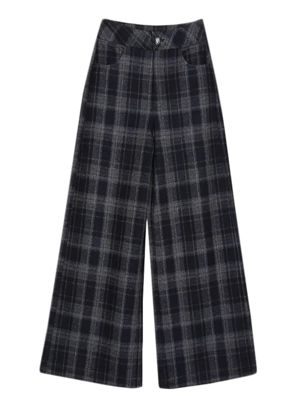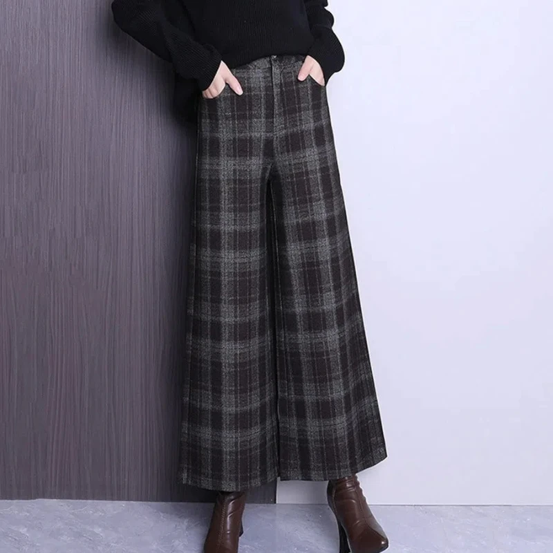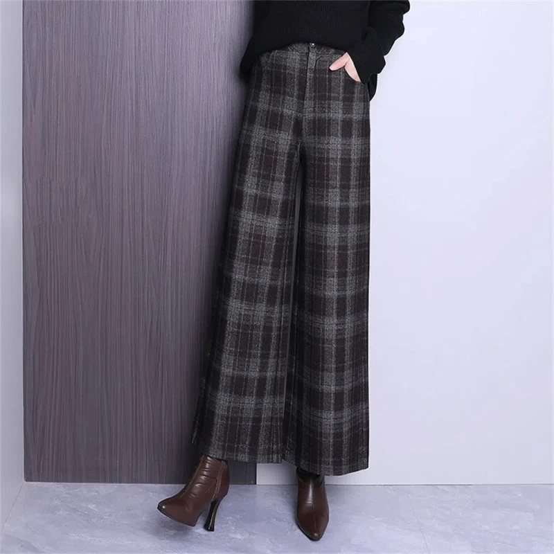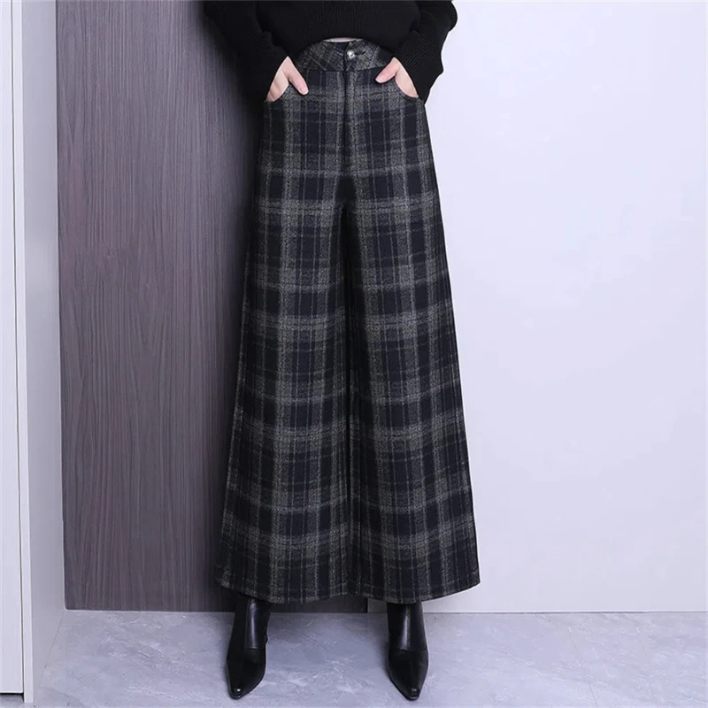 Autunno Inverno Donna Plus Velluto Addensare Pantaloni scozzesi di lana Tasche elastiche in vita Pantaloni larghi alla caviglia alla moda