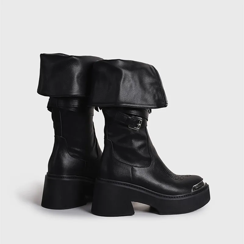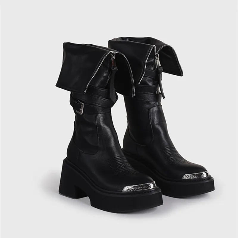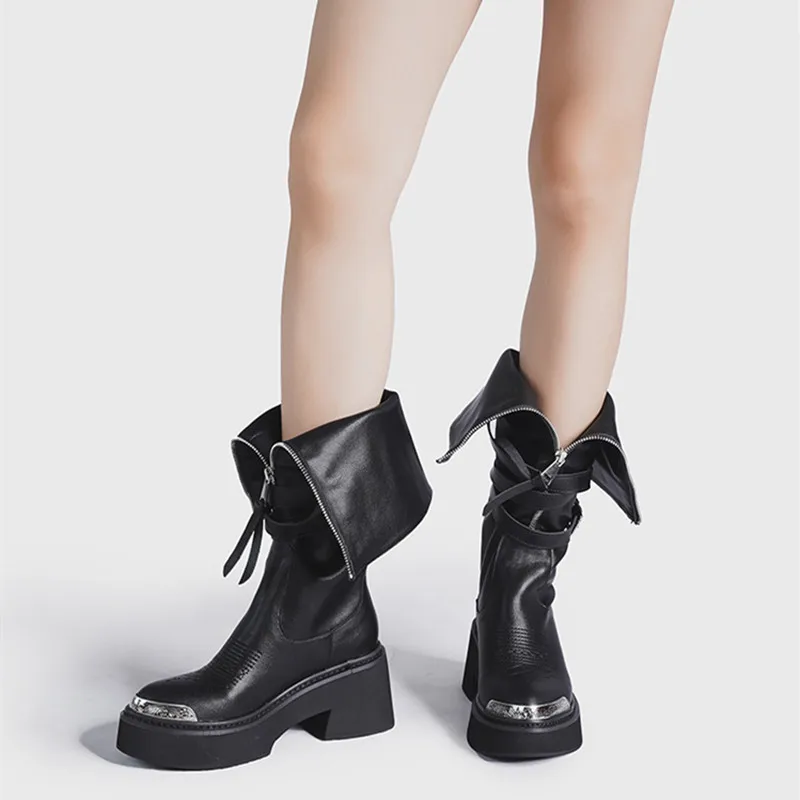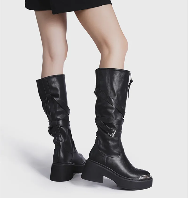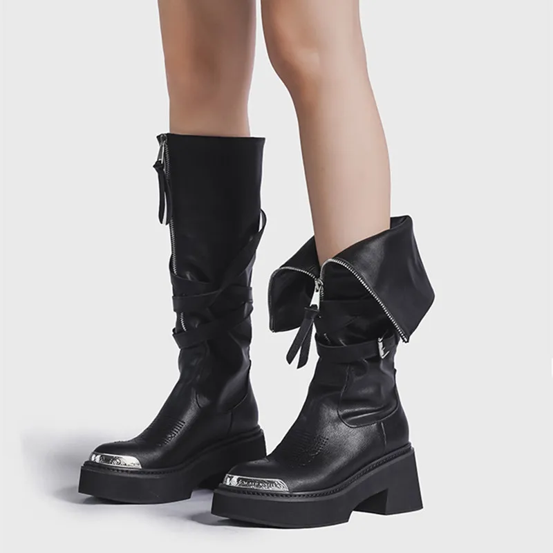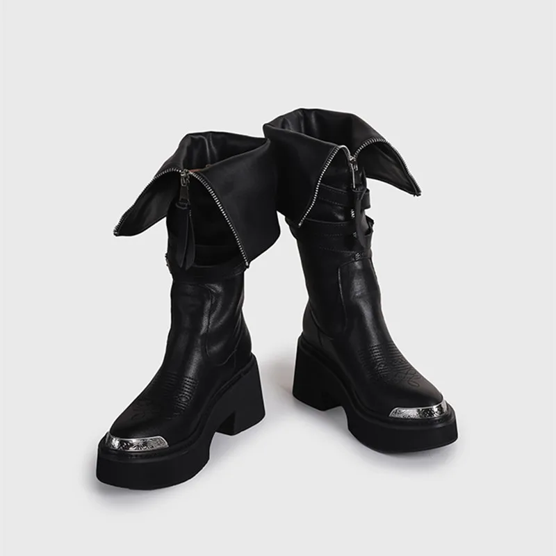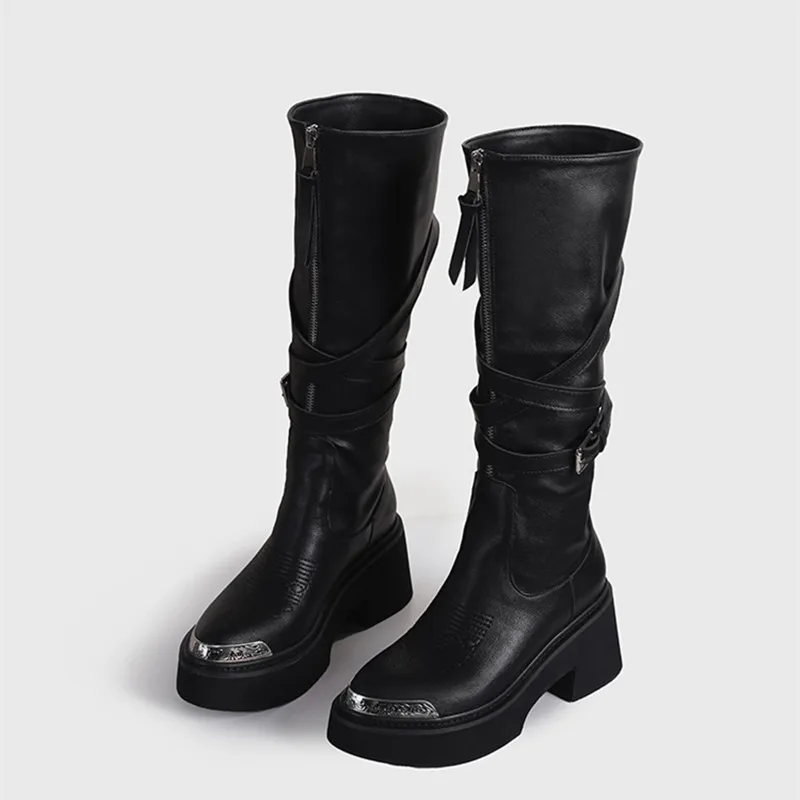 Autunno inverno moda cerniera in pelle donna stivaletti moto alti al ginocchio zeppe Casual tacchi alti grossi stivali lunghi cavaliere scarpe