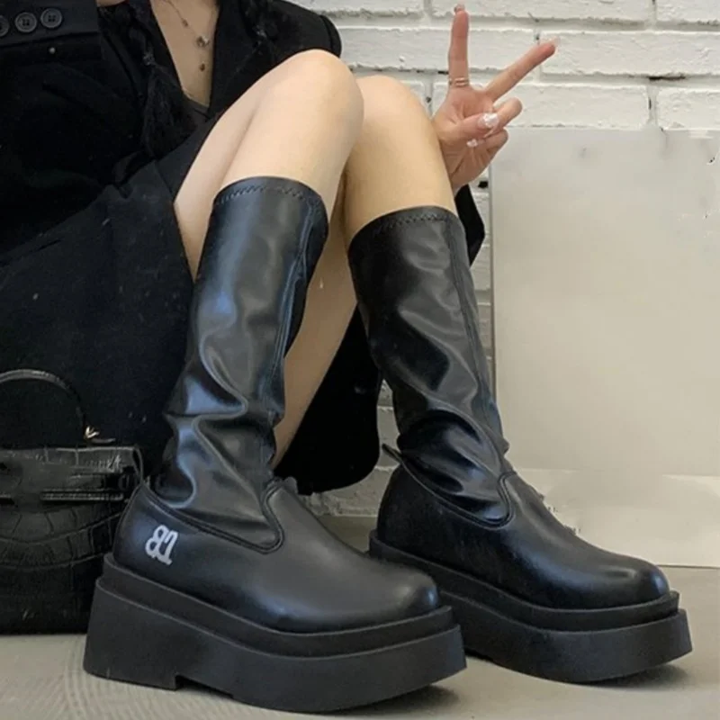 Autunno/inverno nuova punta tonda tacco quadrato stivali alti da donna eleganti alla moda suole spesse stivali da cavaliere temperamento retrò