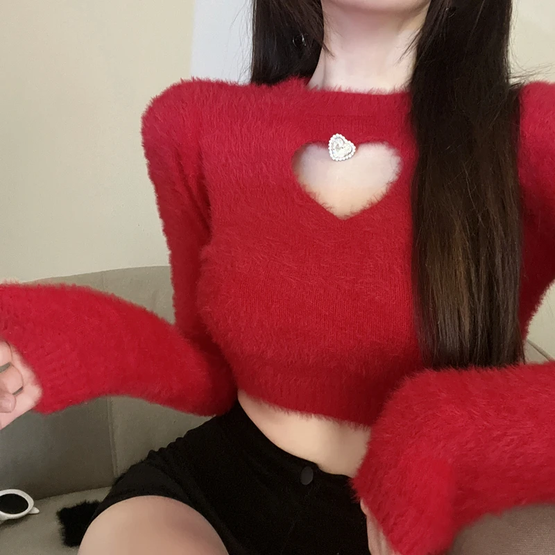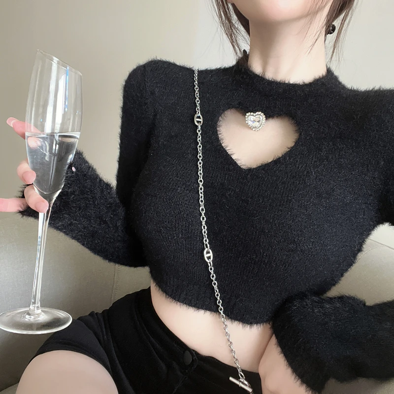 Autunno Inverno Nuovo maglione da donna O Collo tempestato di diamanti Hollow Love Manica lunga Slim Short Crop Top