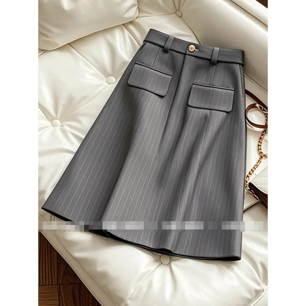 Autunno Inverno Office Lady Semplicità Gonna a trapezio a vita alta a righe Gonna da donna con bottoni alla moda Gonna con cerniera Gonna da donna