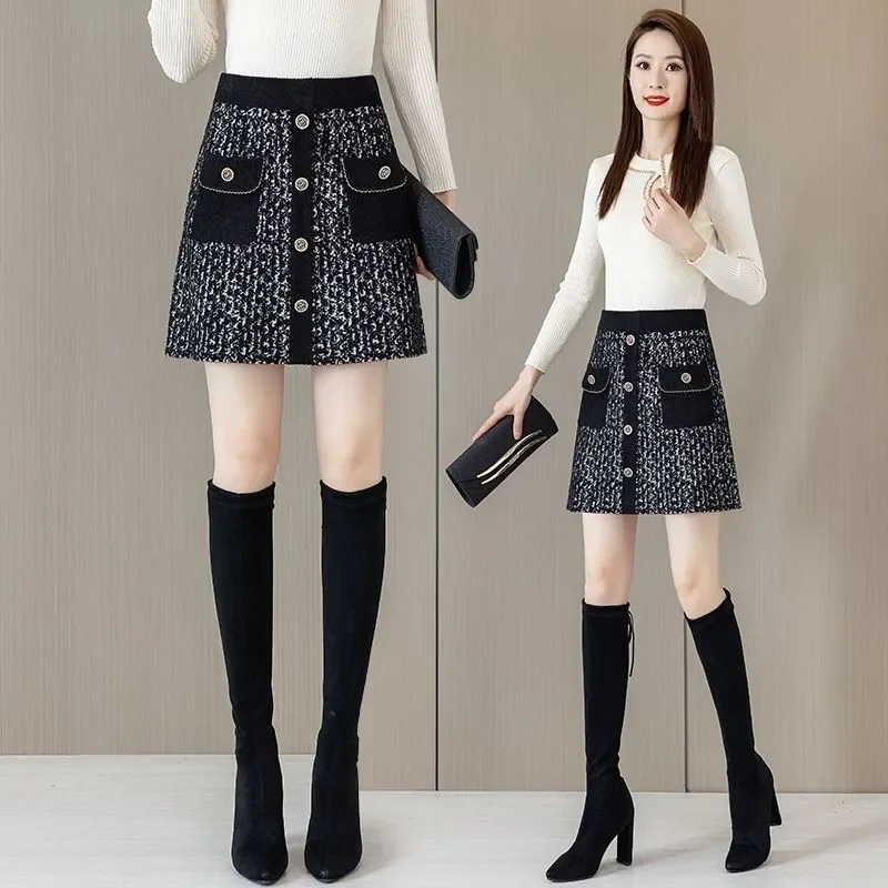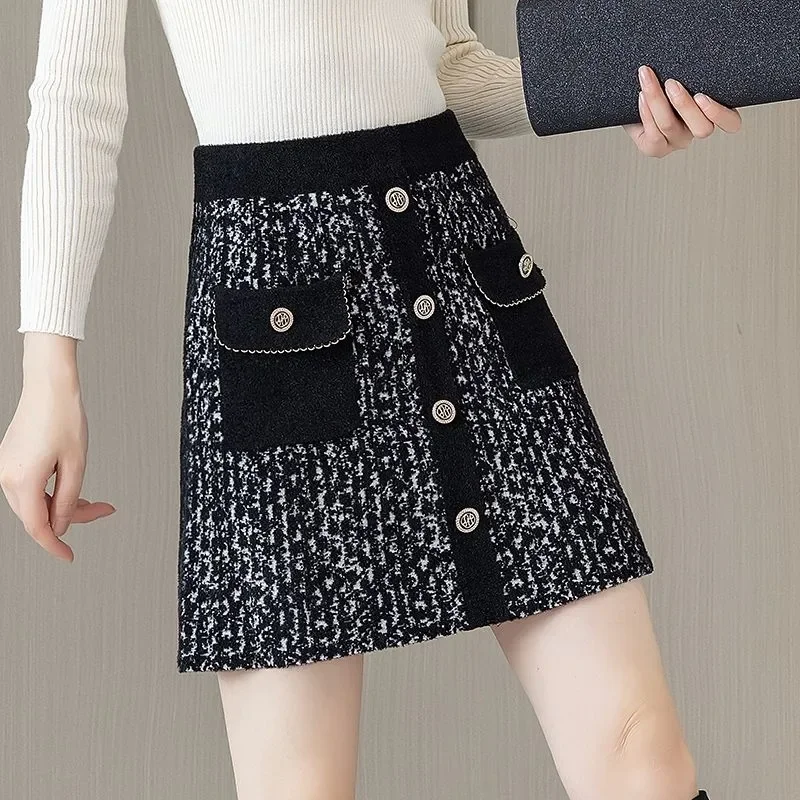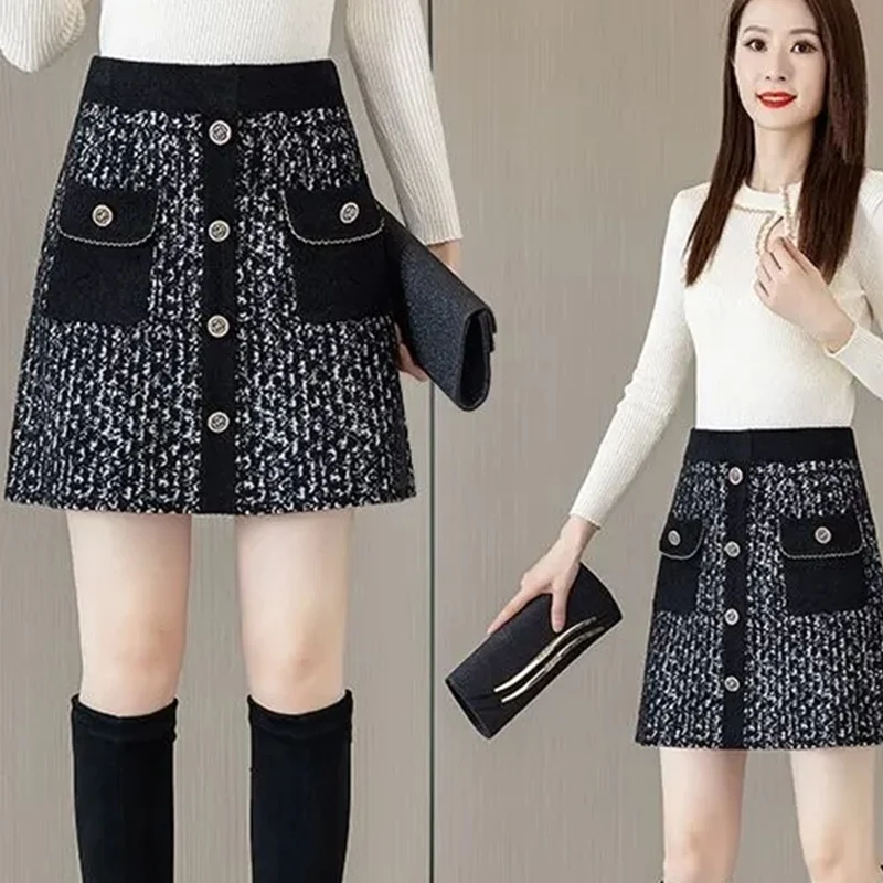 Autunno Inverno Temperamento Patchwork Vita alta Gonna a trapezio Donna All-match Bottoni alla moda Gonne spesse sottili Gonna da donna
