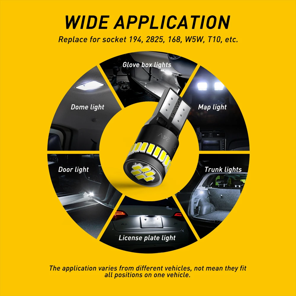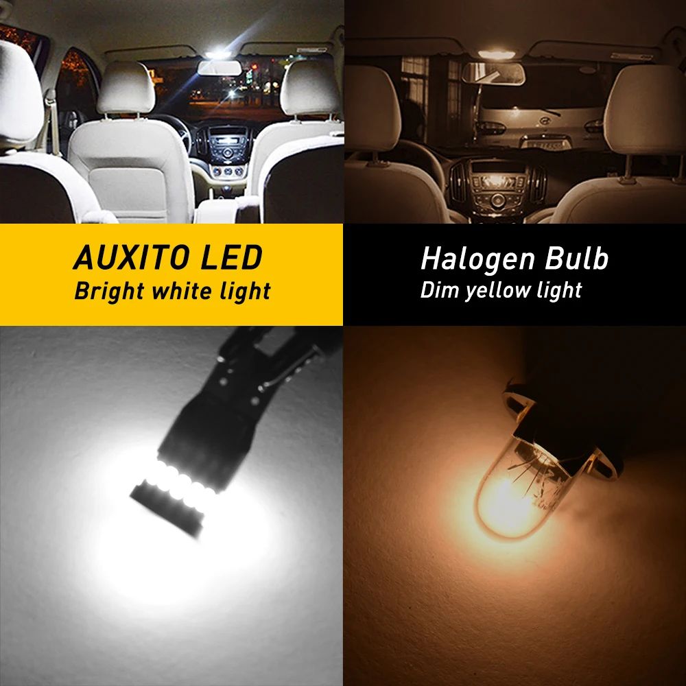 AUXITO 10/2 Pz W5W T10 LED Canbus Lampadine 194 168 Led Nessun Errore 5w5 Interno Auto Dome Lettura Targa Luce Segnale LampadaDescrizioneVoltaggio: 9-18 V CCPotenza: 1,8 WLumen: 200LM/lampadina, 400LM/coppiaQuantità LED: 24 pezzi 3014 SMDTemperatura colore: bianco 6000KCaratteristica: Canbus, senza errori, senza erroriAmpia applicazioneLuce a cupola, Luce di lettura, Lampada per bagagliaio, Luce di parcheggio, Luce di posizione laterale, Luce per porta, Luce targa, Luce da golf, Luce per specchio, Luce interna, ecc.Nota:1.La lampada a LED ha terminali “+” e “-“, se il LED non si accende, basta semplicemente girarlo di 180 gradi per invertire la polarità.2.Si prega di verificare che il portalampada sia T10 prima di effettuare l’ordine.3.Si prega di sapere che questa lampadina a LED ha la funzione canbus per il 98% del veicolo.Ma per alcune auto sensibili mostrerà errori.non possiamo garantire al 100% che non ci saranno errori.Il pacchetto include: 10/2 lampadine LED T10 W5WAUXITO LED VS Lampadina alogena