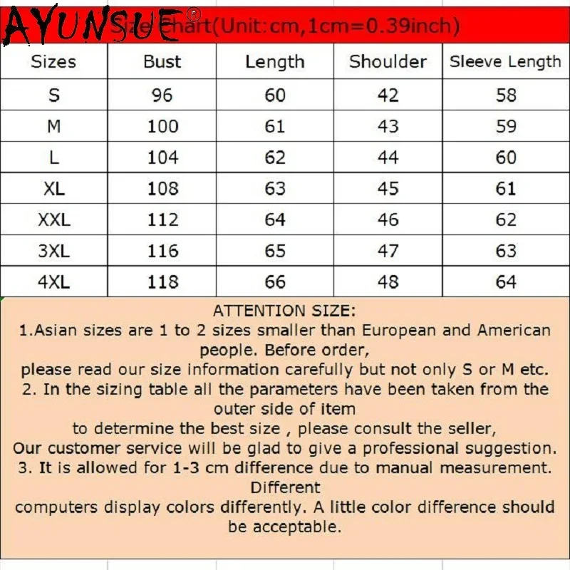 Grafico delle dimensioni (Unità: cm, 1 cm = 0,39 pollici) Taglie Busto Lunghezza Spalla Lunghezza manica S 96 60 42 58 M 100 61 43 59 L L 104 62 44 60 XL 108 63 45 61 XXL 112 64 46 62 3XL 116 65 47 63 4XL 118 66 48 64