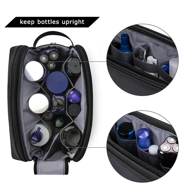 Grande capacità: ampio scomparto principale con cinghie elastiche mantiene le bottiglie in posizione verticale.Tasche multiple all’interno, possono contenere tutti i tuoi articoli da toeletta e prodotti per la rasatura organizzati