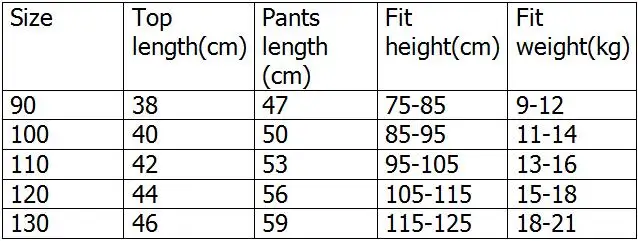 Dimensioni: 80-120 (0-5 anni bambino) Scegli la taglia, se il bambino è un po’ grasso, scegli una taglia più grande! Tessuto: 95% cotone 5% spandex Informazioni sulle dimensioni: Scegli 80: ottieni la taglia S/6/80, adatta per altezza 60-75 cm, peso circa 9kg bambino, 4-12 bocche bambino Scegli 90: ottieni la taglia M/8/90, adatta per l’altezza 75-85 cm, peso di circa 11kg bambino, 1-2 anni bambino Scegli 100: ottieni la taglia L/10/100, adatta per l’altezza 85-95 cm, peso circa 13kg bambino, 2-3 anni bambino Scegli 110: ottieni la taglia XL/12/110, adatta per l’altezza 95-105 cm, peso di circa 16kg bambino, 3-4 anni bambino Scegli 120: ottieni la taglia XXL/14/120, adatta per l’altezza 105-115 cm, peso di circa 20kg bambino, 4-5 anni bambino