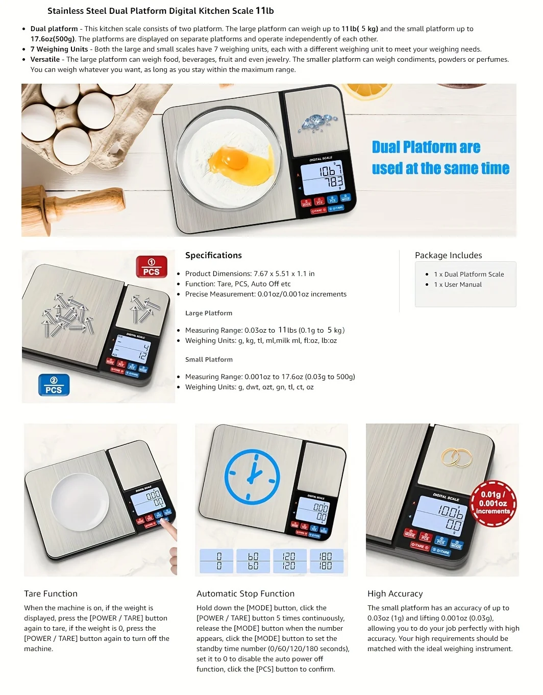 5 recensioni per Bilancia da cucina digitale a doppia piattaforma grande da 1 pezzo, due accurità 0,01 g/0,001 oz e 0,1 g/0,01 oz, capacità massima 5 kg/11 libbre