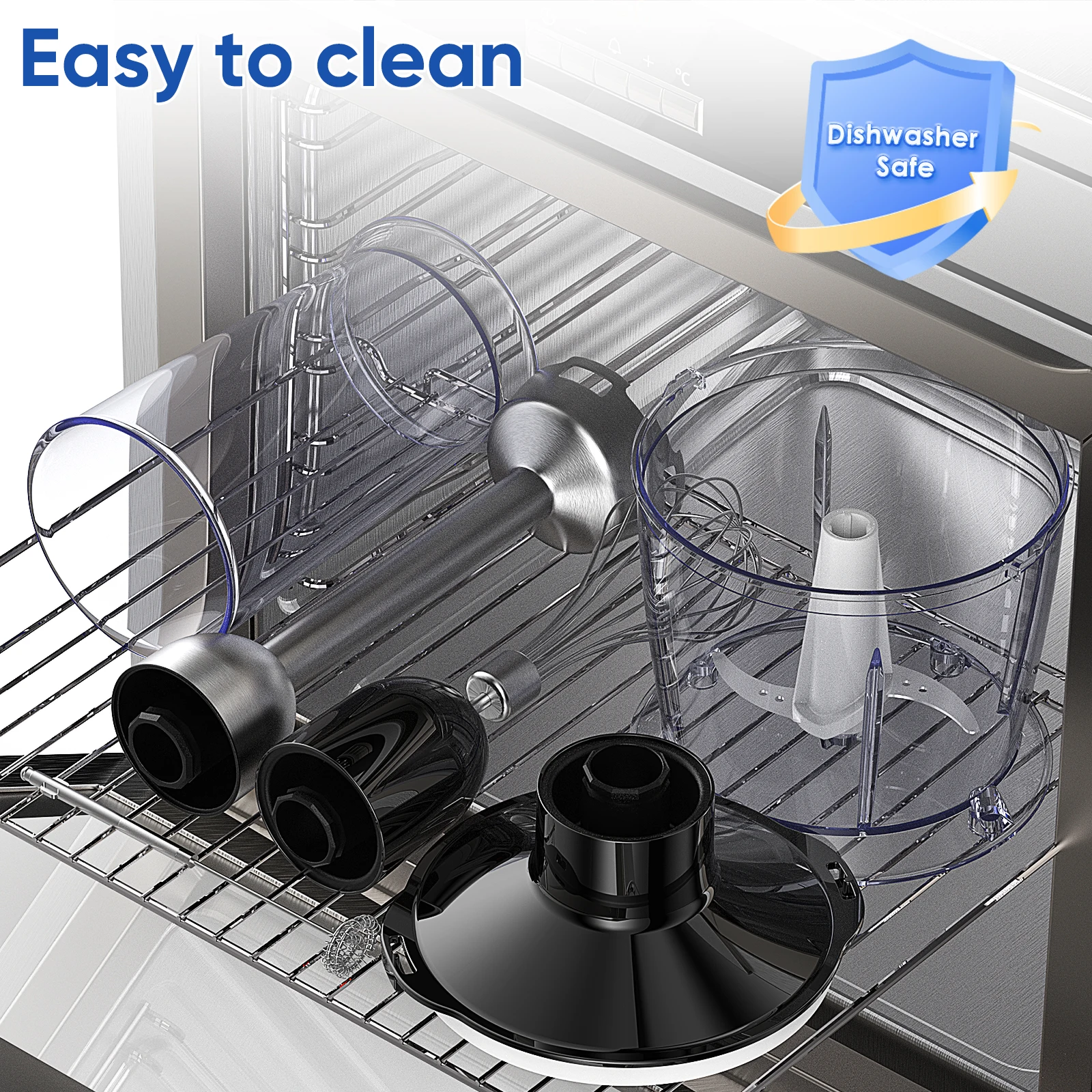 4. Facile da pulire: le parti staccabili di miscelazione, frusta e schiuma sono realizzate in acciaio inossidabile di grado professionale, facili da pulire con acqua calda e saponata e lavabili in lavastoviglie. (Nota: non immergi il motore nell’acqua.)
