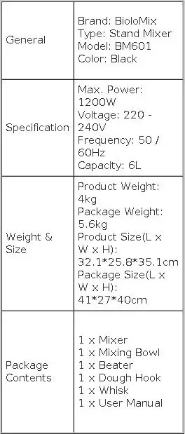 Dotato di una ciotola in acciaio inossidabile alimentare da 6 litri con doppie maniglie che è più comoda da tenere, BioloMix BM601 può possibile possibile ospitare efficacemente le riunioni di famiglia di 8-10 persone.Ha anche un frusta in filo metallico temprato, un gancio per impastare oversize con rivestimento in Teflon e un battitore piatto.