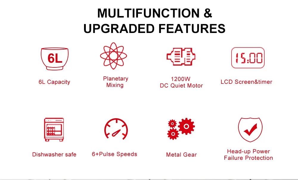 Presenta un display digitale per mostrare il tempo di funzionamento e ti consentono di fare altre cose presso lo stesso tempo quando il mixer stand è funzionante.Questo miscelatore da forno multifunzionale ha anche la protezione da surriscaldamento e chiude automaticamente la macchina quando il motore si accende surriscaldate.Il design della testa inclinabile non cambia solo gli accessori comodamente ma prende anche la ciotola facilmente.