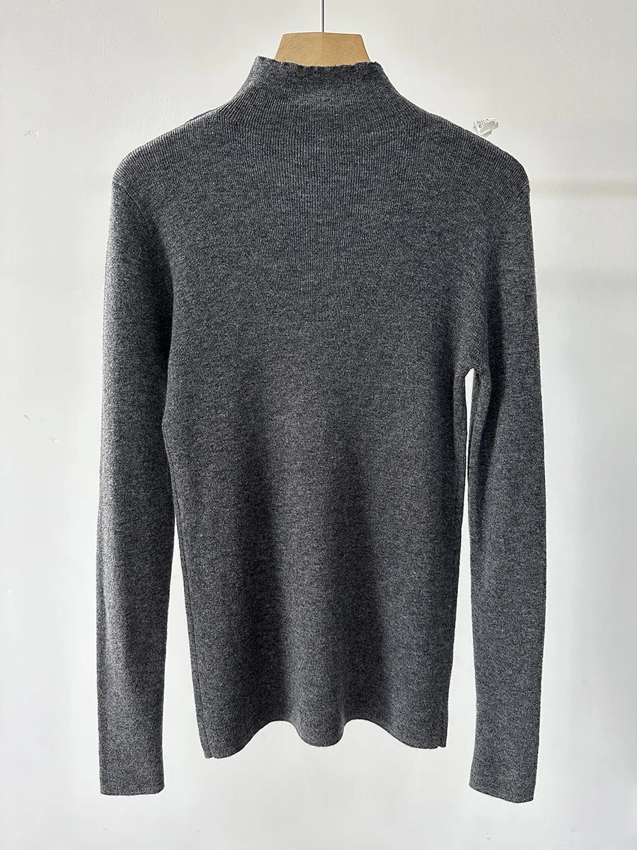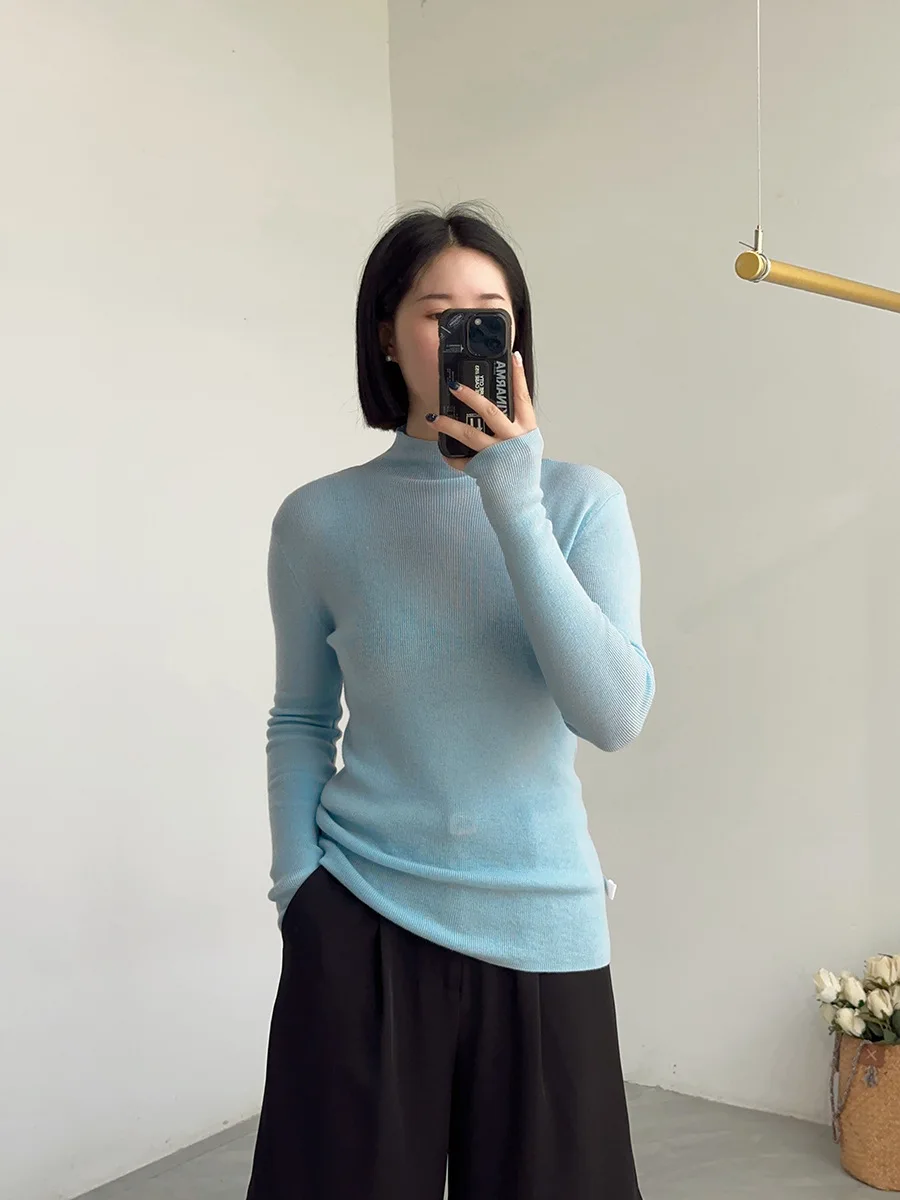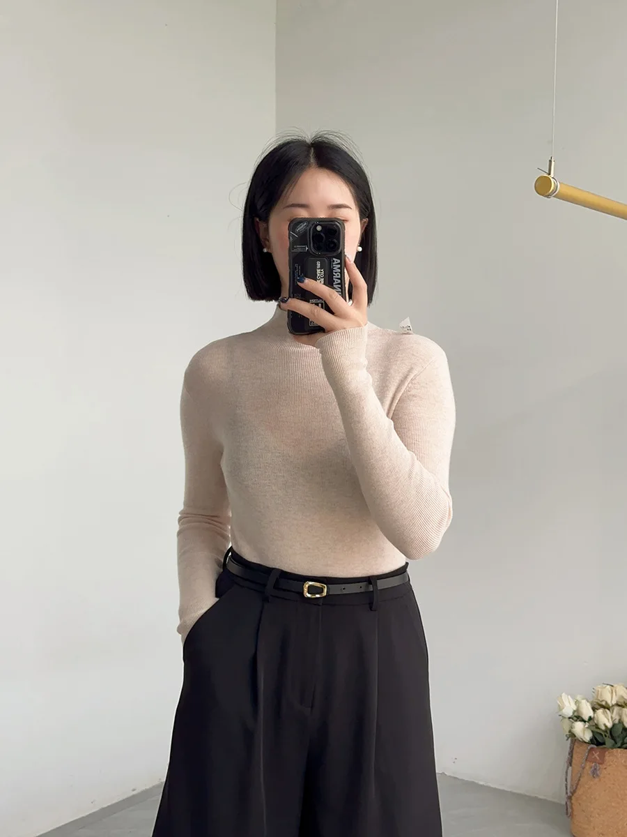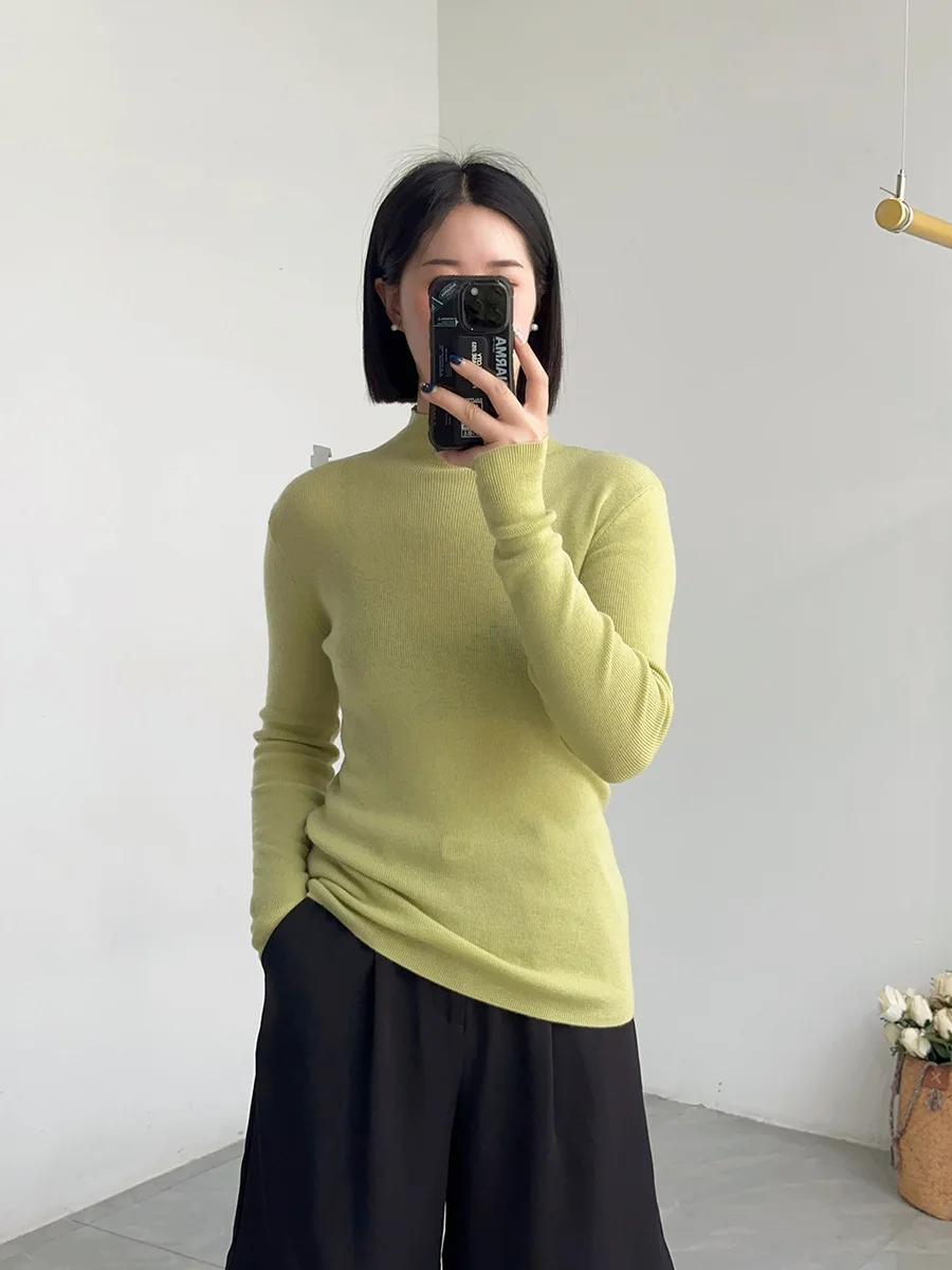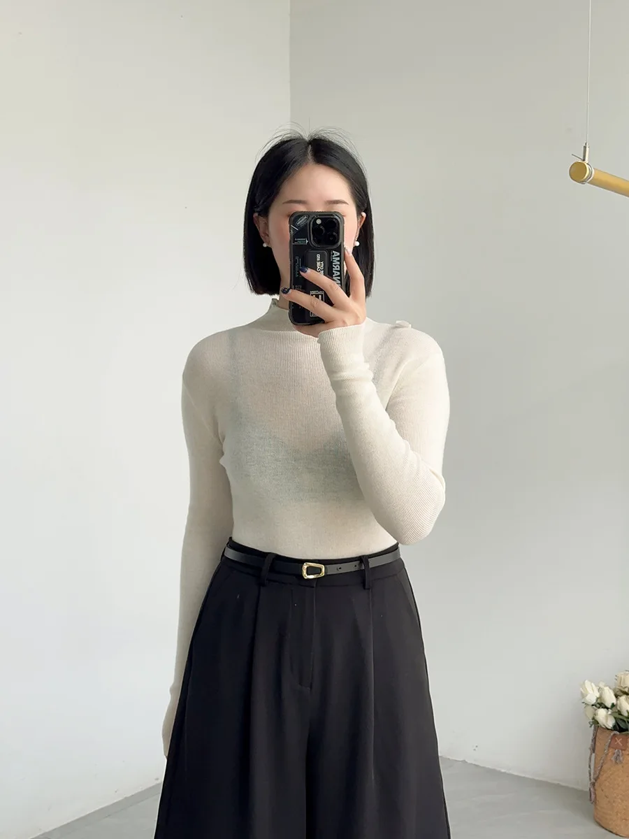 BirdTree, maglione sottile sottile 100% lana, collo a lupetto manica lunga donna, fondo senza cuciture alto elastico, autunno estate 2024 Tessuto: 100% lana