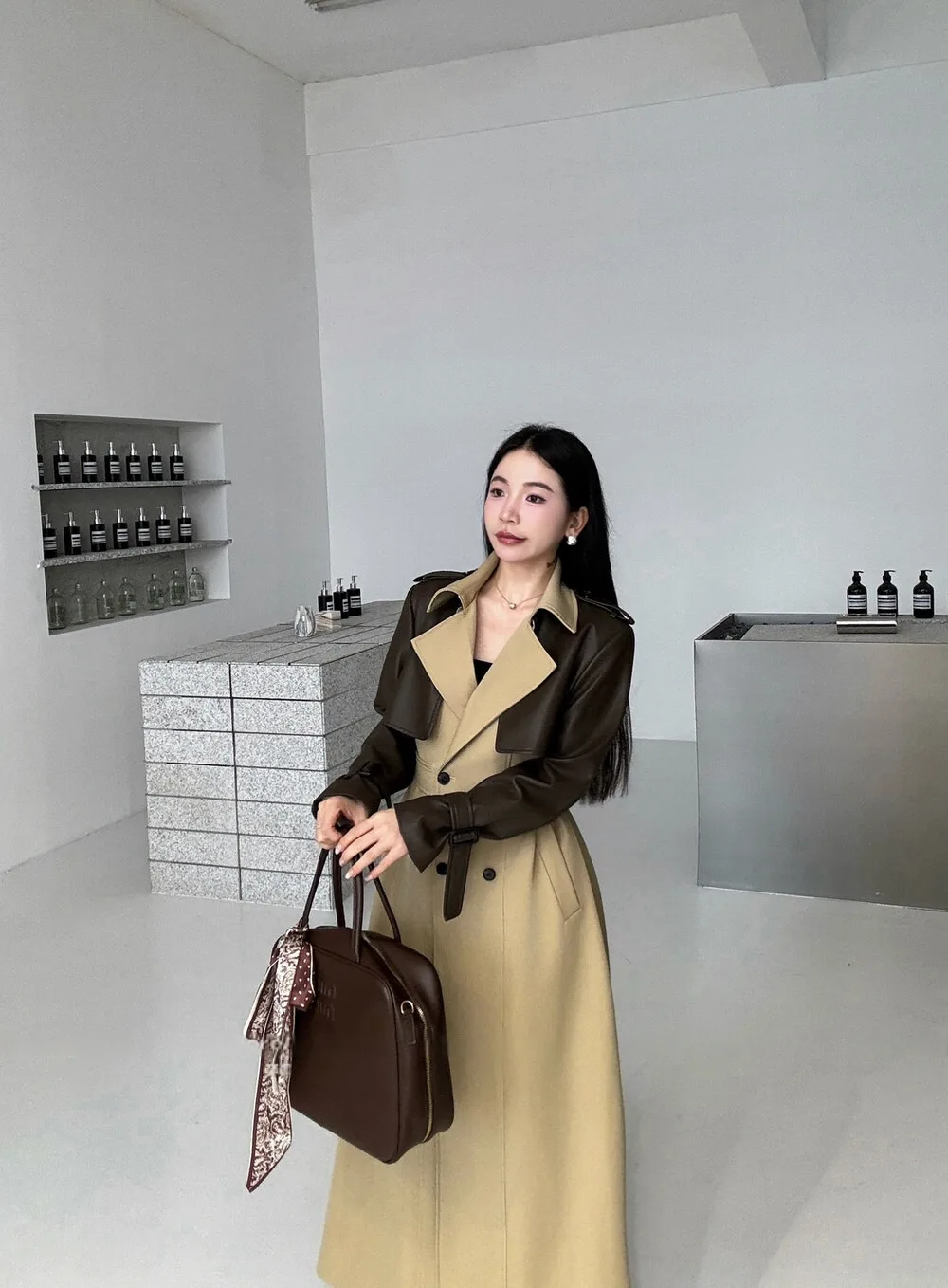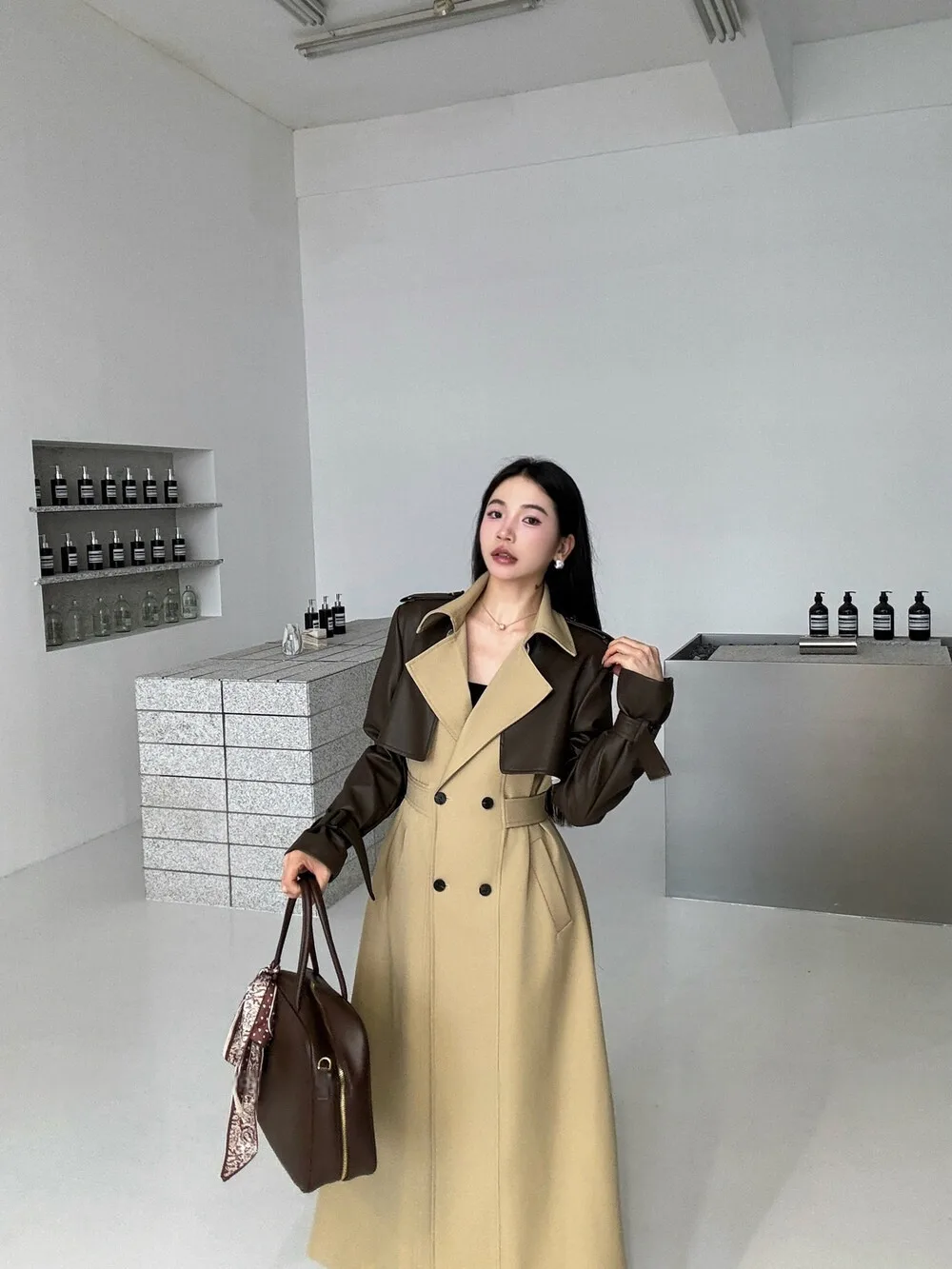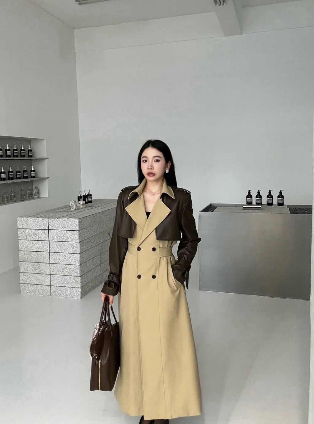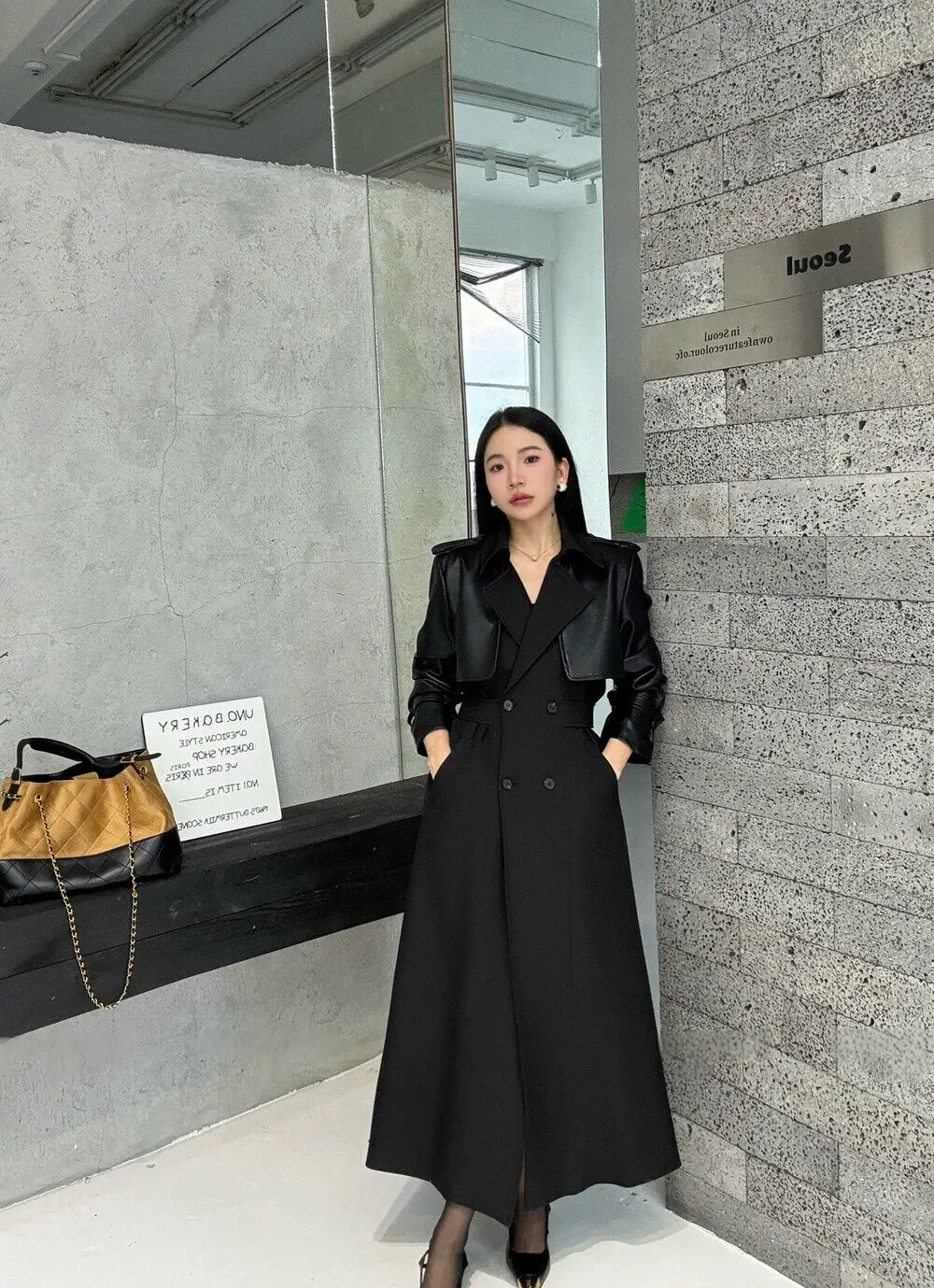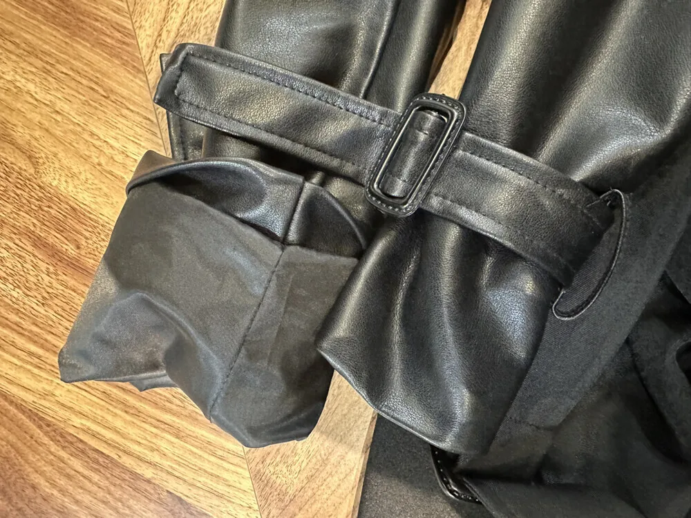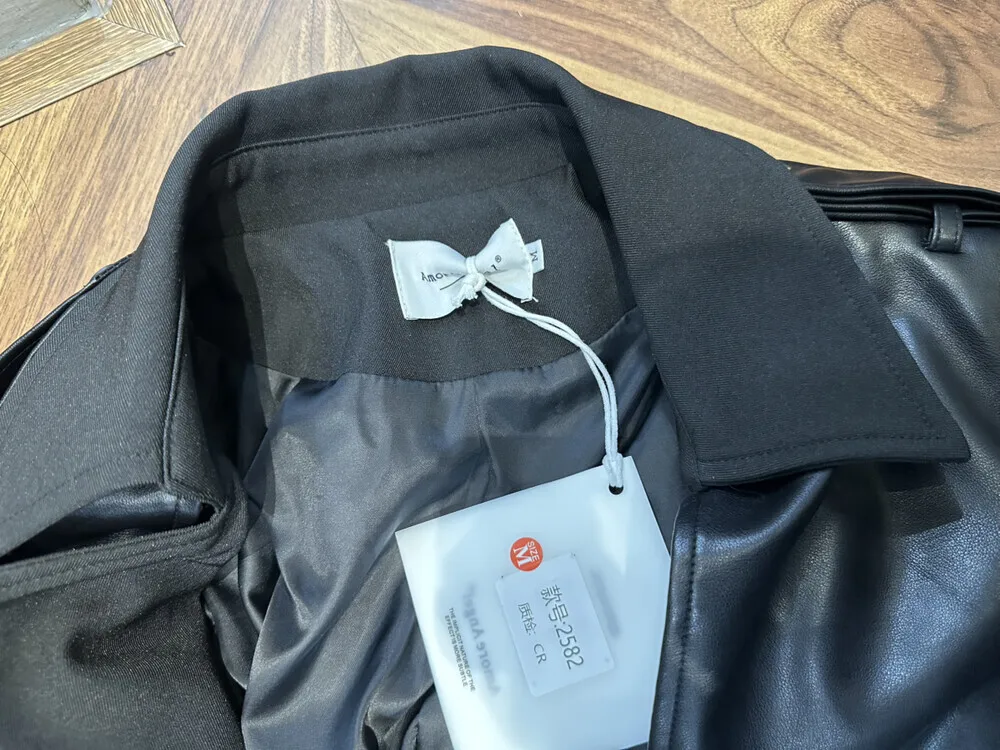 BJTZ 2025 Autunno Inverno Trench in pelle PU da donna Patchwork Color Block Luxury Elegante con cintura doppio petto Capispalla 1BJTZ 2025 Autunno Inverno Trench in pelle PU da donna Patchwork Color Block Luxury Elegante con cintura doppio petto Capispalla
