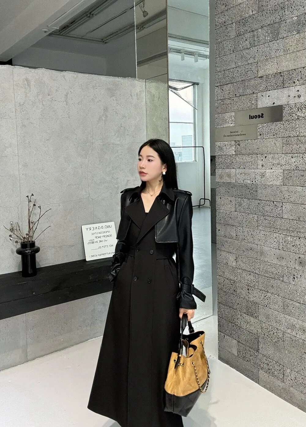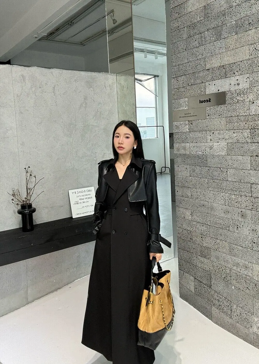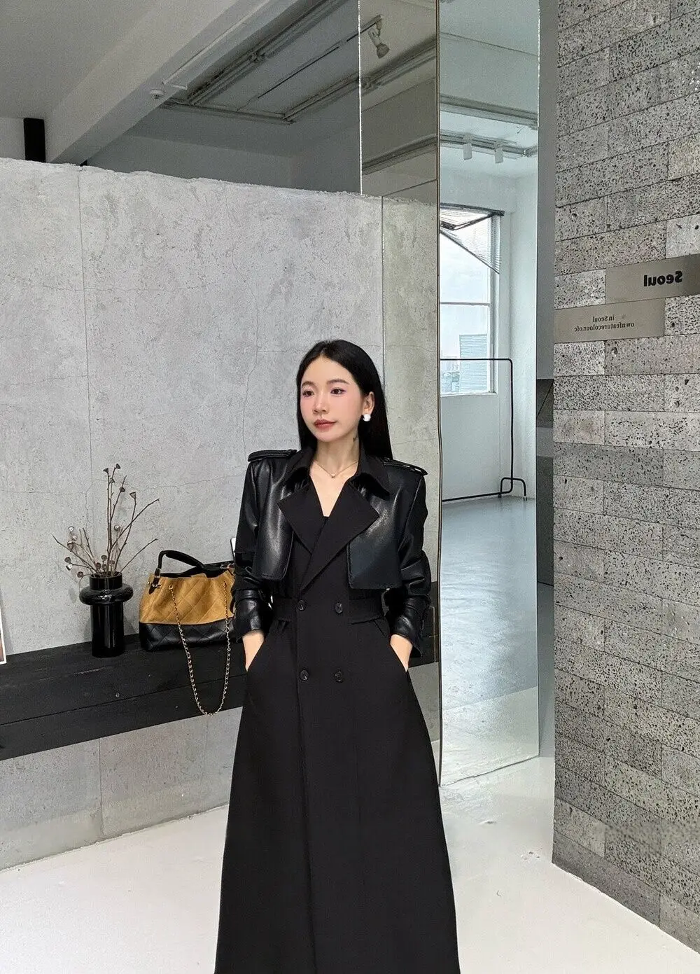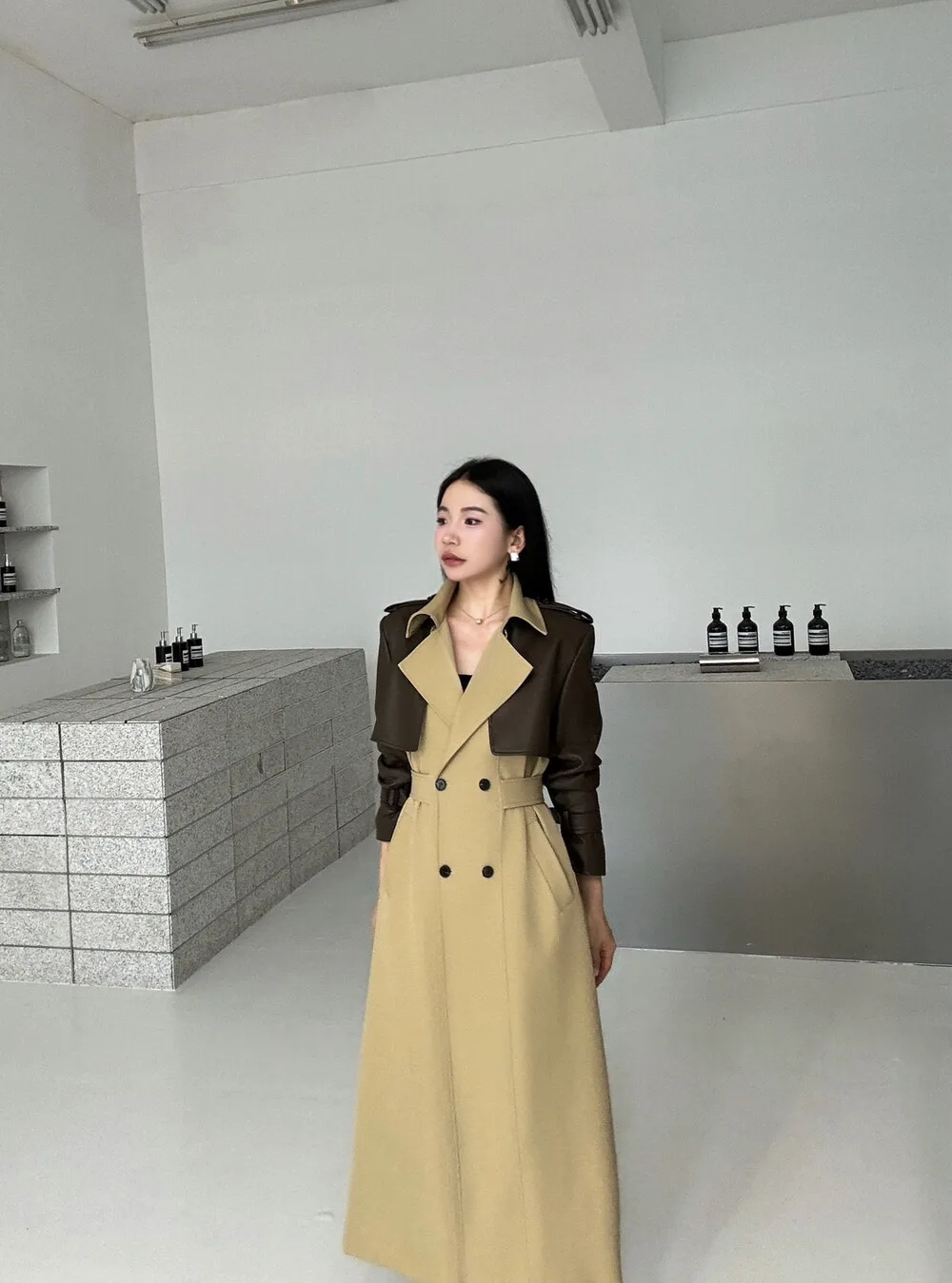 BJTZ 2025 Autunno Inverno Trench in pelle PU da donna Patchwork Color Block Luxury Elegante con cintura doppio petto Capispalla 1BJTZ 2025 Autunno Inverno Trench in pelle PU da donna Patchwork Color Block Luxury Elegante con cintura doppio petto Capispalla