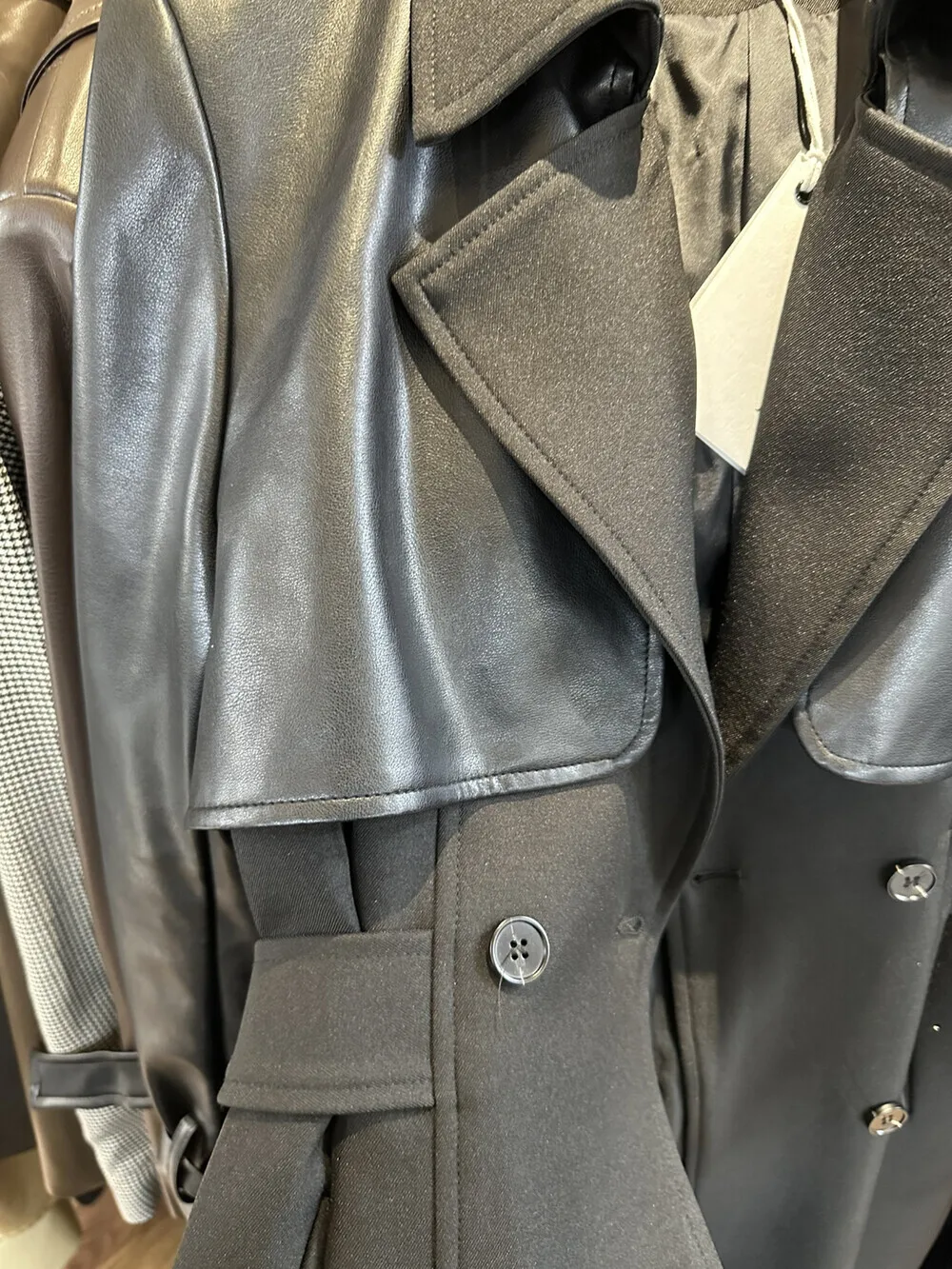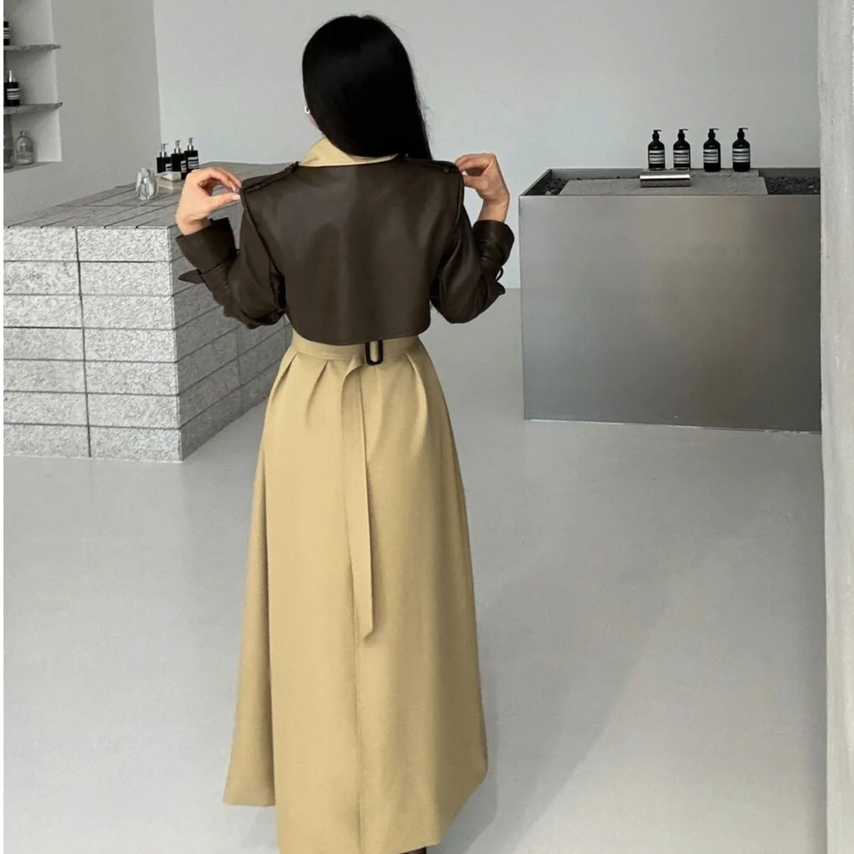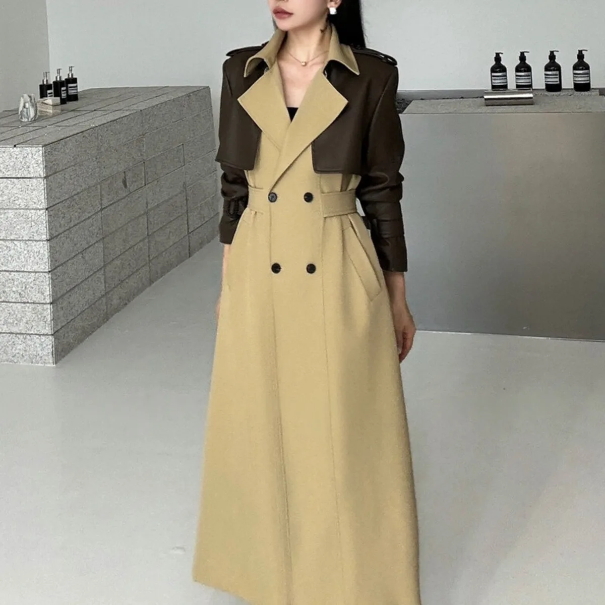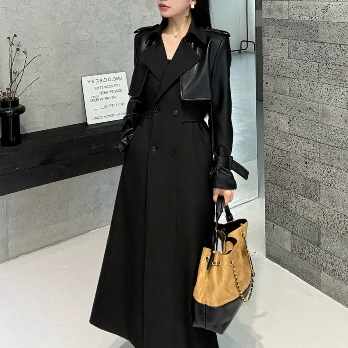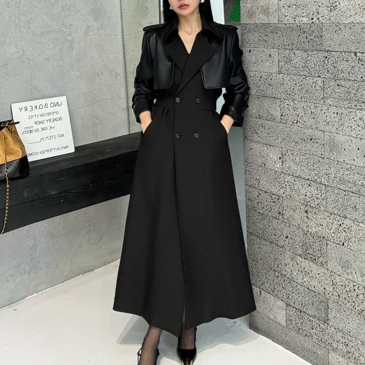 BJTZ 2025 Autunno Inverno Trench in pelle PU da donna Patchwork Color Block Luxury Elegante con cintura doppio petto Capispalla 1BJTZ 2025 Autunno Inverno Trench in pelle PU da donna Patchwork Color Block Luxury Elegante con cintura doppio petto Capispalla