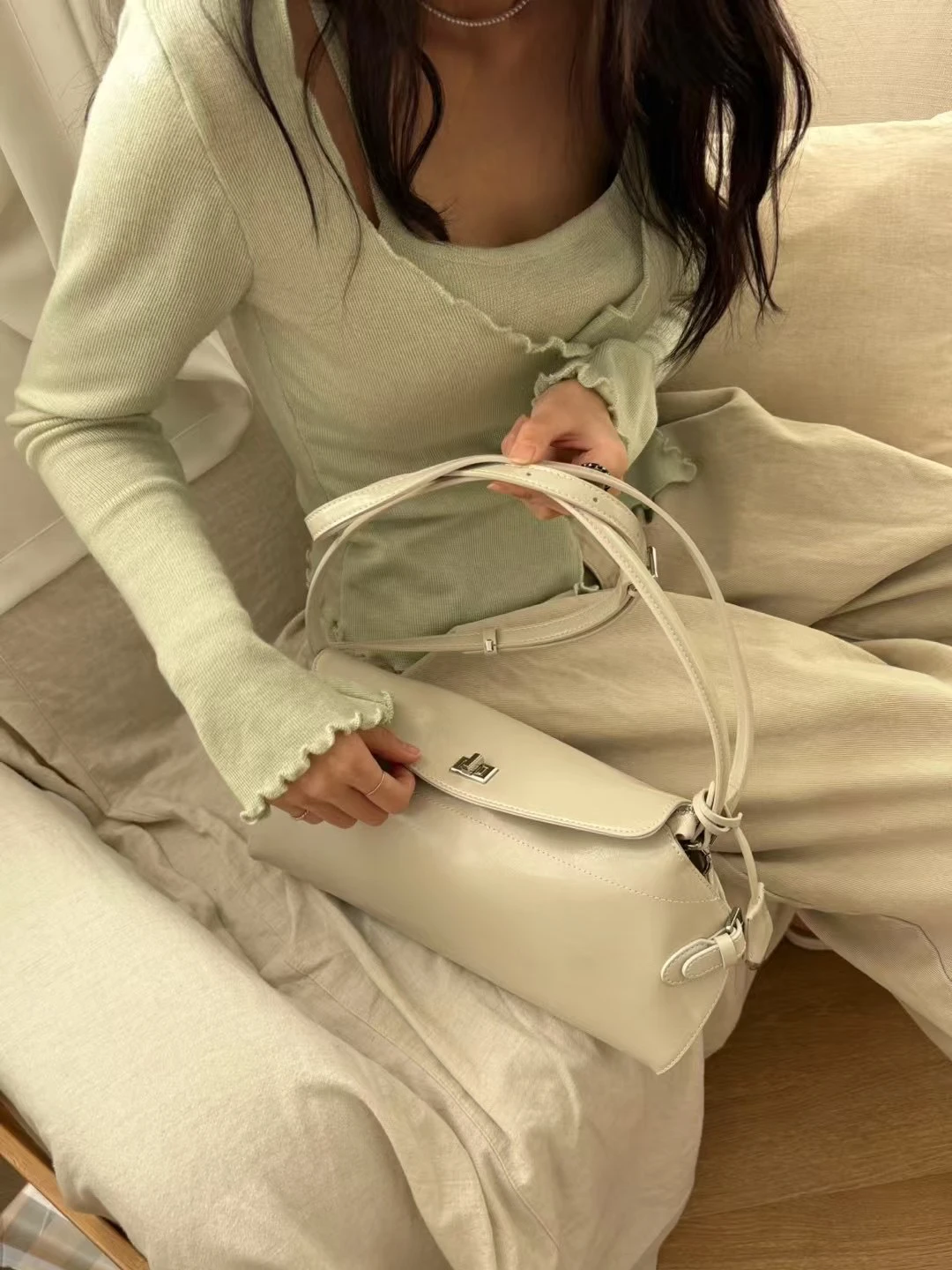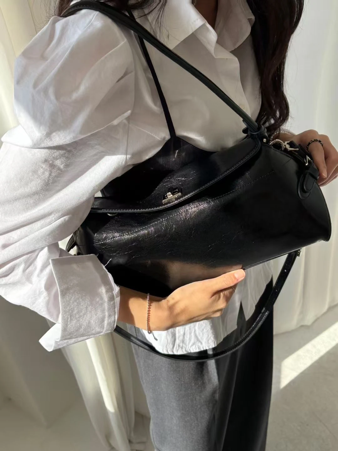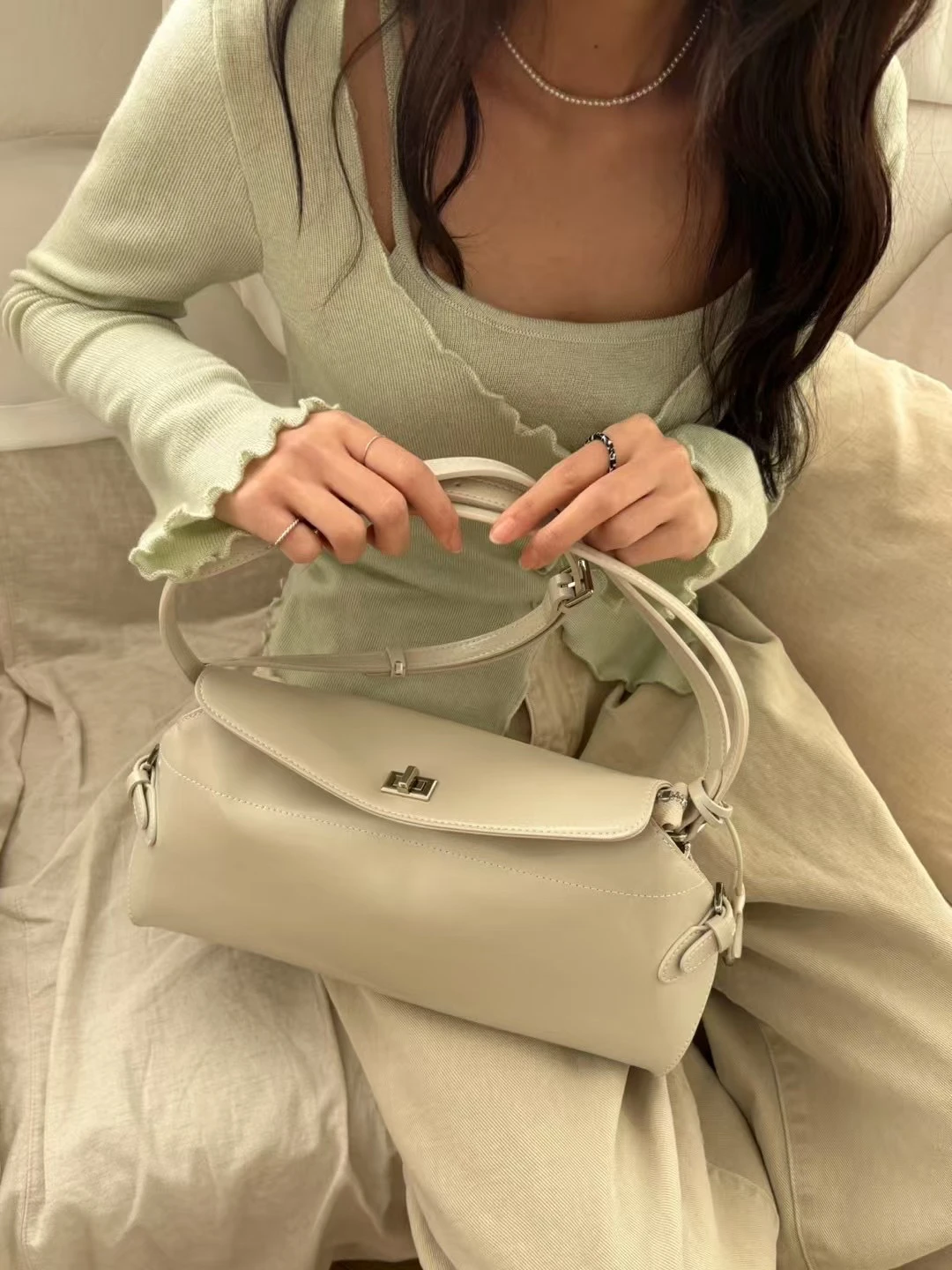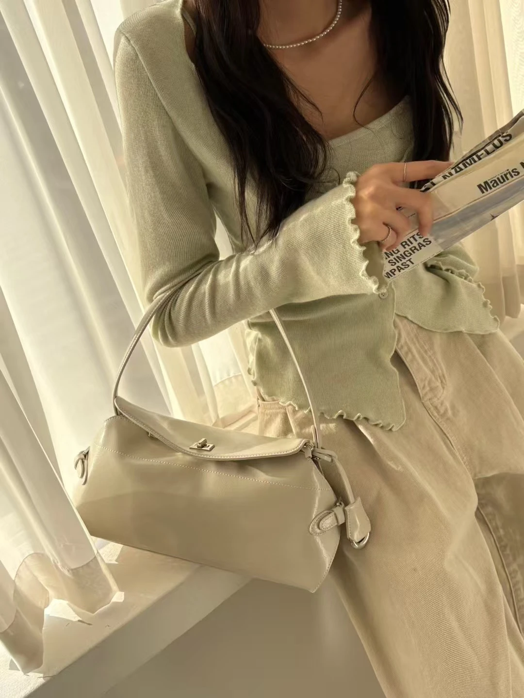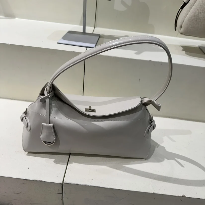 Borsa da bowling da donna in vera pelle di mucca grigio chiaro con manico lungo lucido stile francese euro Borsa da ufficio Commter