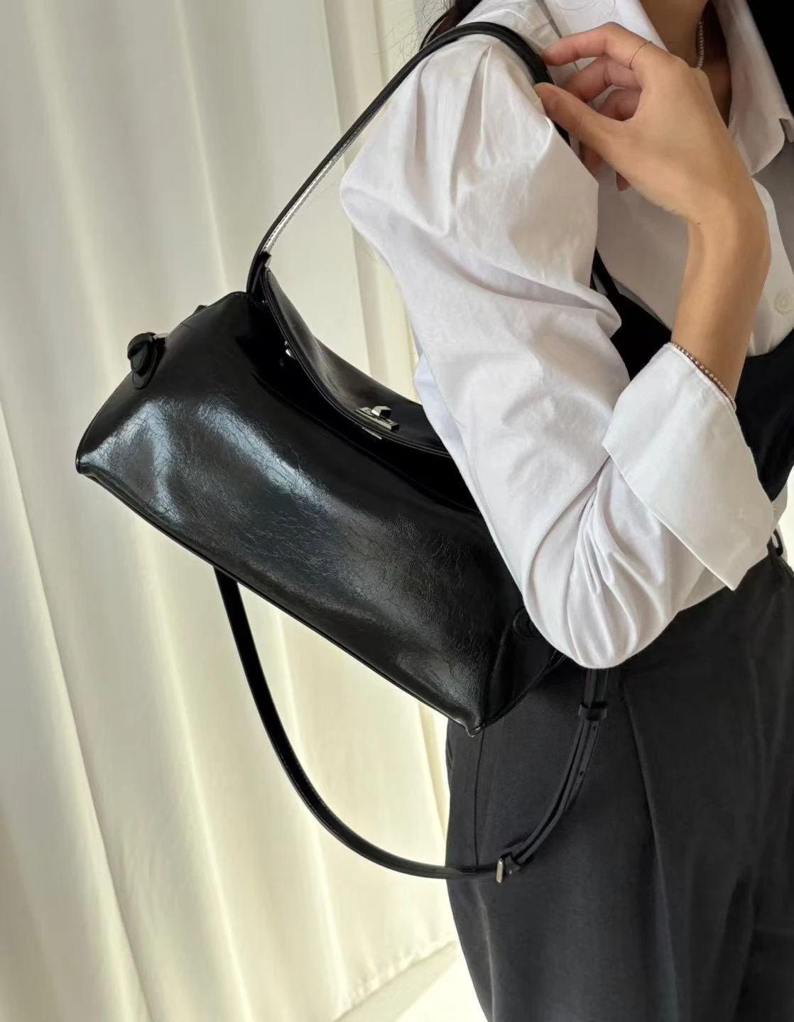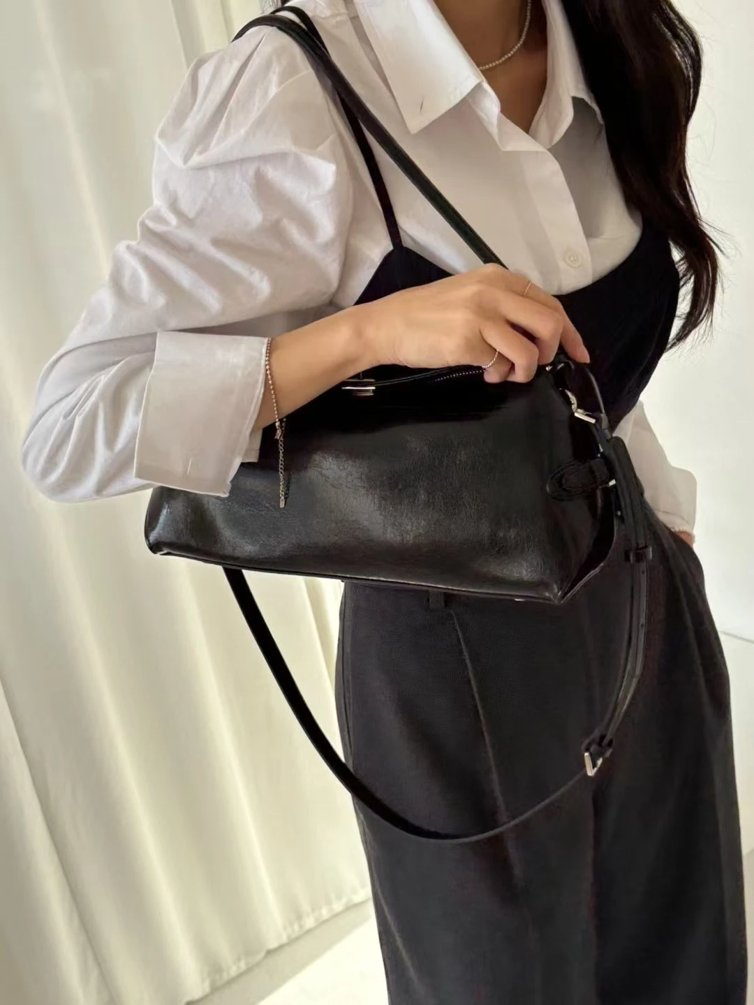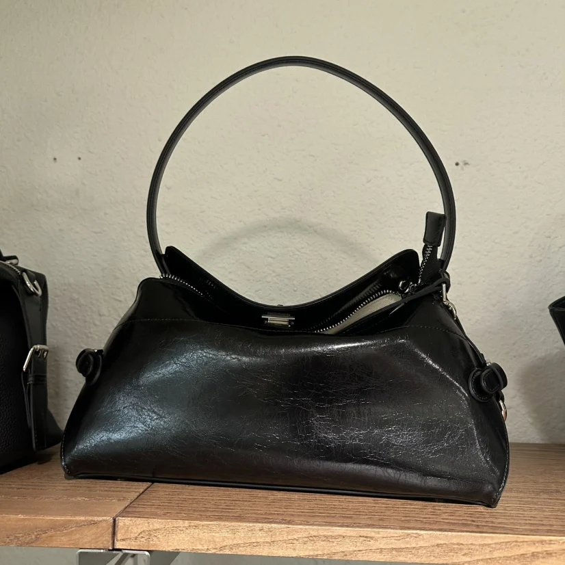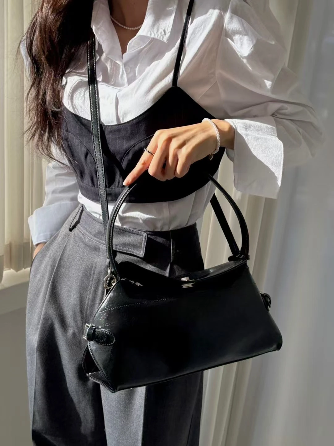 Borsa da bowling da donna in vera pelle di mucca grigio chiaro con manico lungo lucido stile francese euro Borsa da ufficio Commter