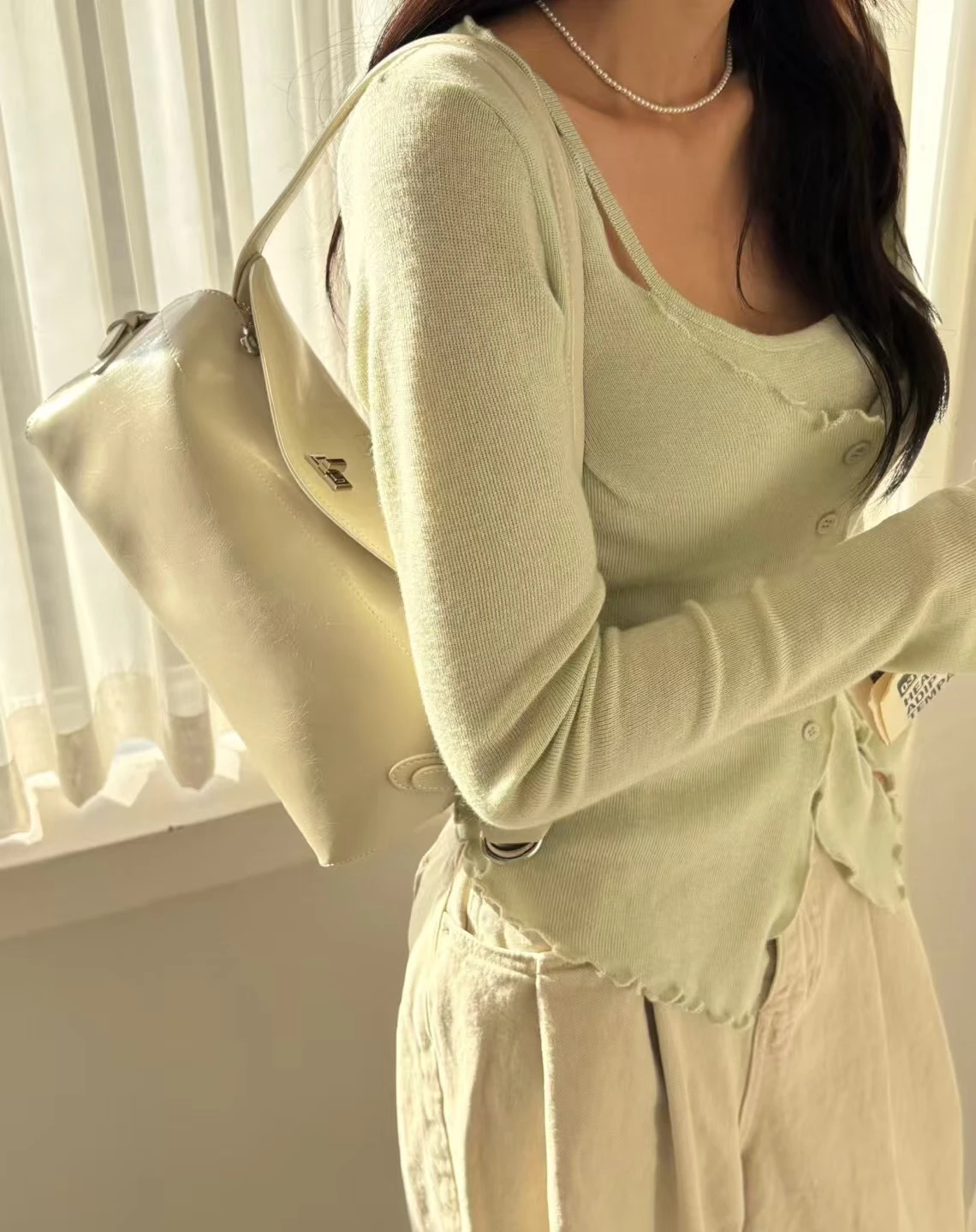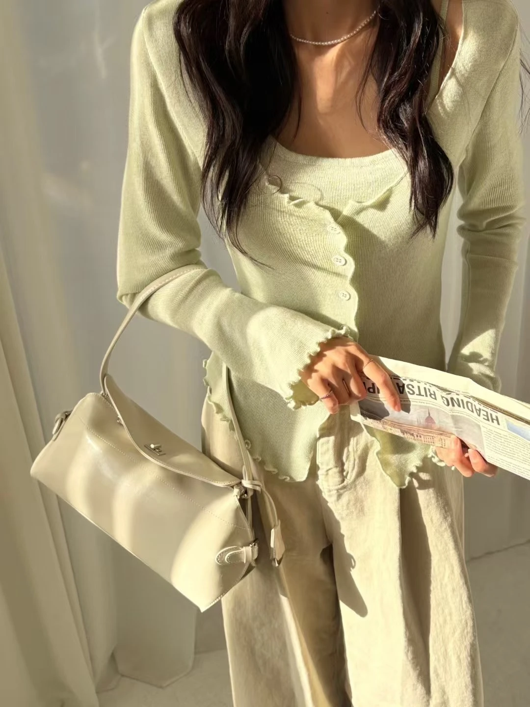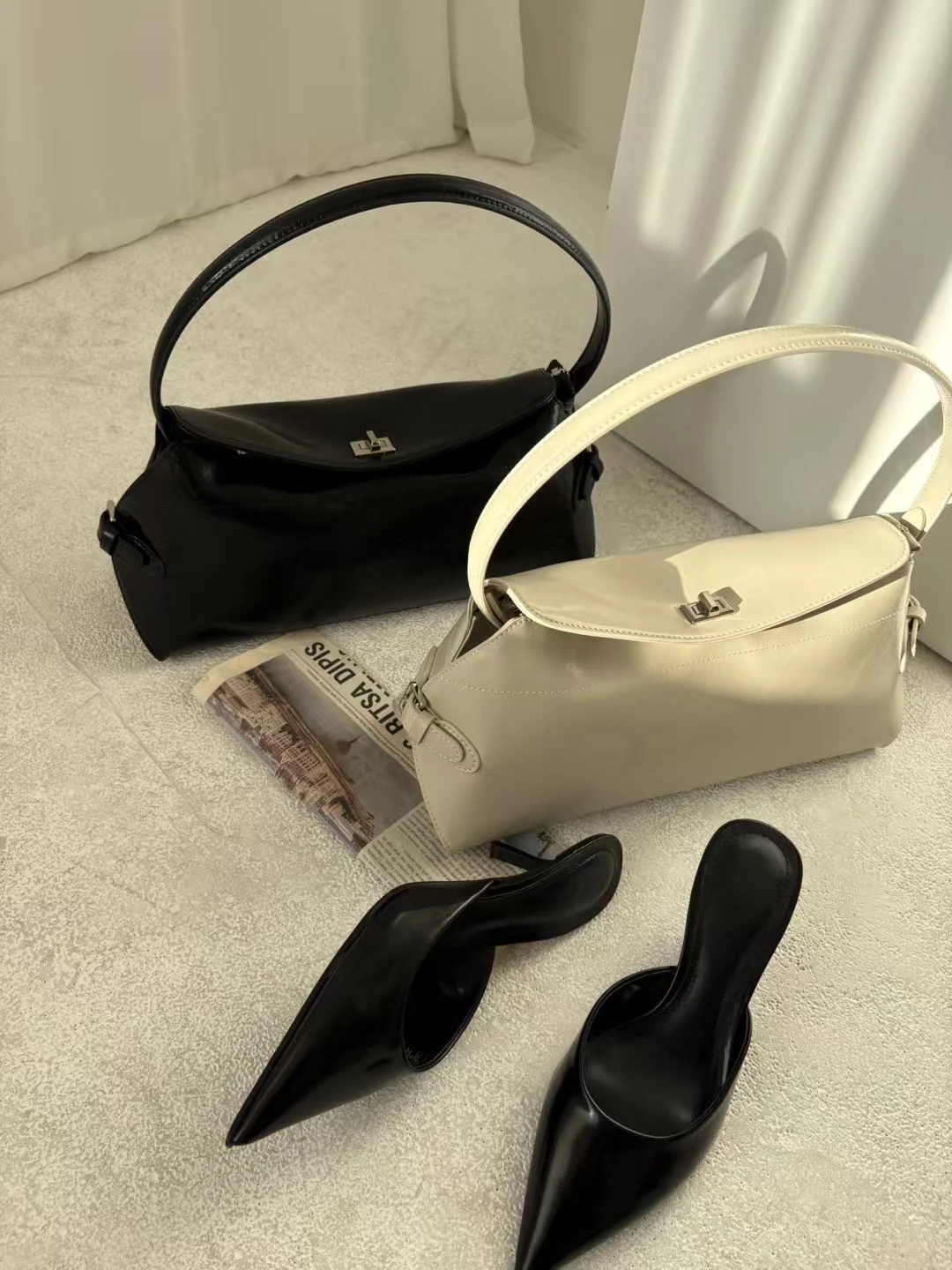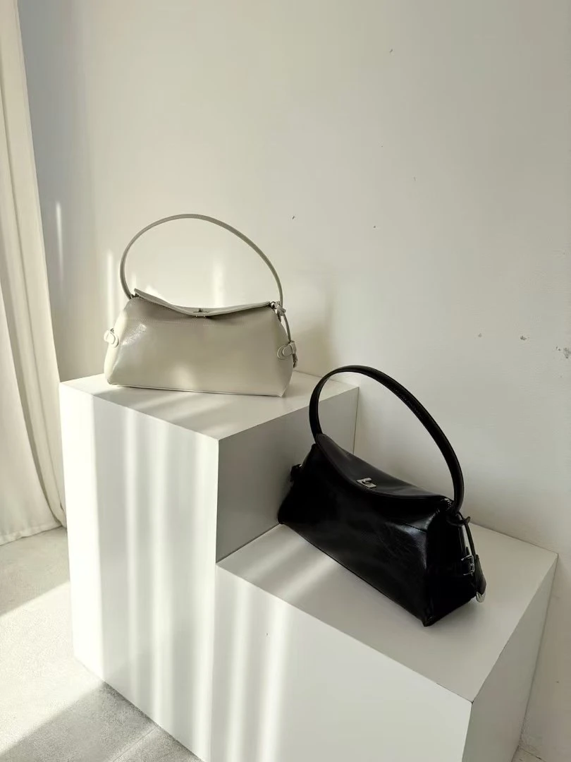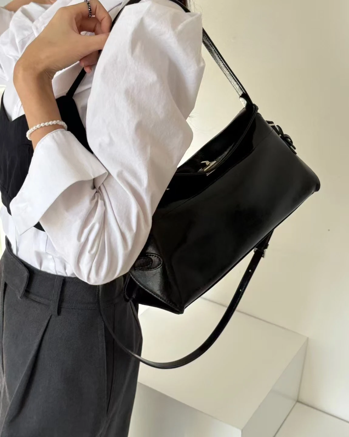 Borsa da bowling da donna in vera pelle di mucca grigio chiaro con manico lungo lucido stile francese euro Borsa da ufficio Commter