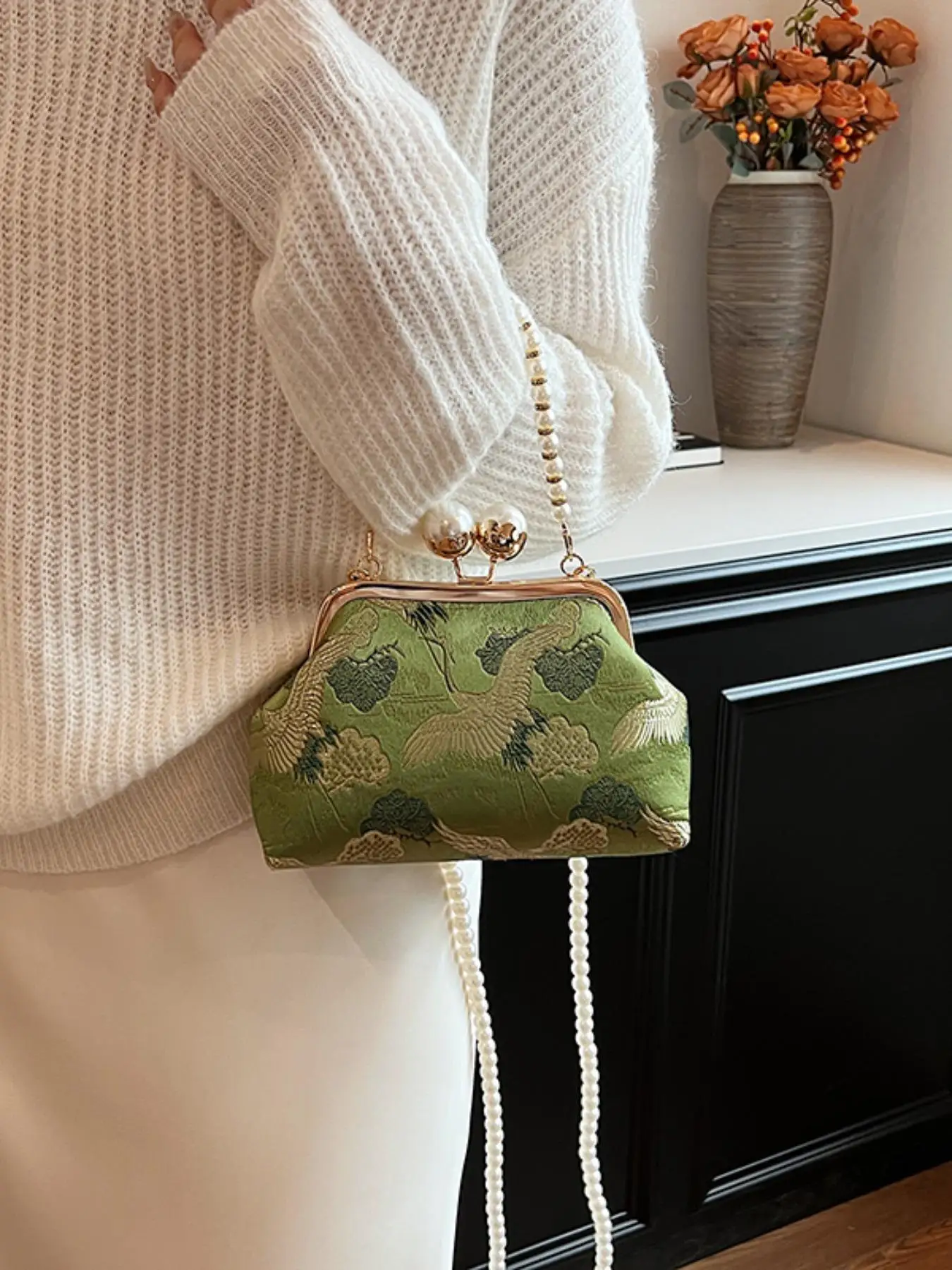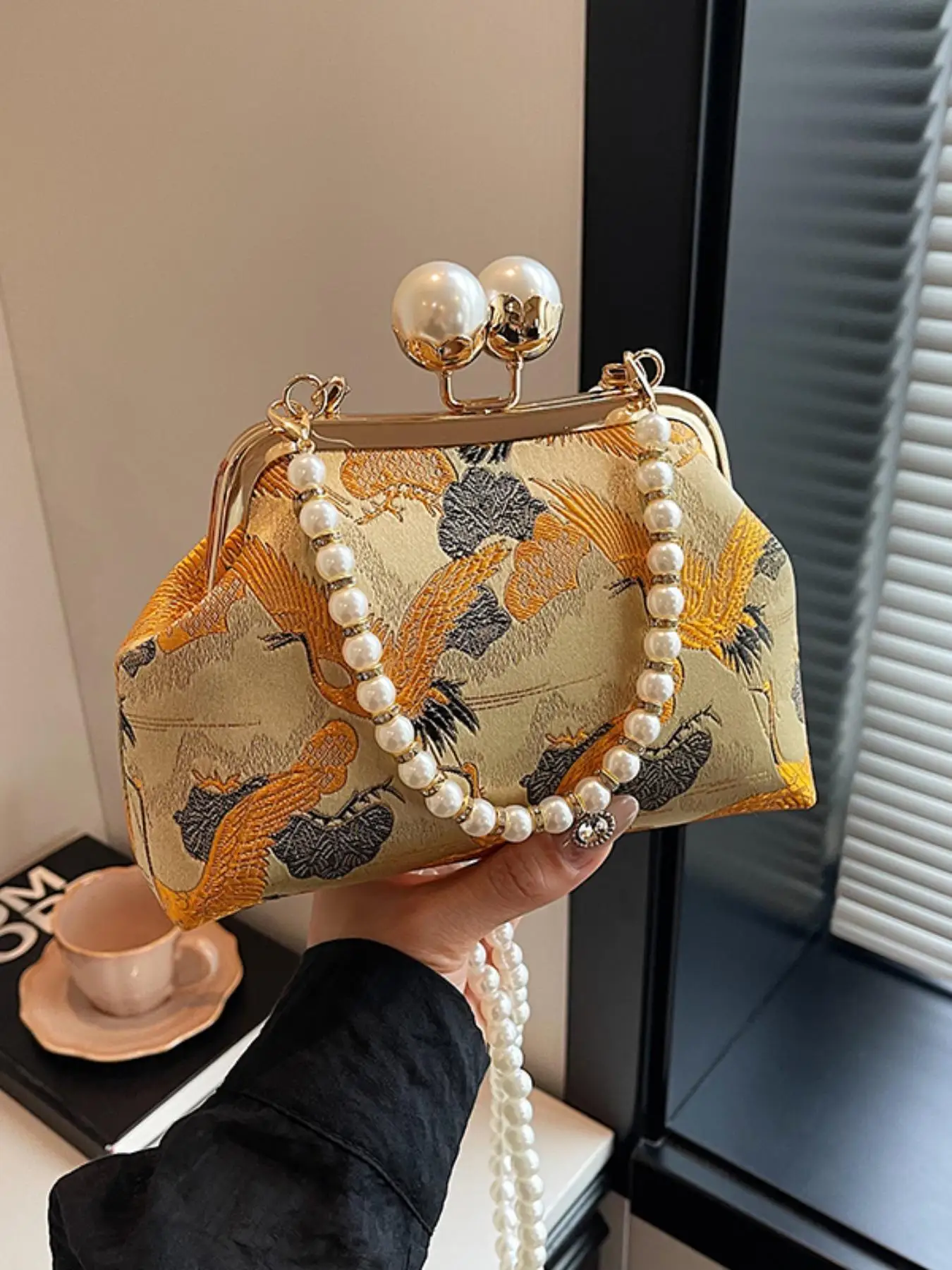 3 recensioni per Borsa da sera cinese alla moda e con clip con stampa floreale a contrasto, semplice catena di perle, elegante borsa a tracolla